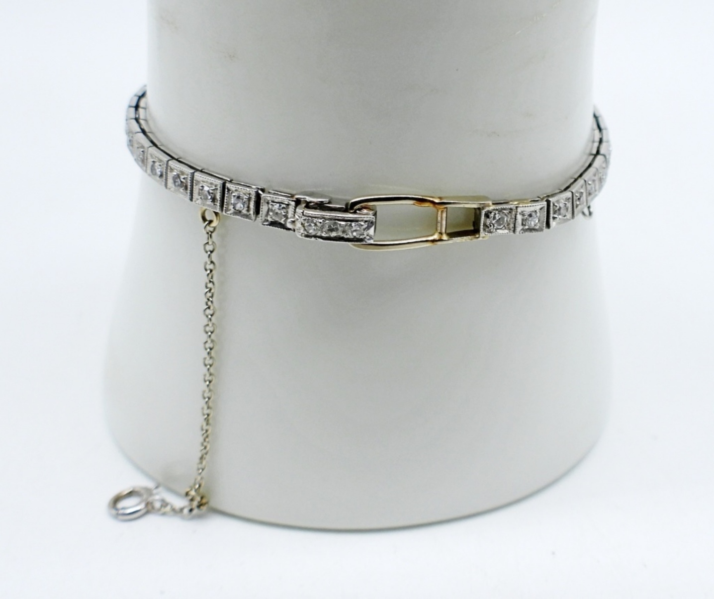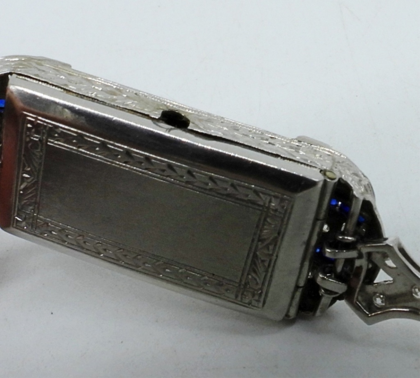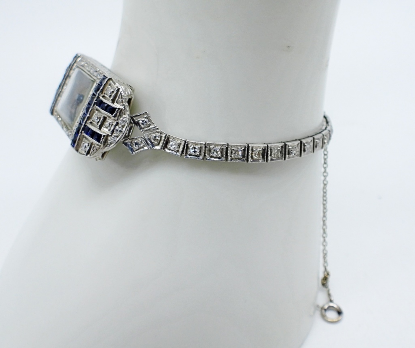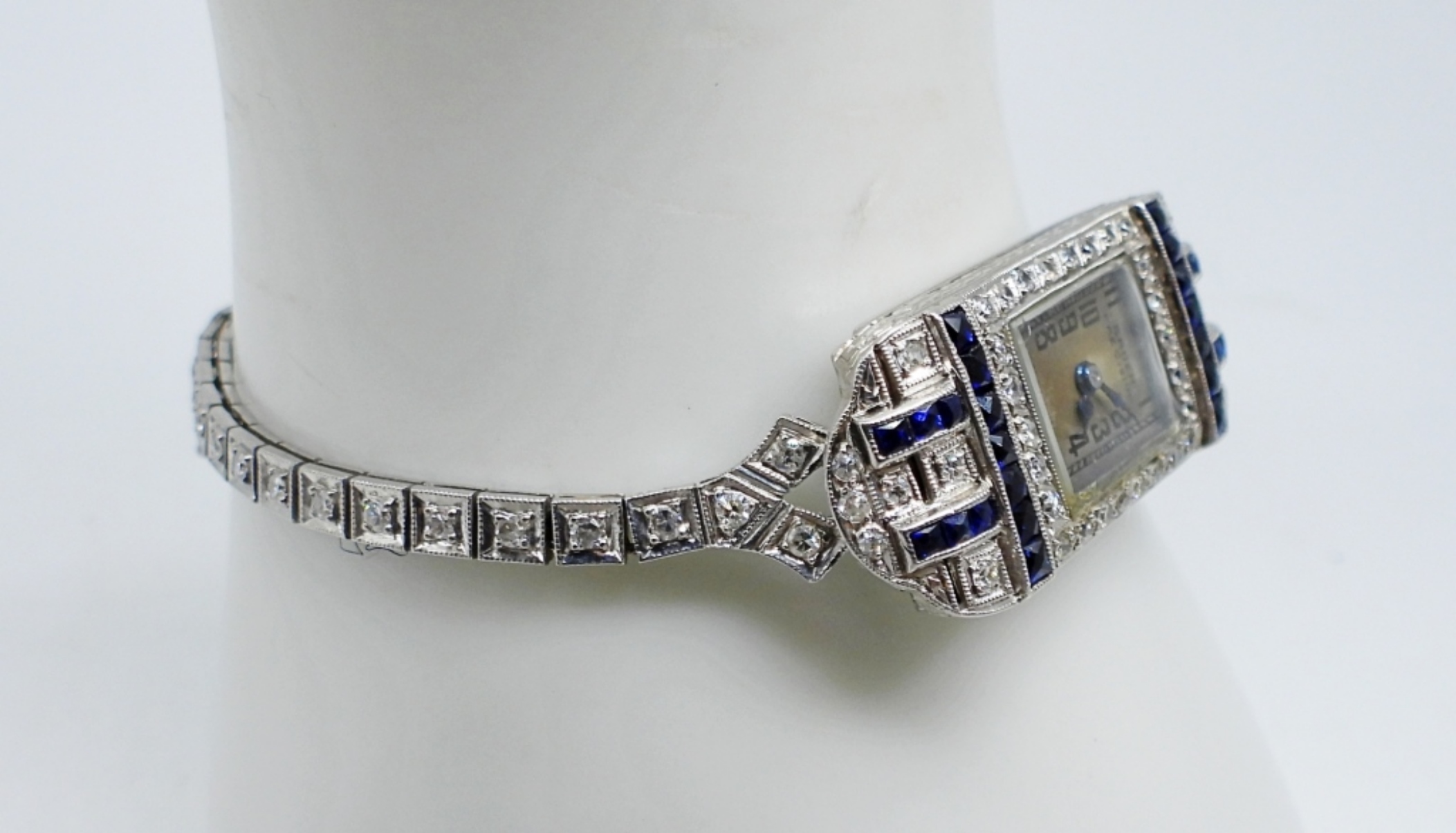 GRUEN ANTIQUE STERLING WATCH WITH DIAMONDS (TESTED) AND SAPPHIRES. THE CROWN IS MISSING / BROKEN. CLASP BROKEN. SOME DISCOLORATION ON THE FACE. 6″ LONG. VERY BEAUTIFUL WATCH! (12.7 DWT)