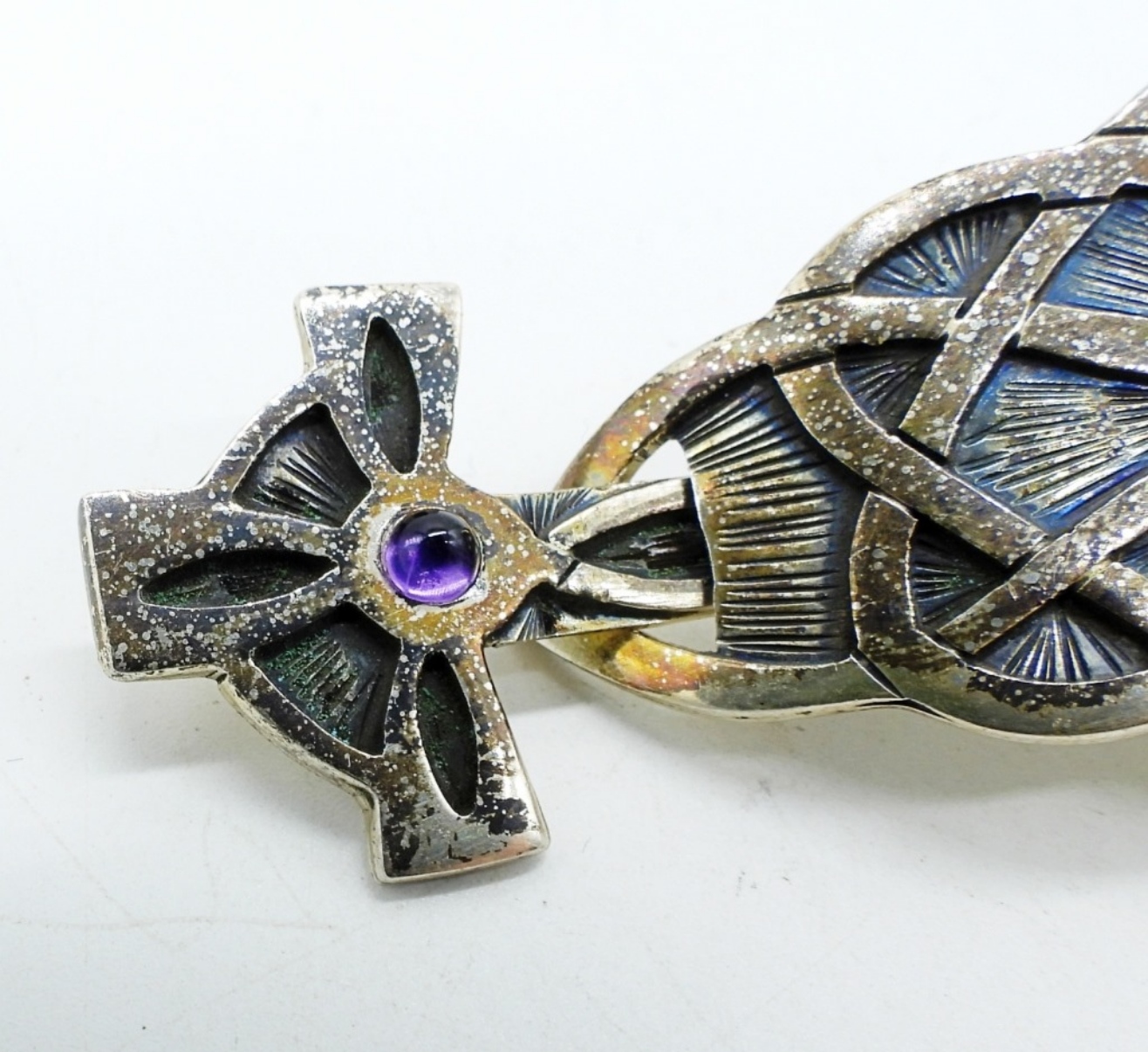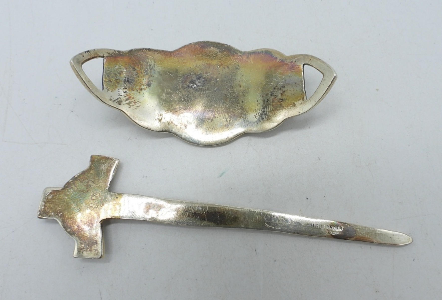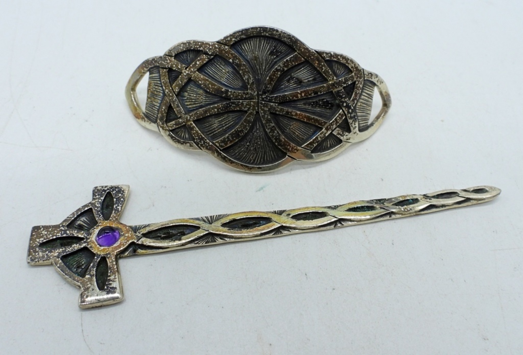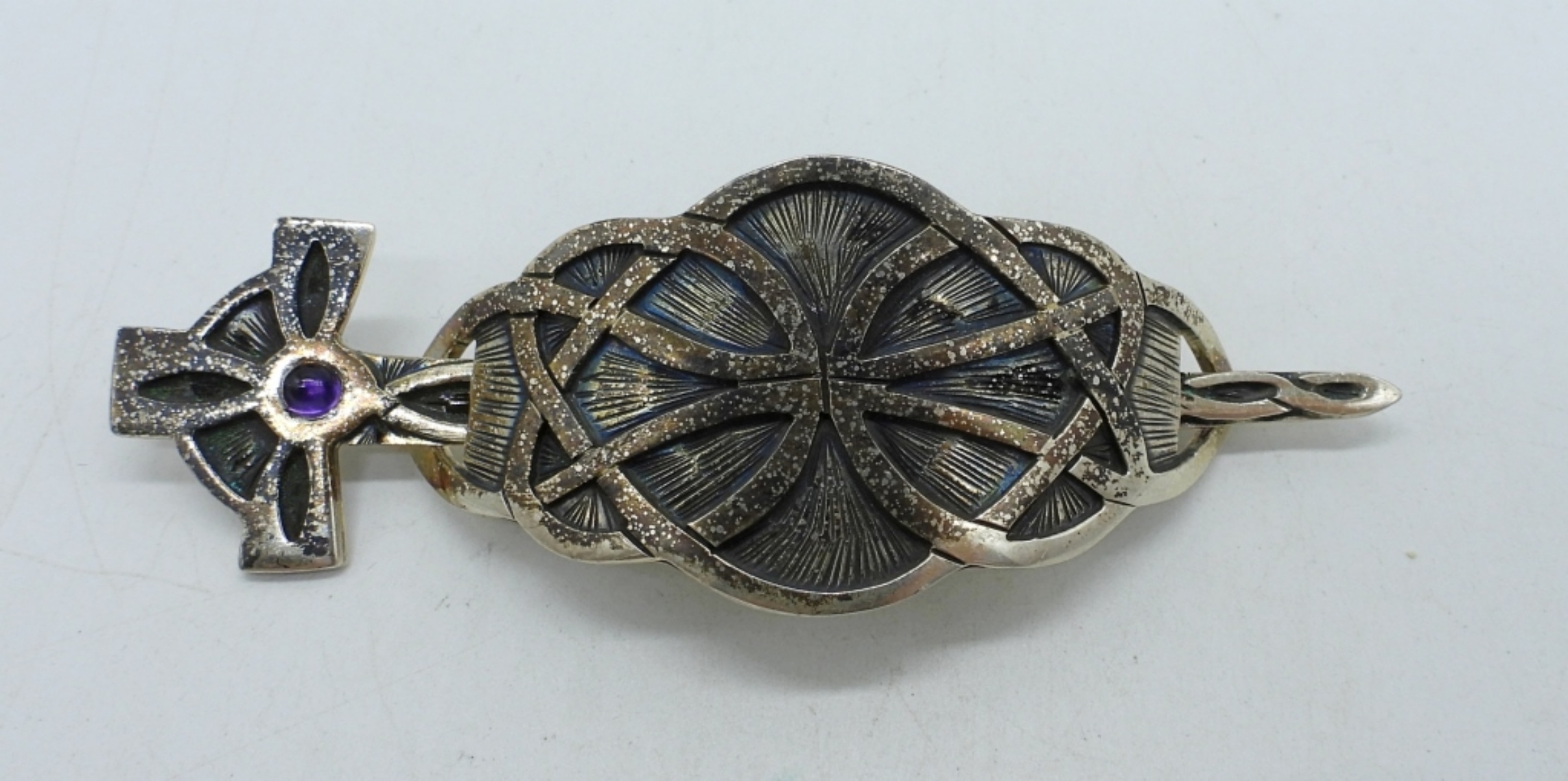 “HIGHLANDER STERLING” MARKINGS, CELTIC SWORD HAIR PIN WITH SMALL PURPLE GEM. 4″ LONG. (15 DWT)