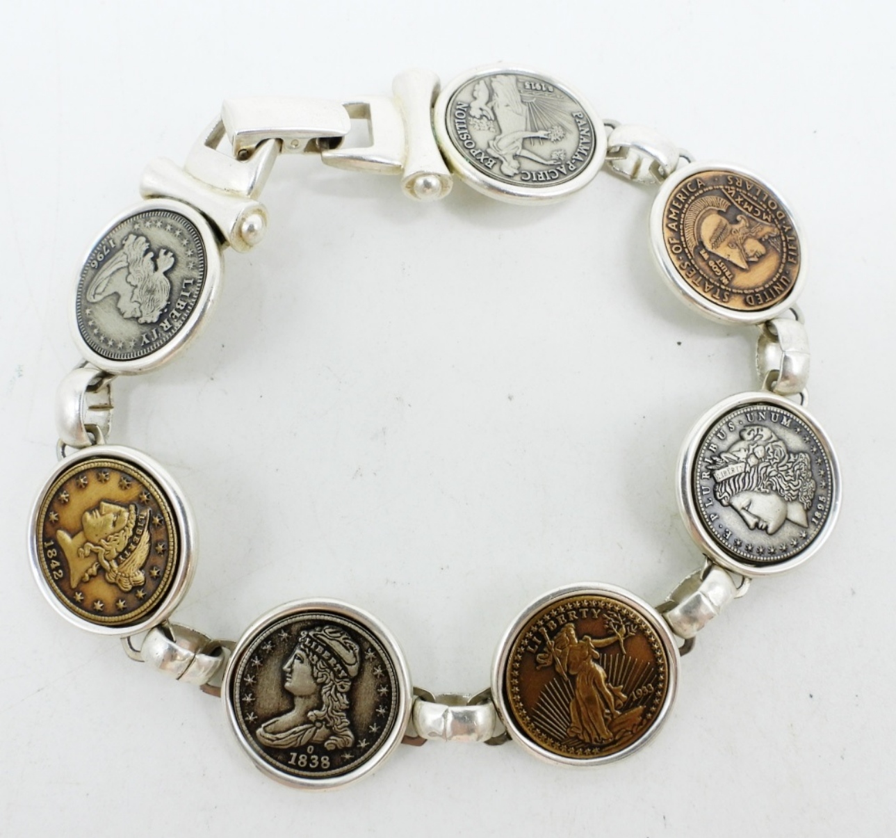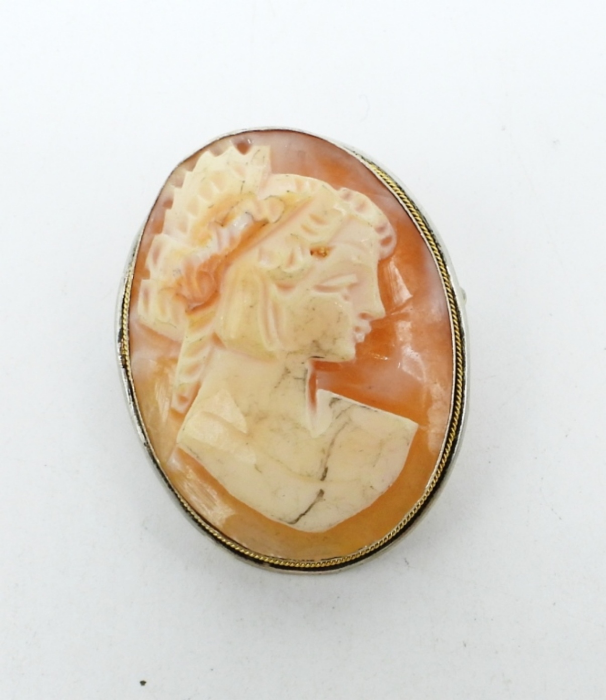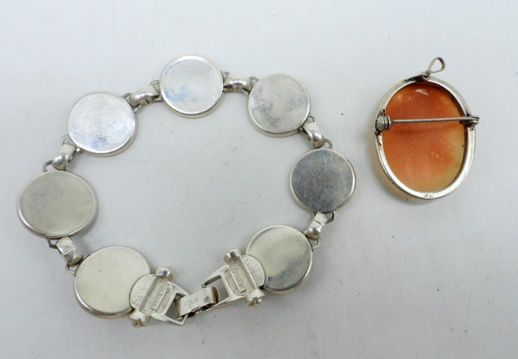 VINTAGE STERLING CAMEO BROOCH / PENDANT 1.5″. STERLING COIN BRACELET, 8″. (23.4 DWT)