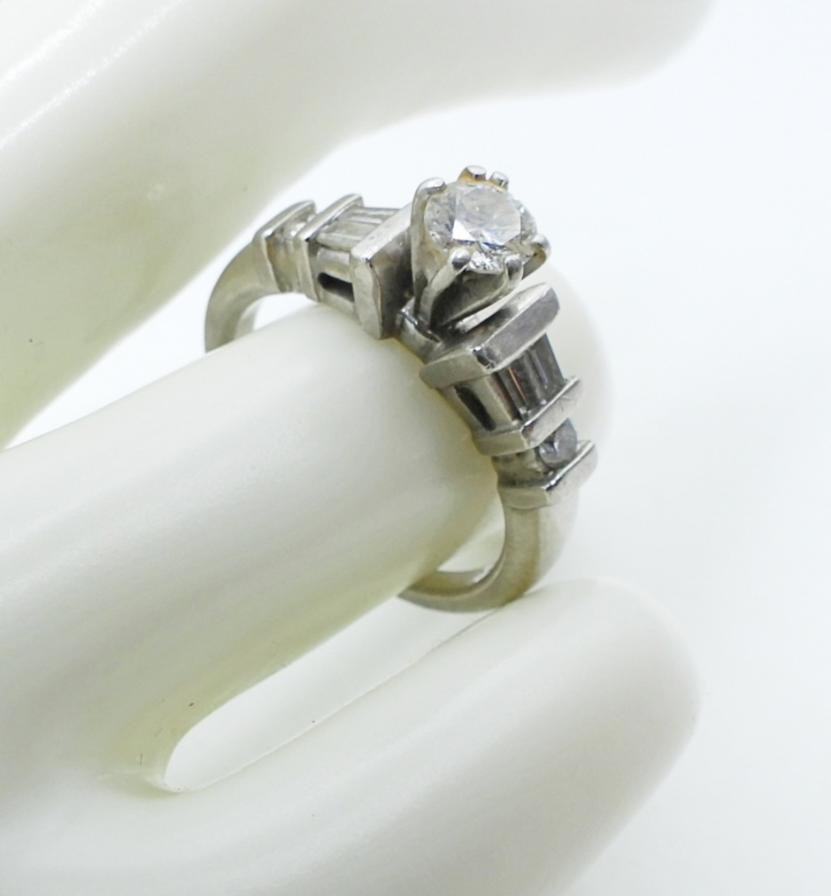 PLATINUM & DIAMOND (TESTED) ENGAGEMENT RING, SIZE 6 3/4. PRONG ON THE MAIN DIAMOND NEED TO BE FIXED!! CENTER STONE IS 1/2 CARAT. (4.9 DWT)