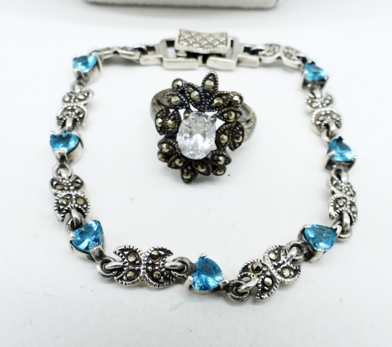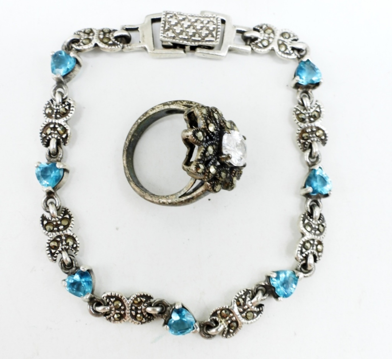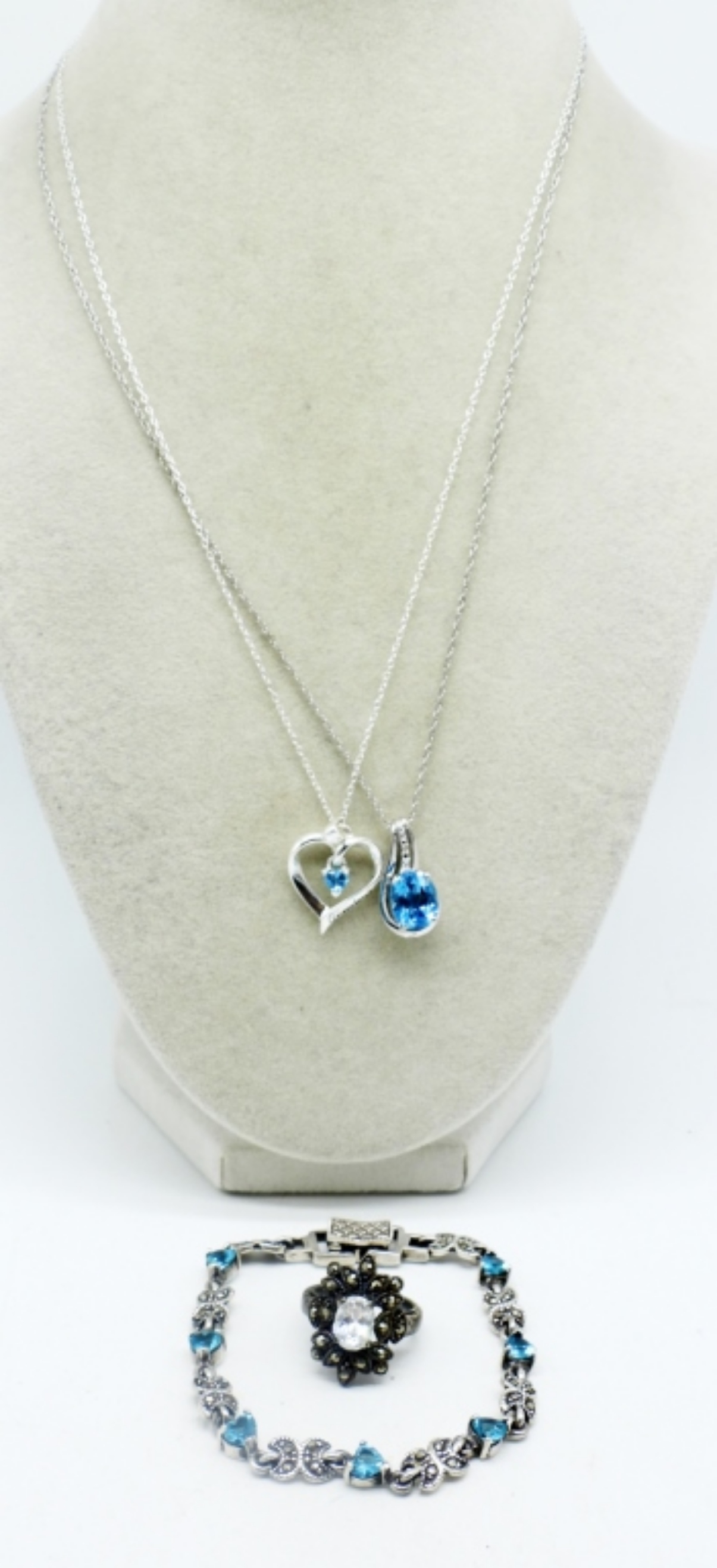 FOUR STERLING PIECES, TWO NECKLACES WITH BLUE TOPAZ, 18″. BLUE TOPAZ & MARCASITE 7″. RING SIZE 5 (15 DWT)