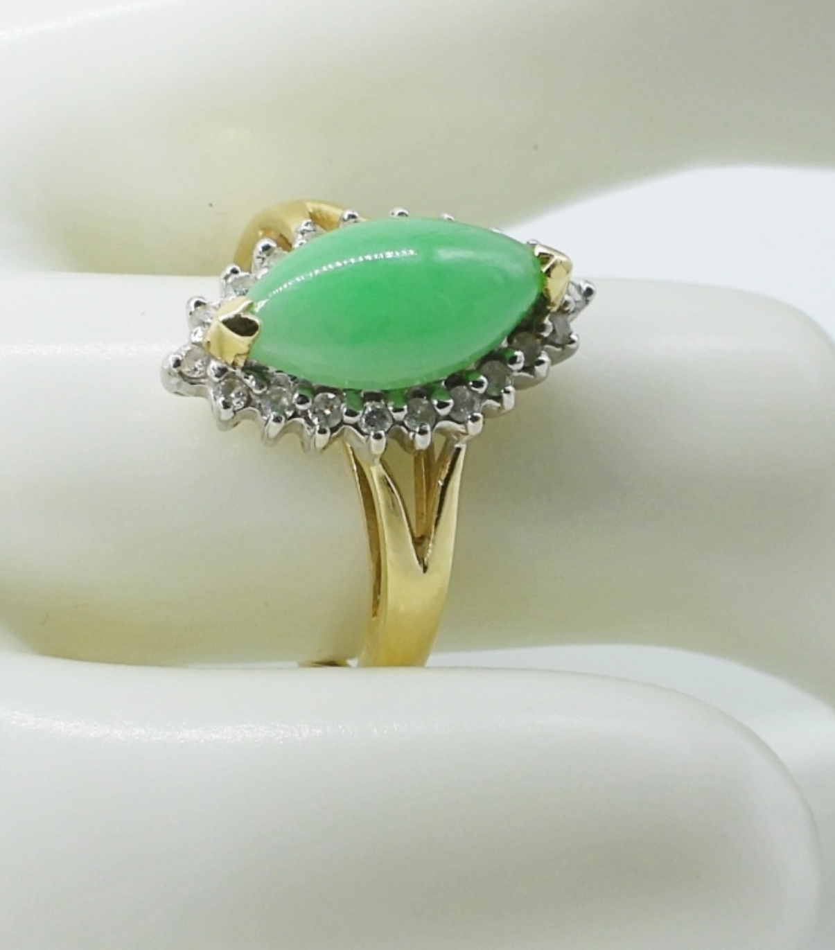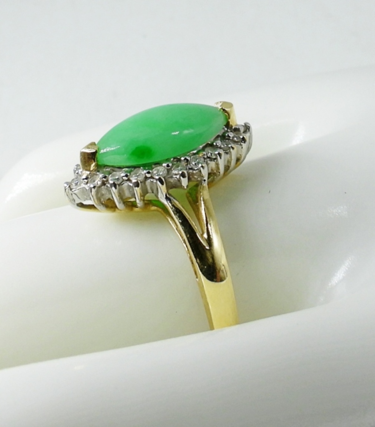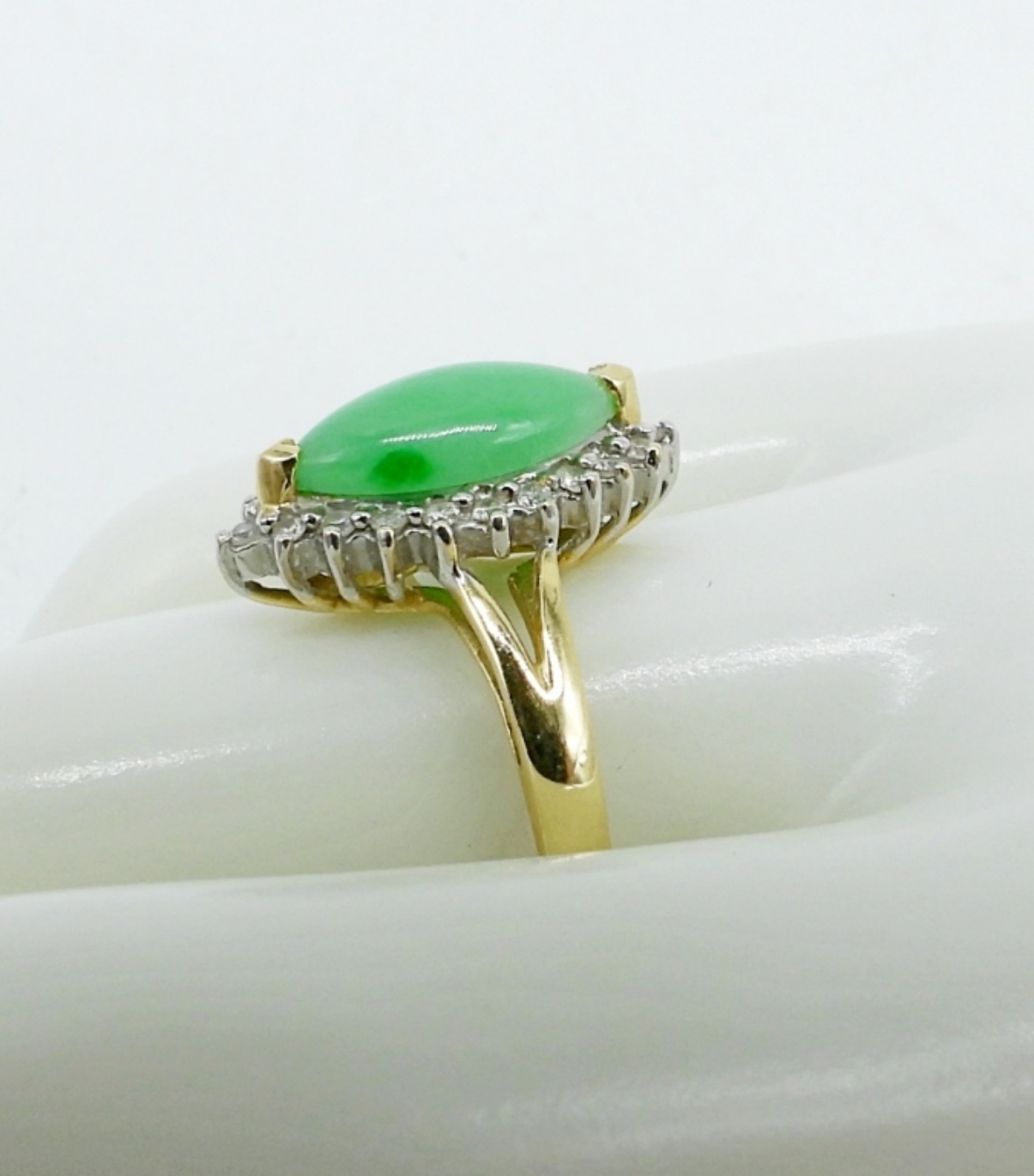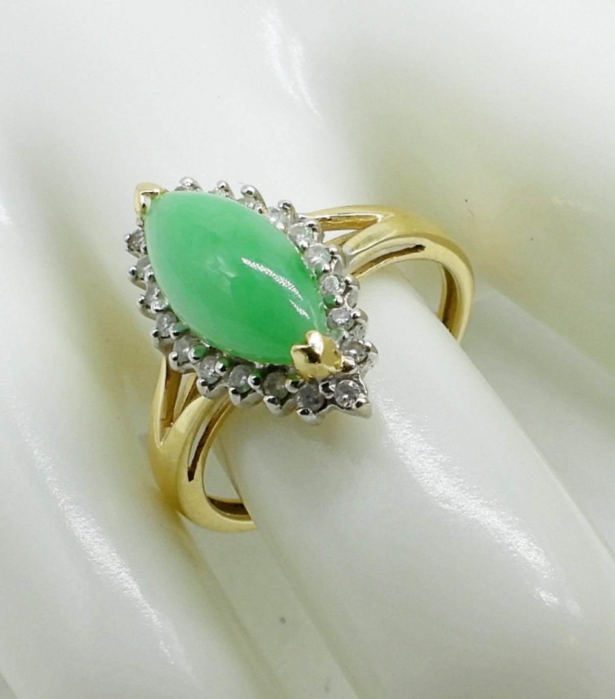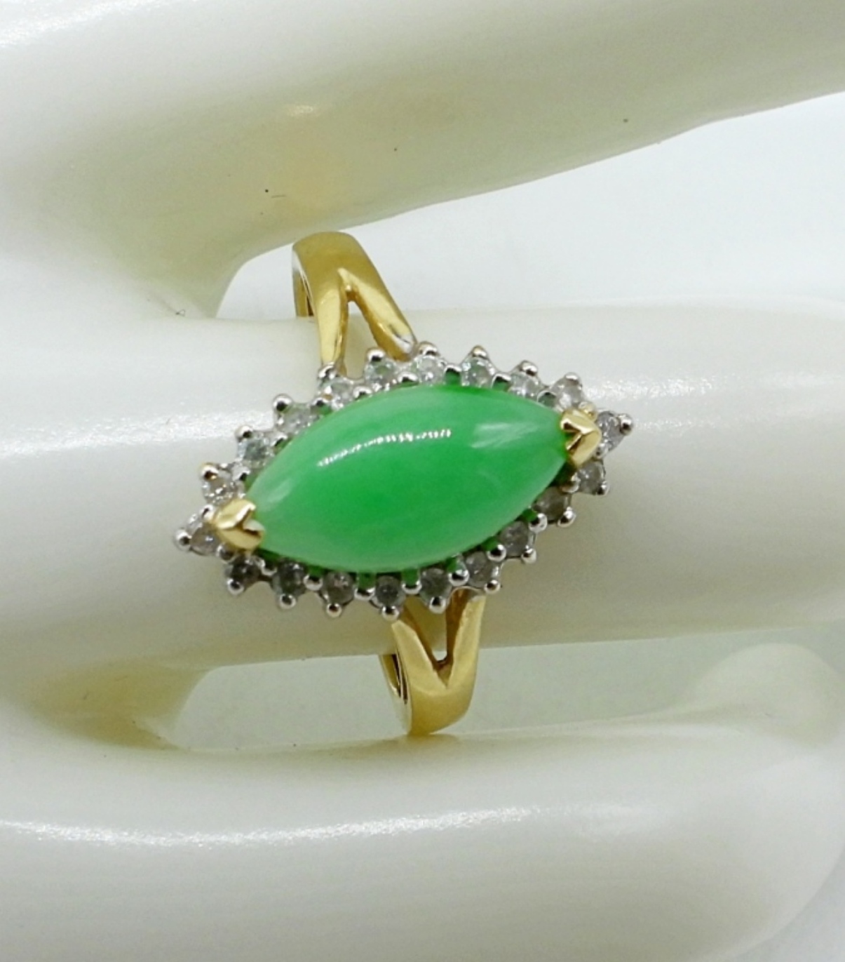 14K YELLOW GOLD, MARQUISE CUT NATURAL GREEN JADEITE WITH A DIAMOND HALO. SIZE 7. (2.1 DWT)