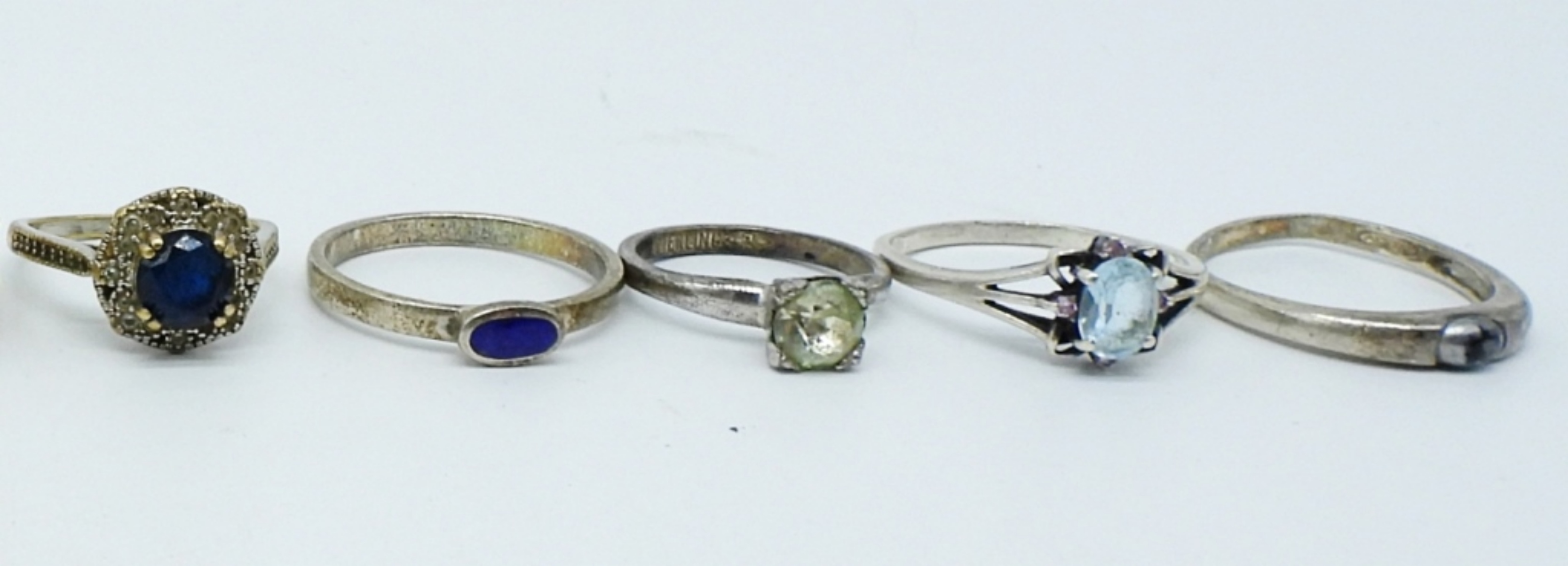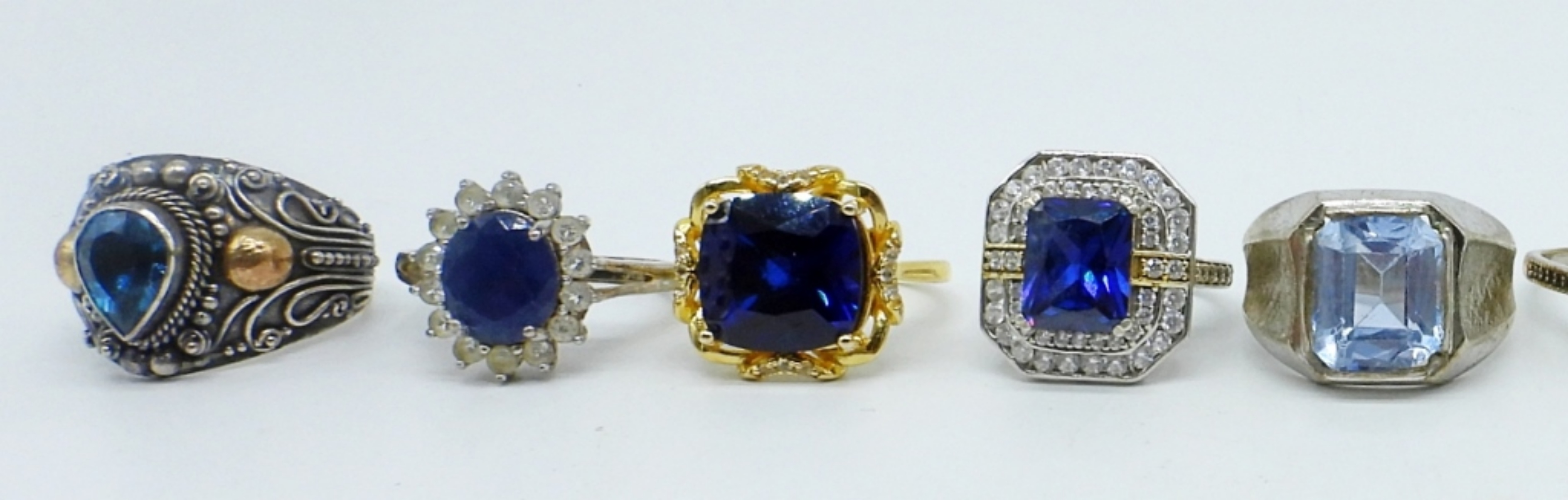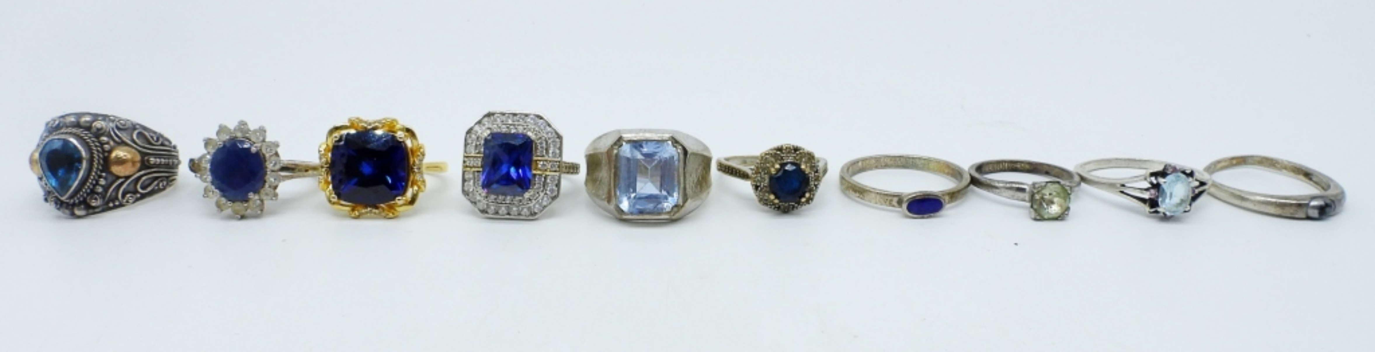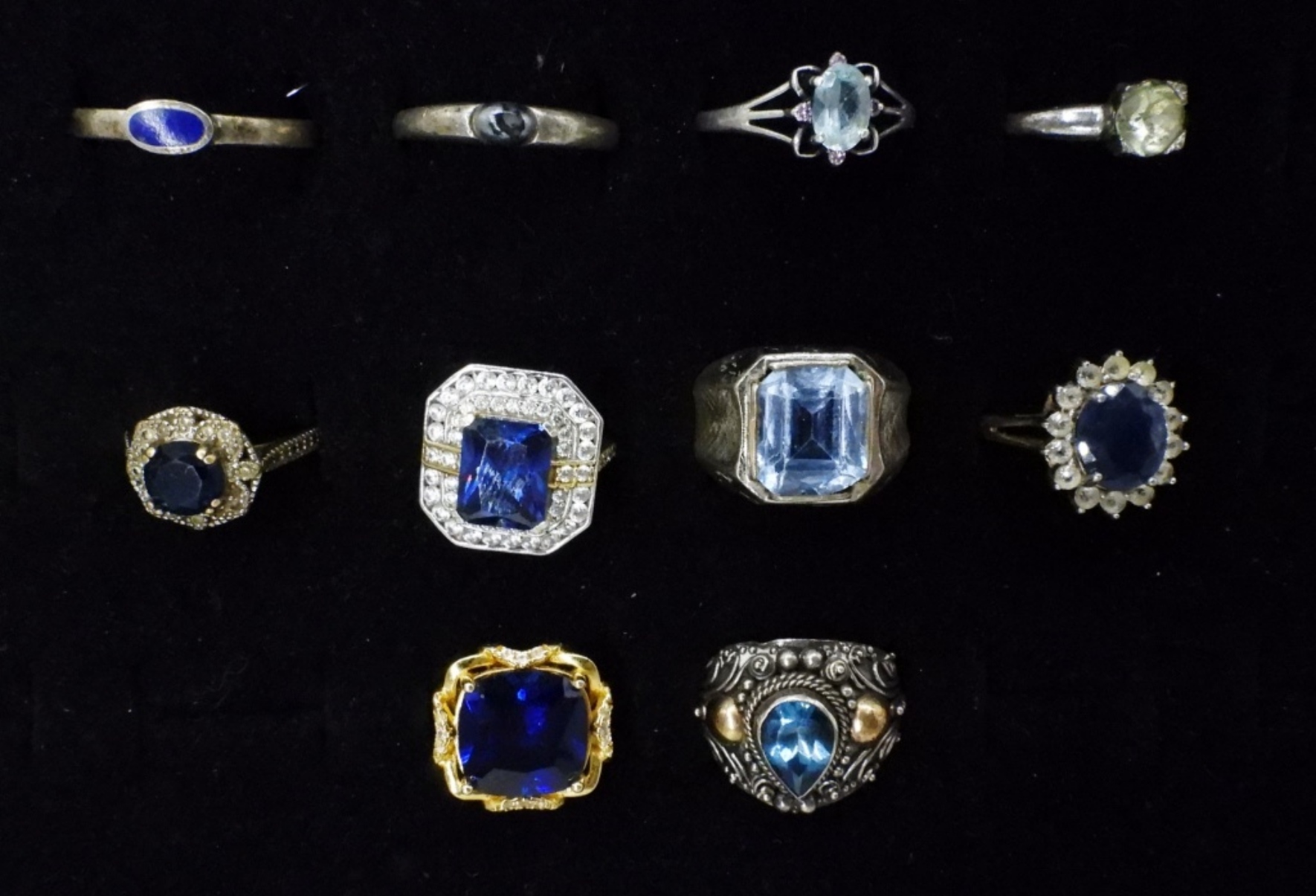 TEN VINTAGE STERLING RINGS. AQUAMARINE, FAUX SAPPHIRE & MORE. SOME BANDS ARE MISSHAPEN. SIZES 5-10. (26.5 DWT)