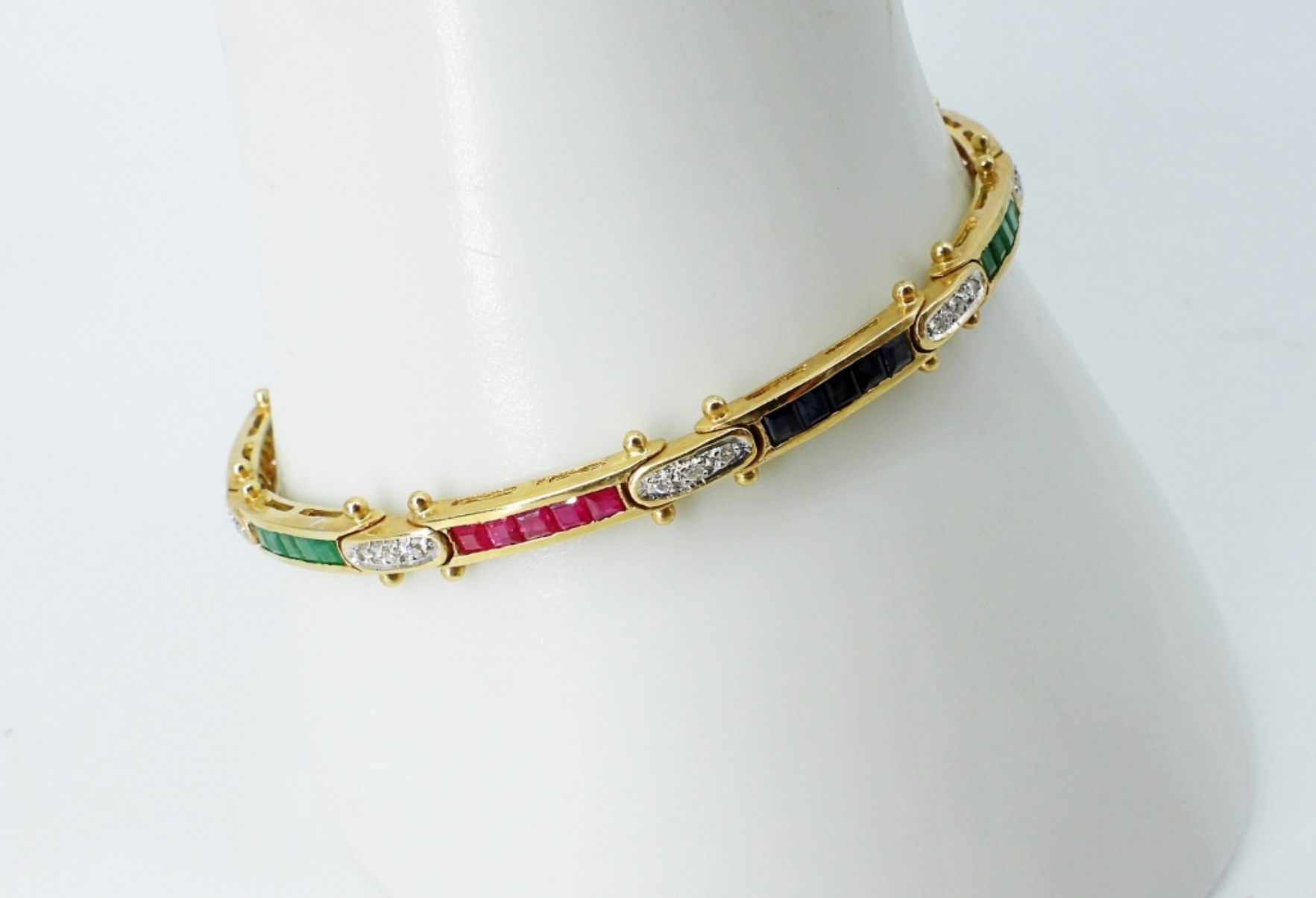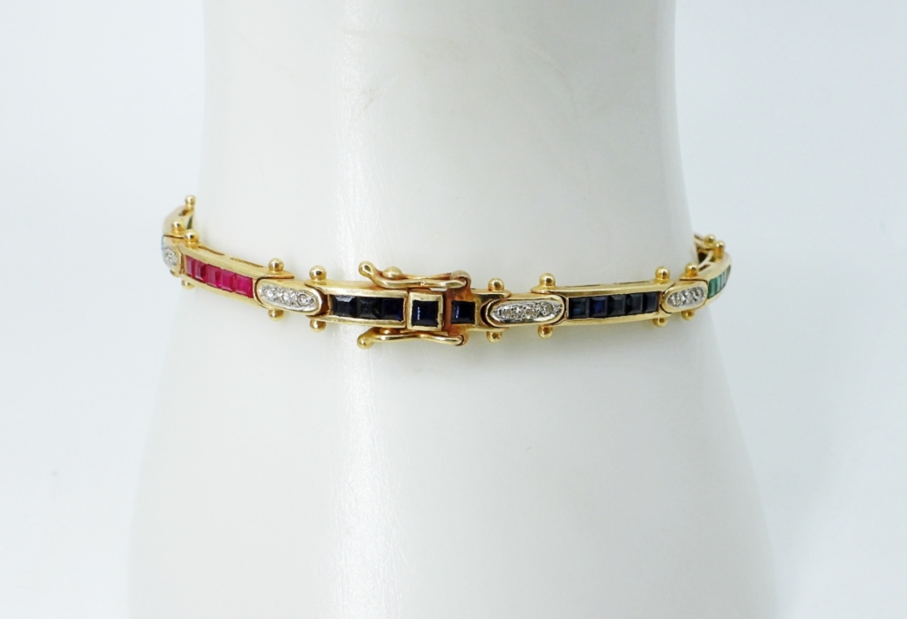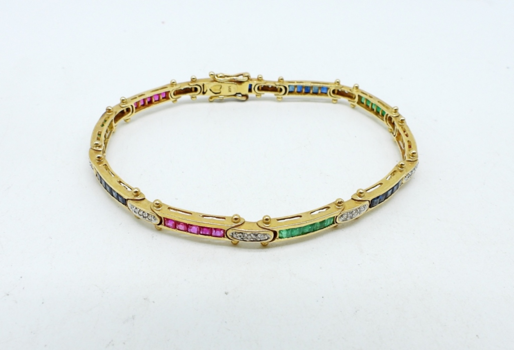 14K YELLOW GOLD BRACELET WITH RUBIES, SAPPHIRES, EMERALDS AND DIAMONDS. 7″ LONG. STUNNING PETITE BRACELET. CLASP WORKS! (6.2 DWT WITH GEMSTONES)