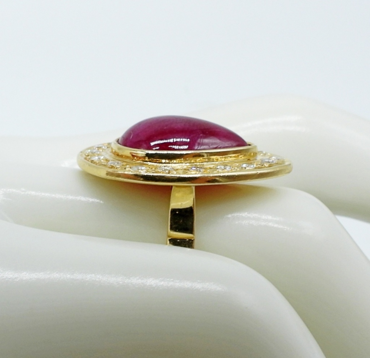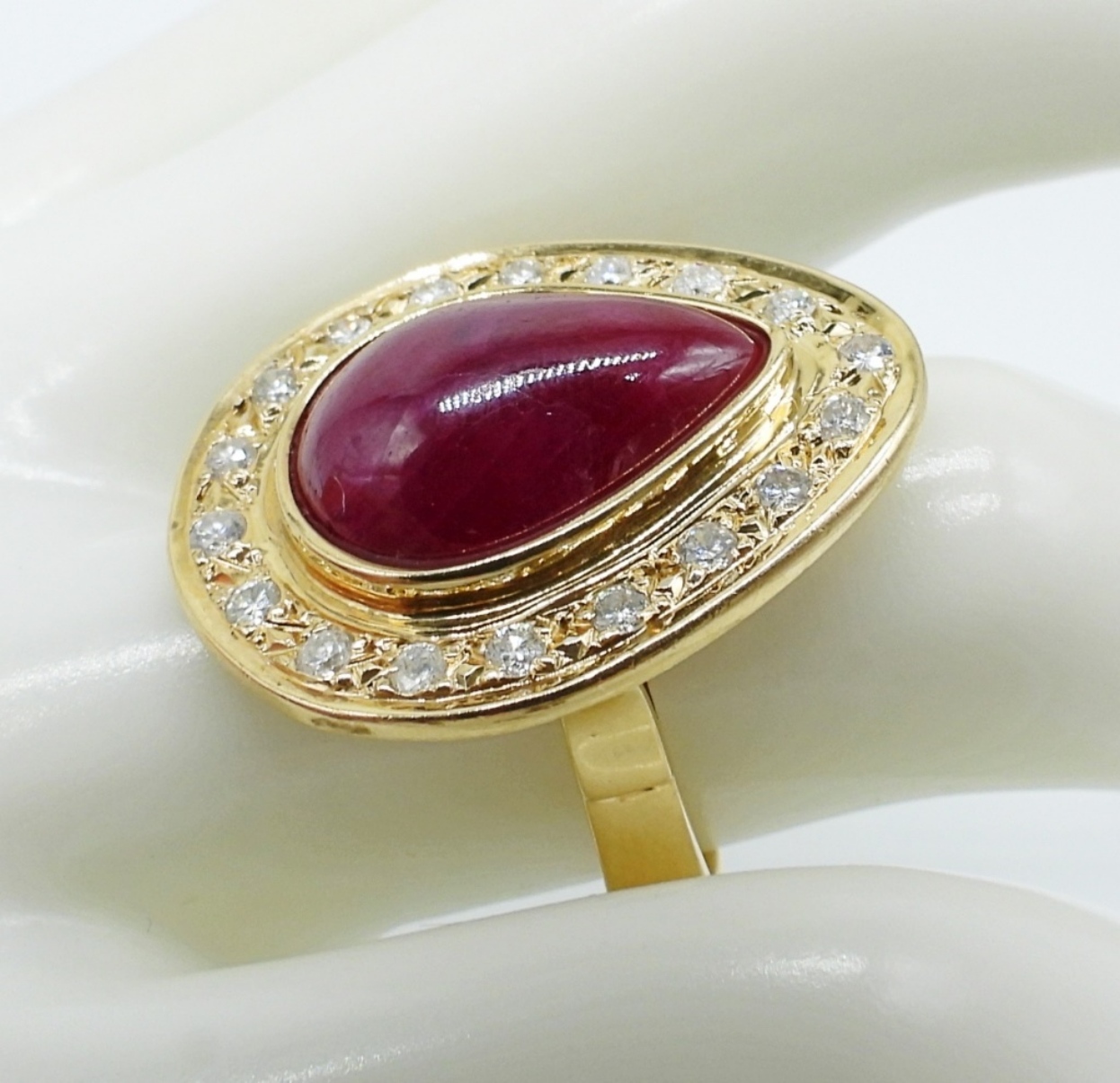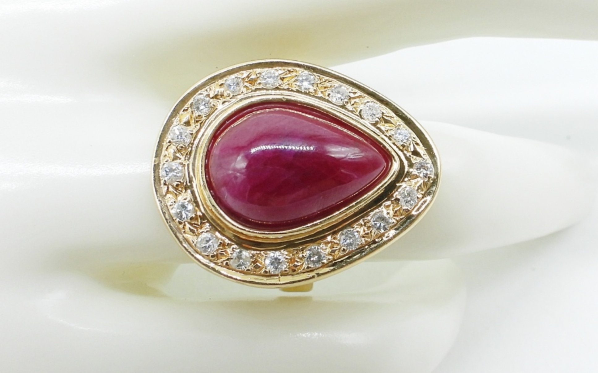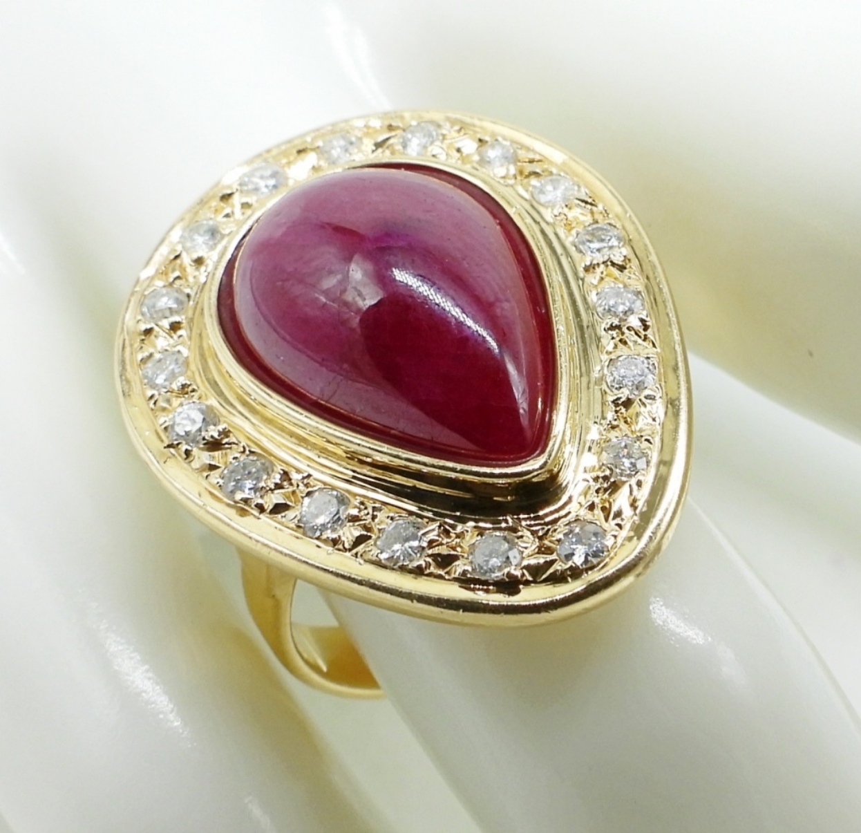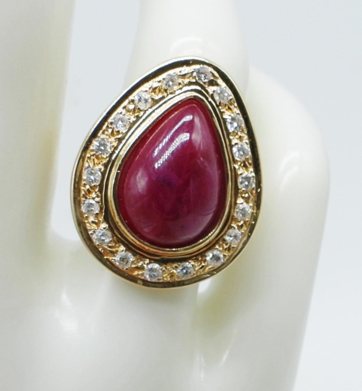 14K YELLOW GOLD RING, SIZE 6.5. TEARDROP RUBY WITH SURROUNDING DIAMONDS. INCREDIBLY BEAUTIFUL PIECE! (5.1 DWT WITH STONES)