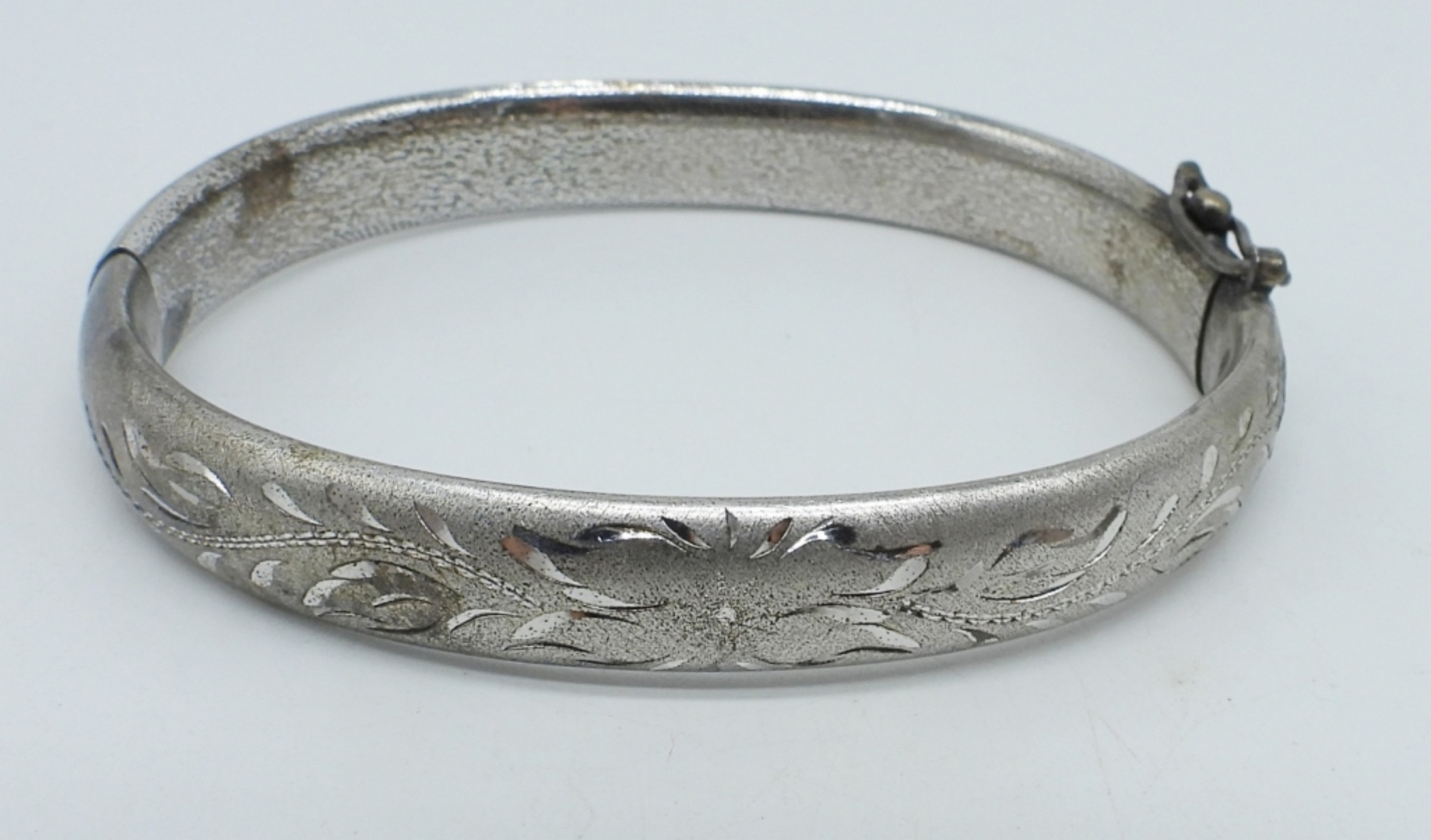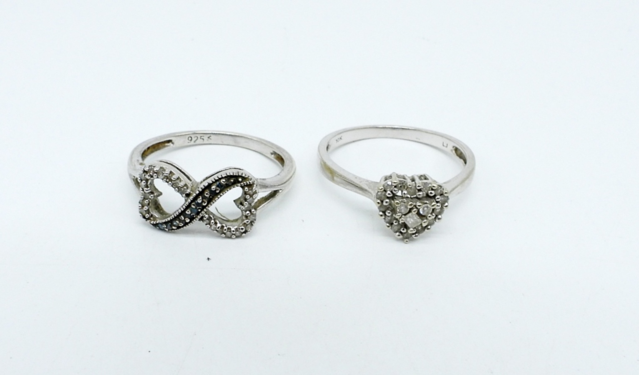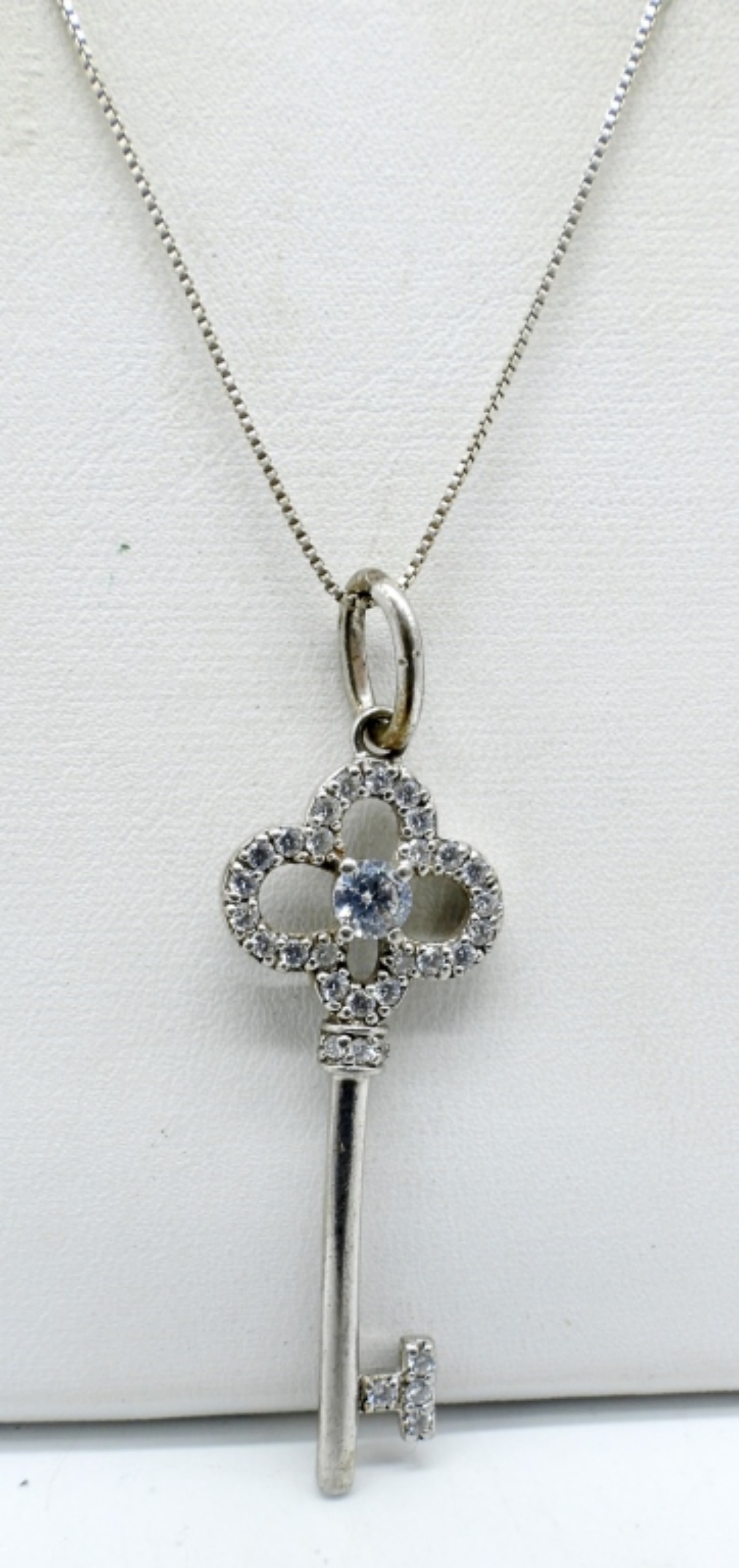 TWO STERLING RINGS WITH DIAMOND & MOISSANITE GEMSTONES, SIZES 7-7.5. ETCHED STERLING BRACELET, HINGED. 18″ STERLING KEY NECKLACE. (14.8 DWT)