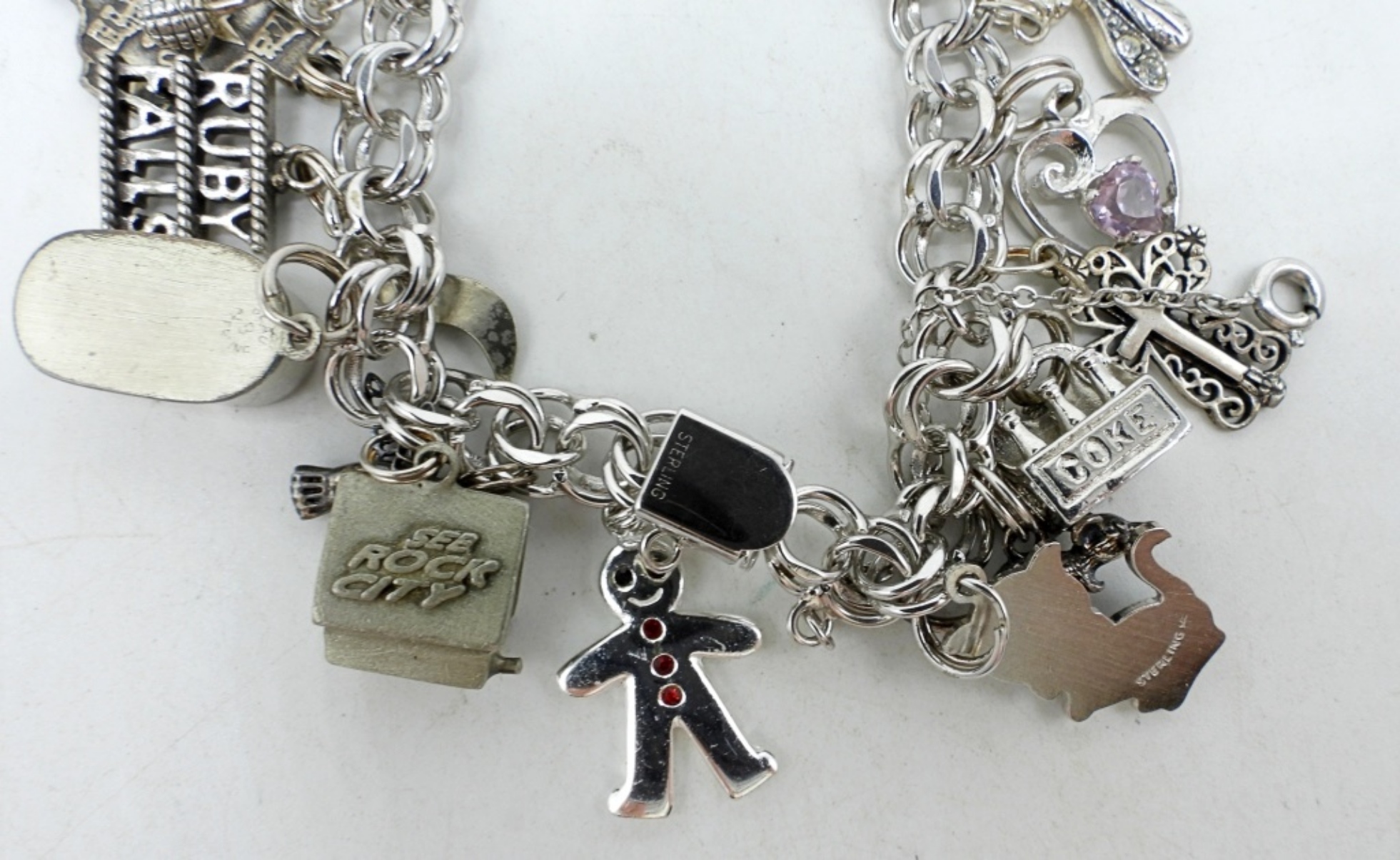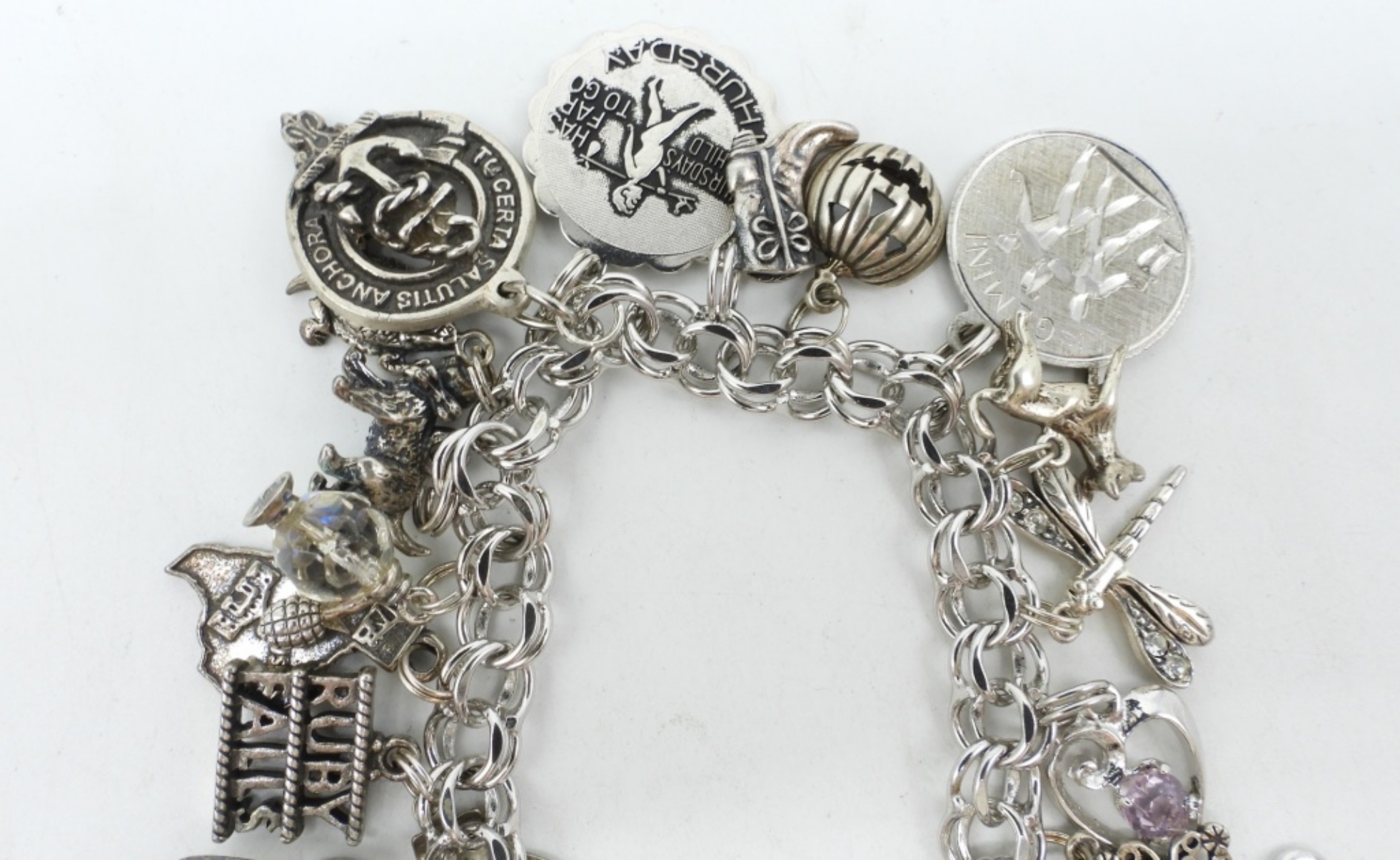VINTAGE STERLING CHARM BRACELET WITH 21 CHARMS. SOME VERY UNIQUE CHARMS!! 7″. (36.9 DWT)