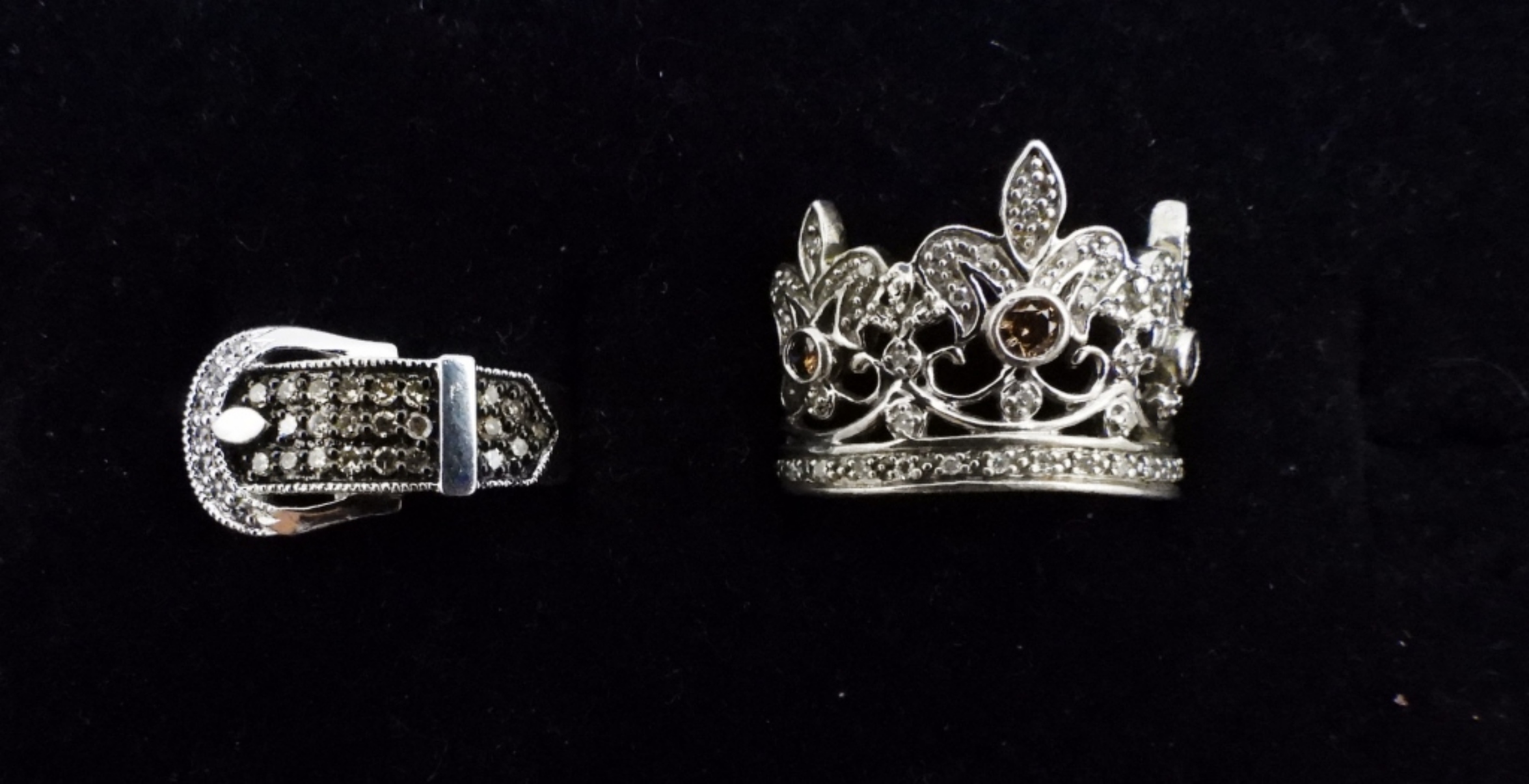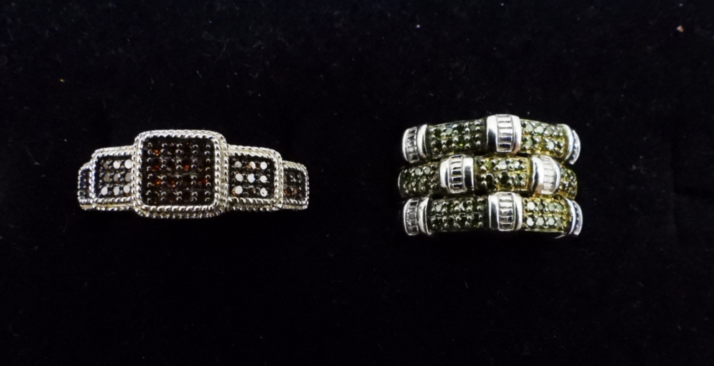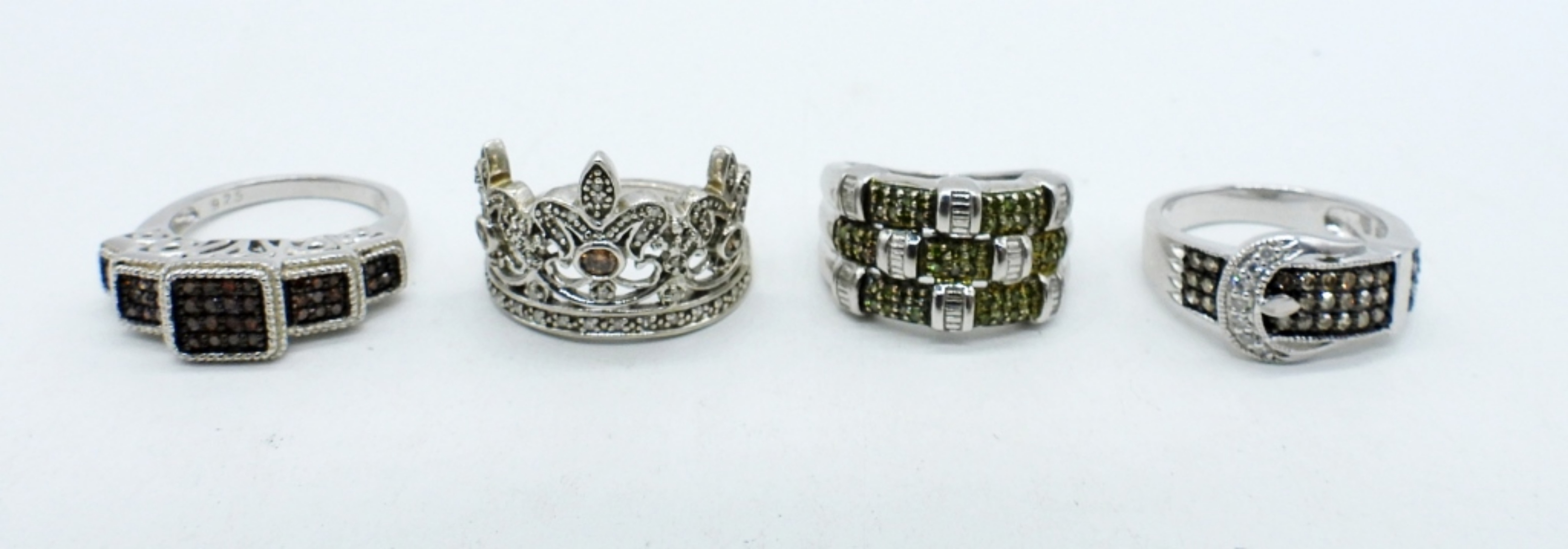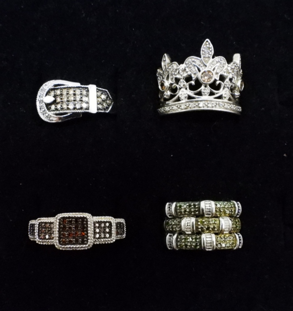 FOUR STERLING RINGS WITH DIAMONDS & MOISSANITE. EACH RING HAS AT LEAST A FEW STONES TESTED AS GENUINE DIAMOND. THE REST OF THE STONES ARE MOISSANITE. SIZES 5 & 6. (10.9 DWT)