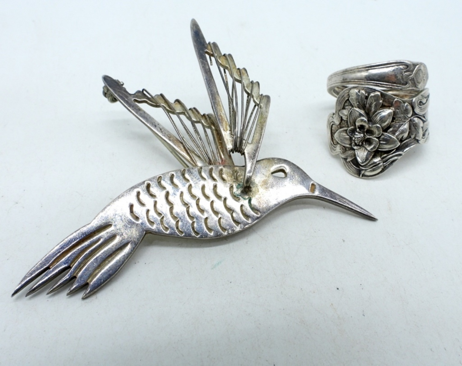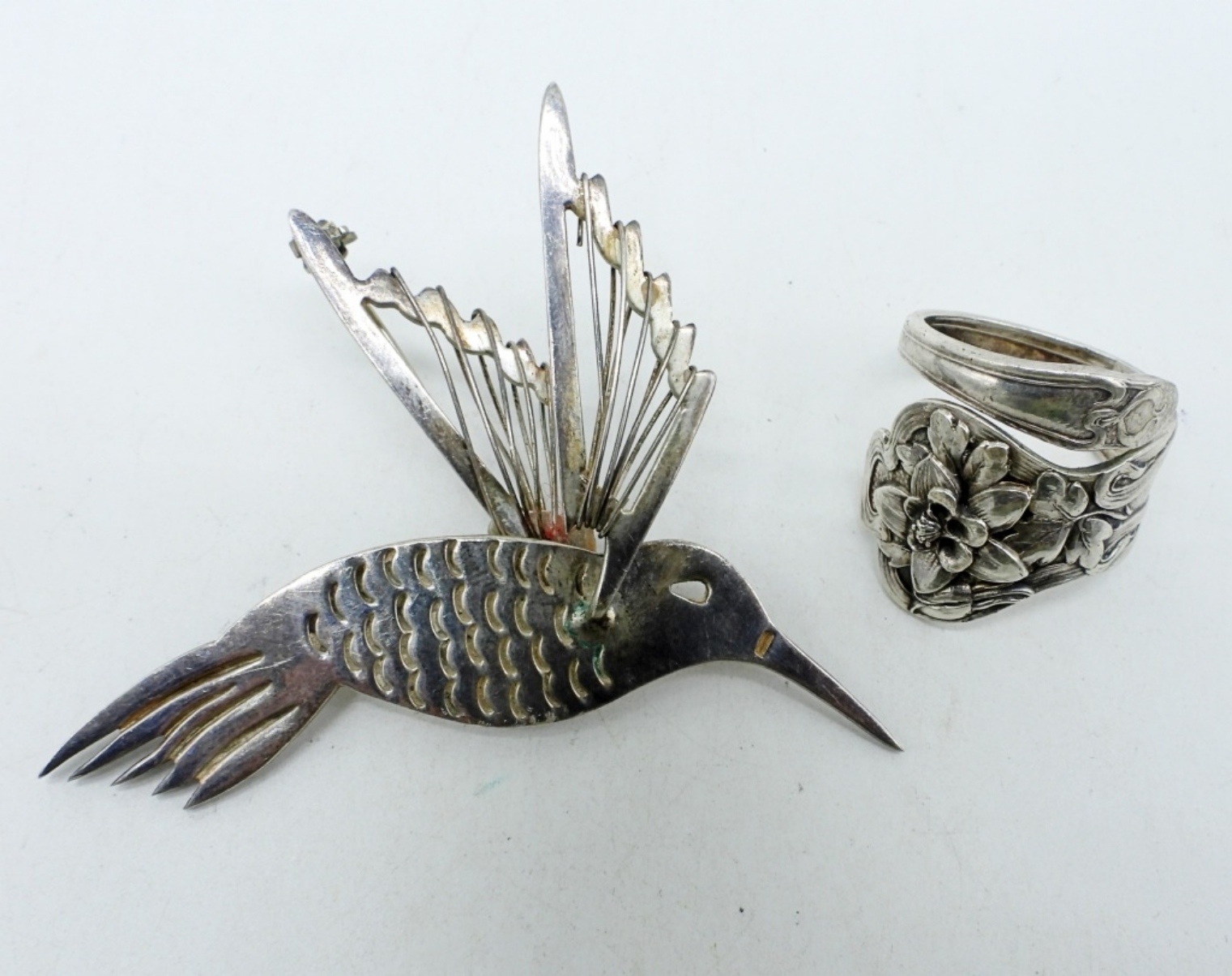 VINTAGE STERLING, TAXCO HUMMINGBIRD PIN. “TO-80 MEXICO 925″. 3″ x 2”. STERLING RING, SIZE 9. (14.8 DWT)
