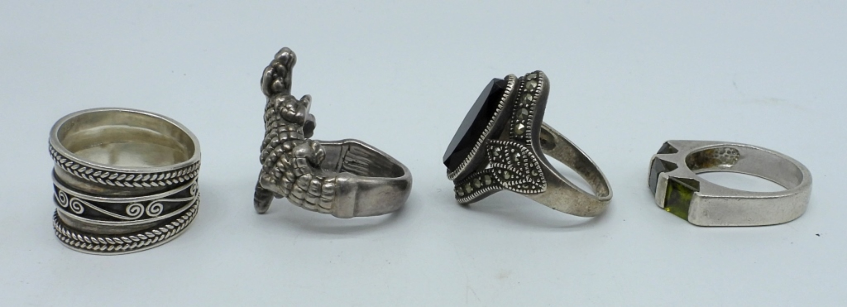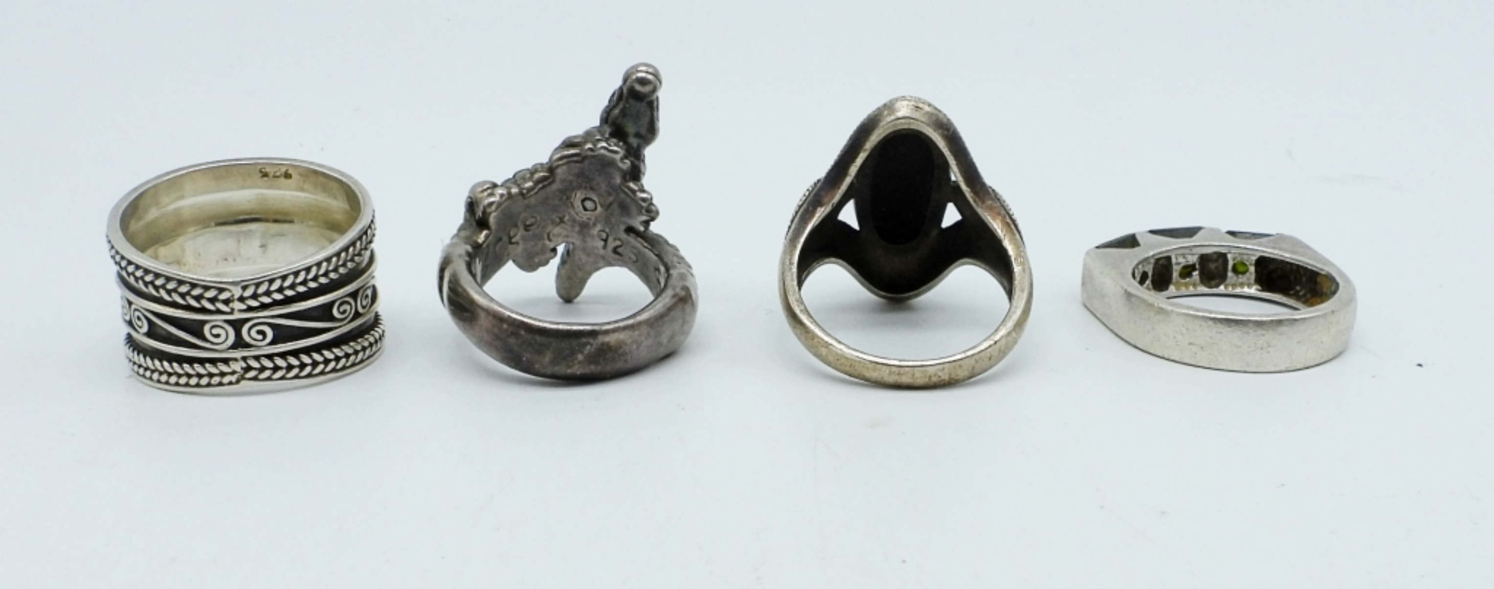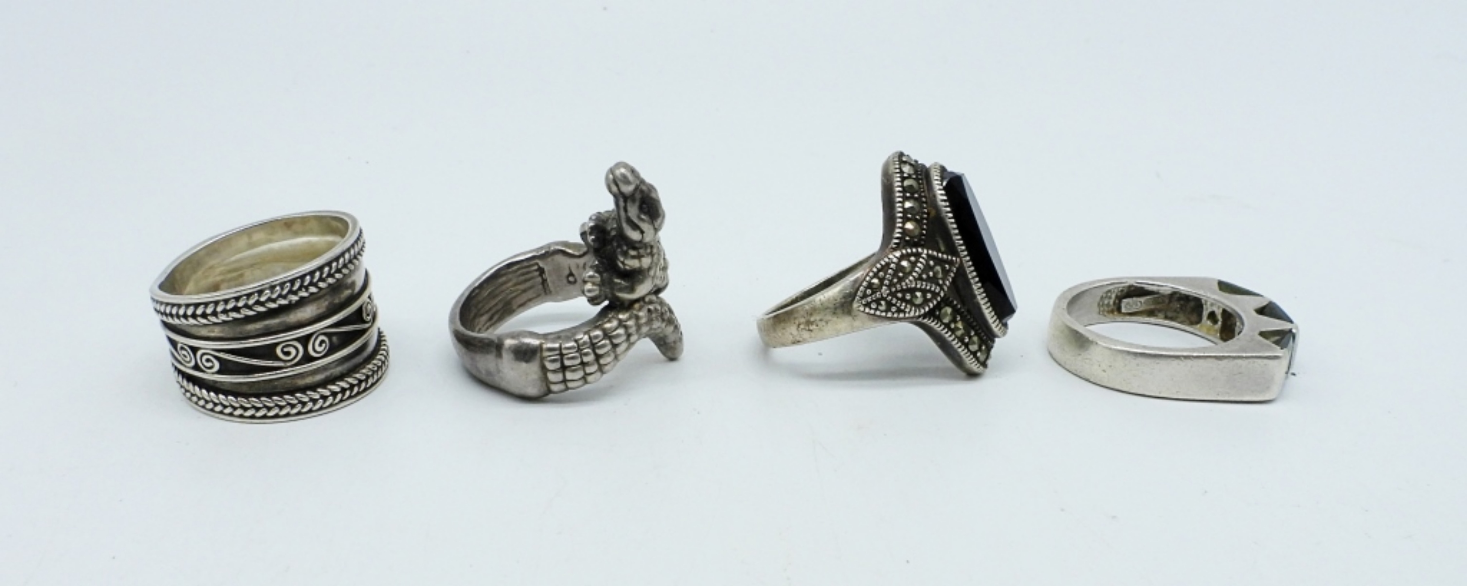 FOUR STERLING RINGS WITH MARCASITE & BLACK ONYX. SIZES 7-9 (18.2 DWT)