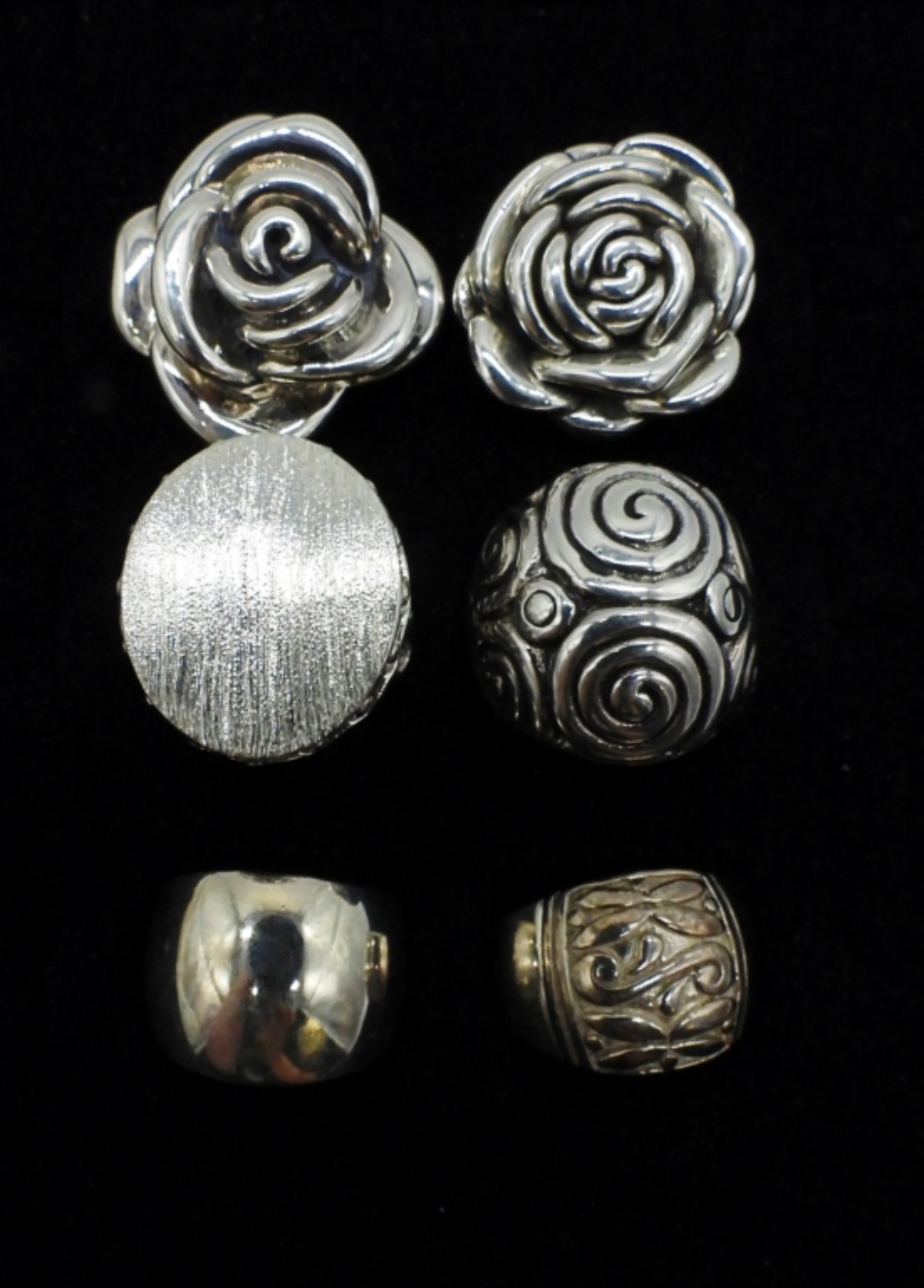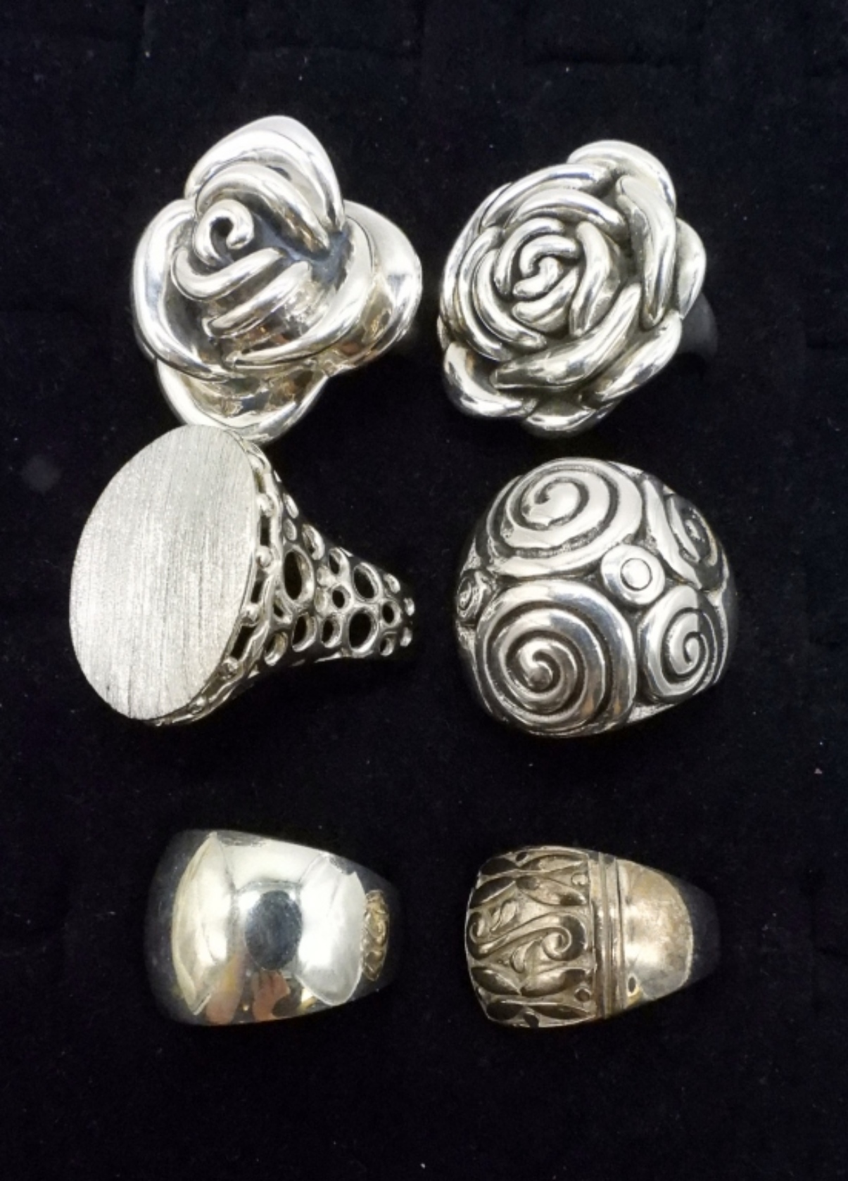 SIX FASHION STERLING RINGS, LARGE ROSES & DESIGNS. SIZES 8, 9, 10. (35 DWT)