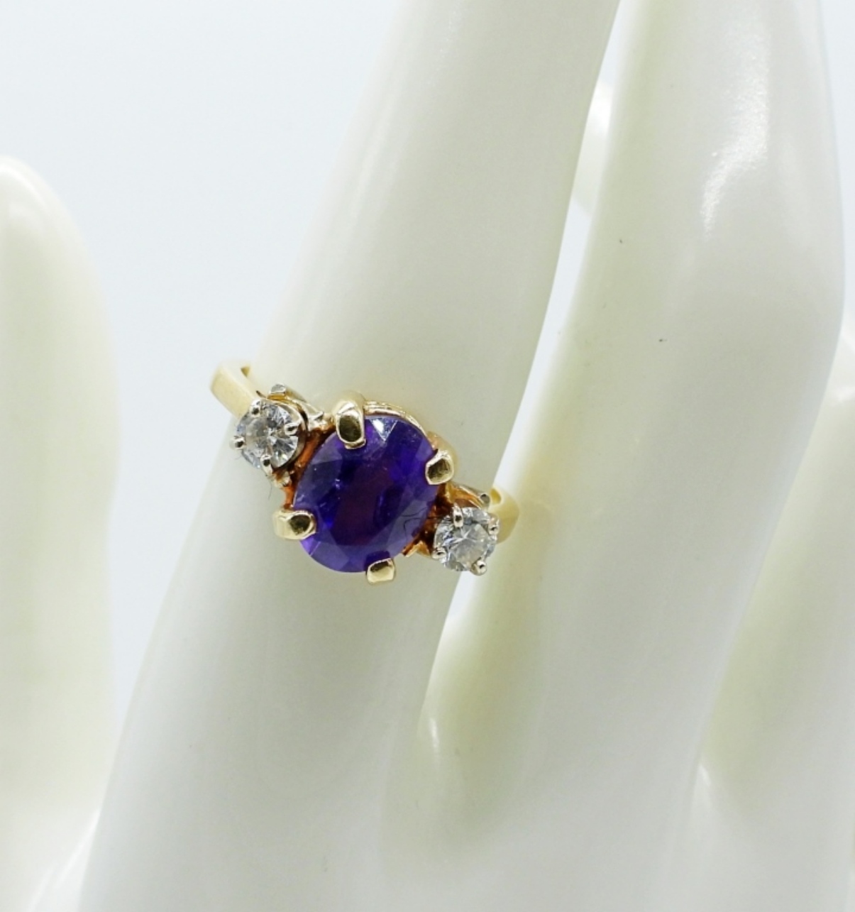 14K YELLOW GOLD RING WITH 1/2 CARAT TW WHITE DIAMONDS AND AMETHYST CENTER STONE. SIZE 7 1/4. (2.5 DWT)