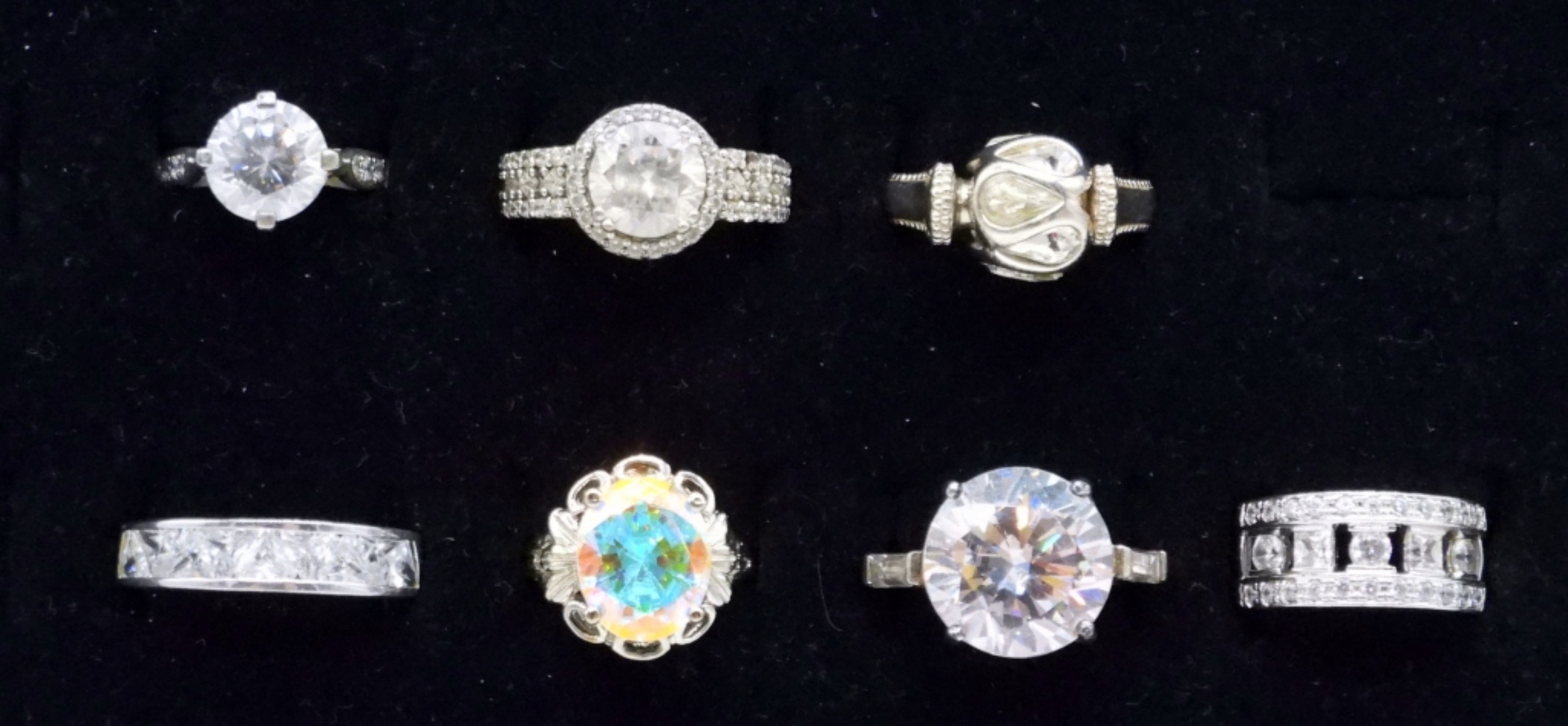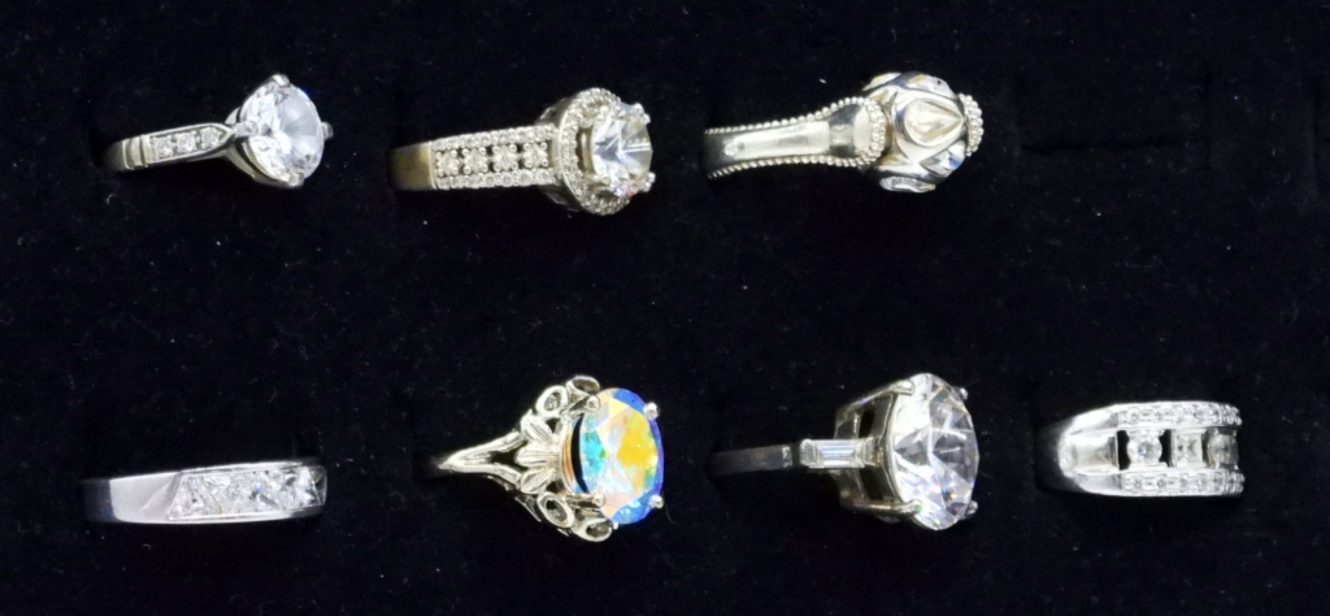SEVEN STERLING BRIDAL STYLE RINGS. SIZES 4.5 – 9 (26.2 DWT)
