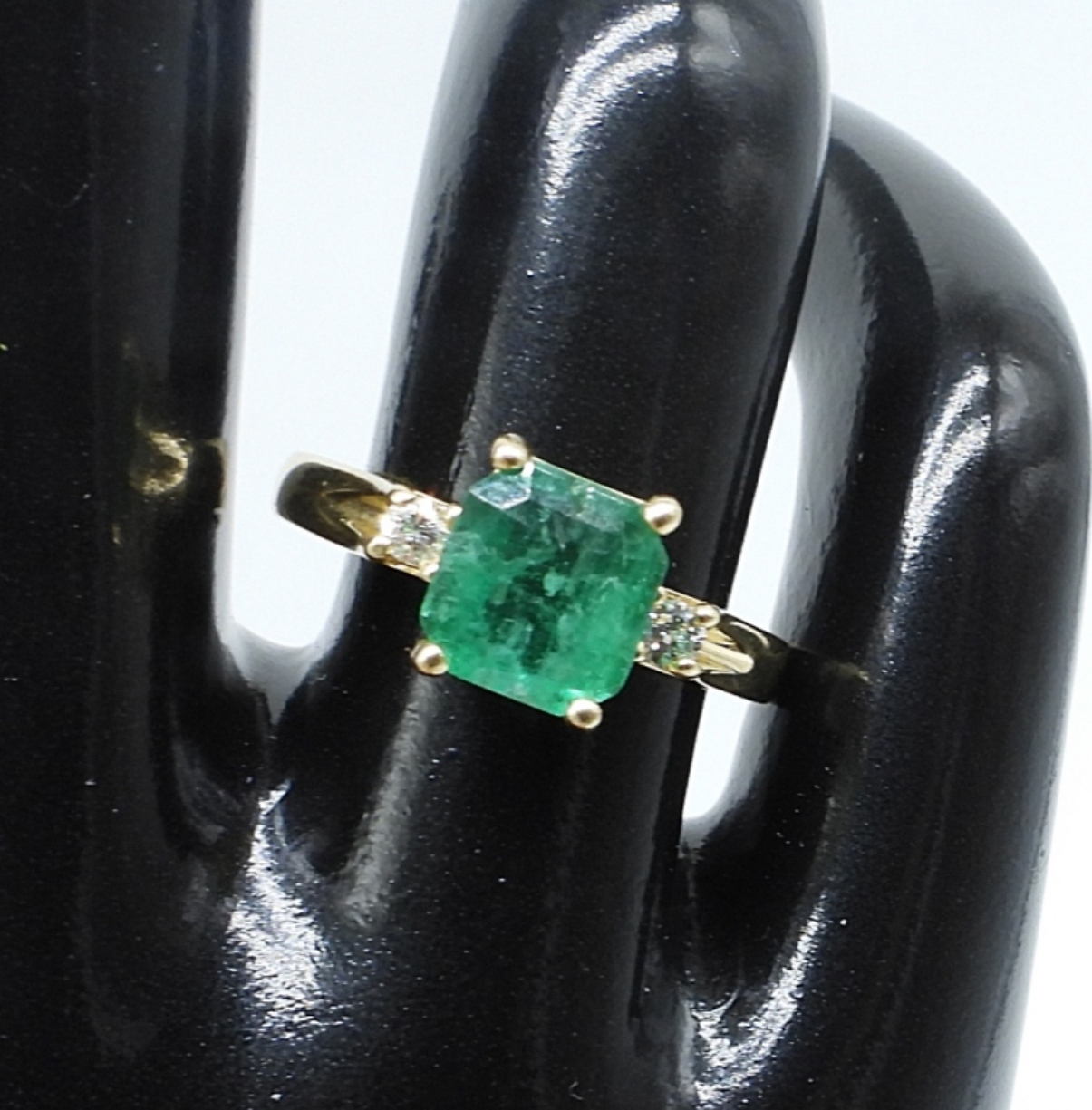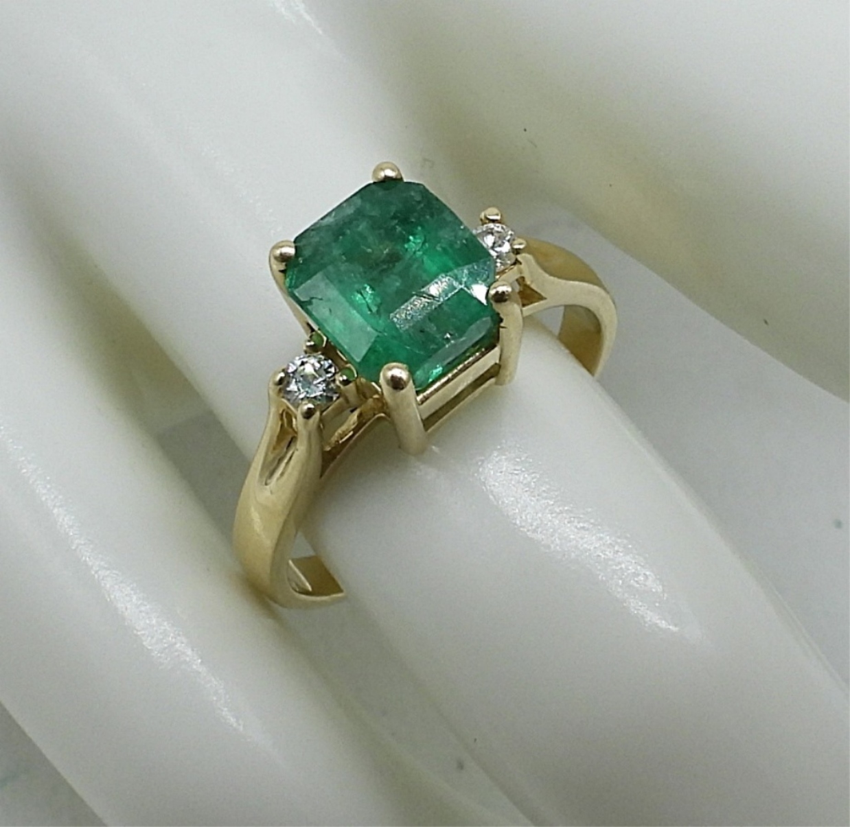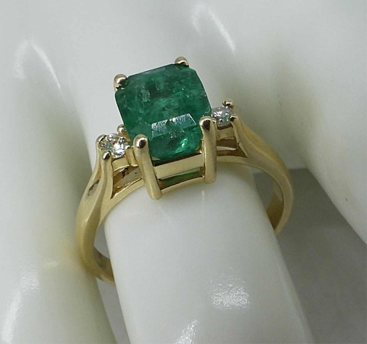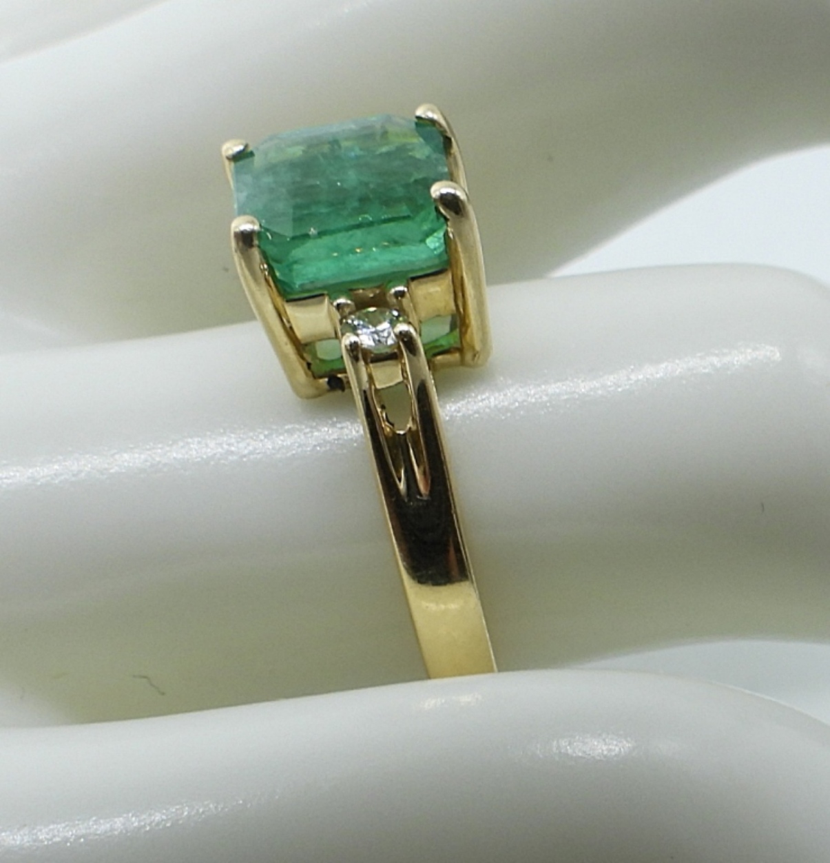 14K YELLOW GOLD, GORGEOUS NATURAL EMERALD (INCLUSIONS IN THE STONE MEAN IT’S NATURAL!) SIZE 6.5. TWO SMALL SIDE DIAMONDS. (2.3 DWT W/ STONES)