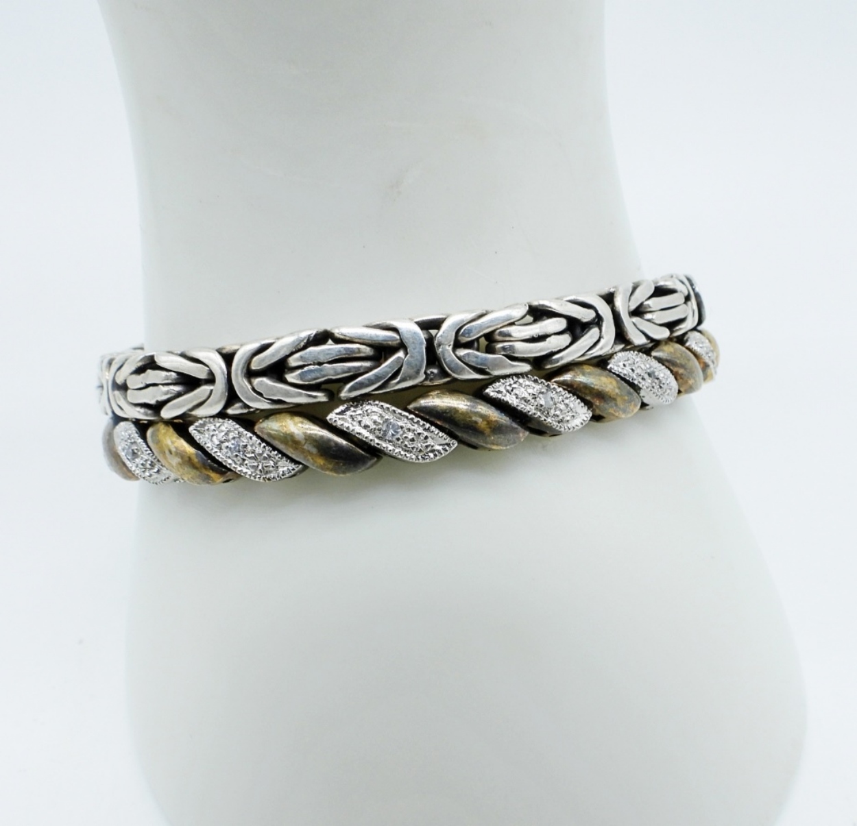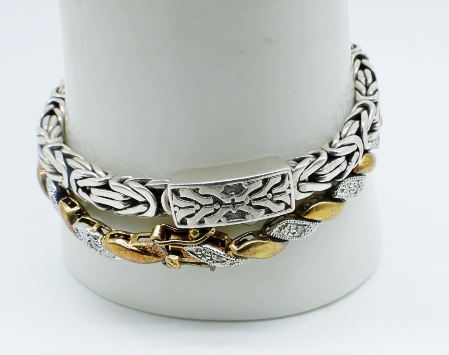 TWO STERLING BRACELETS, ONE IN GOLD TONE WITH A FEW DIAMOND ACCENTS. 7″. (26.2 DWT)