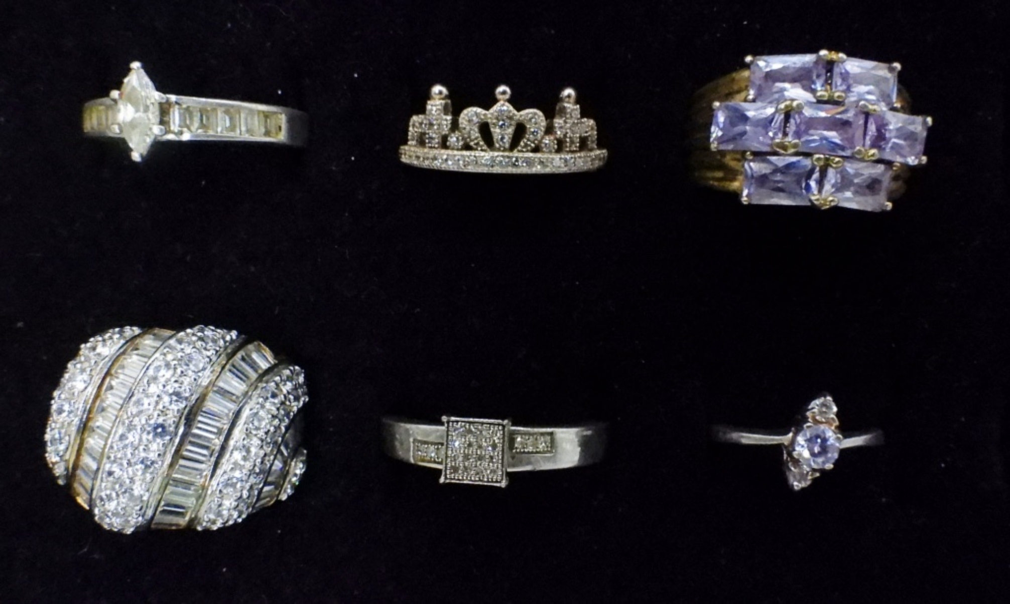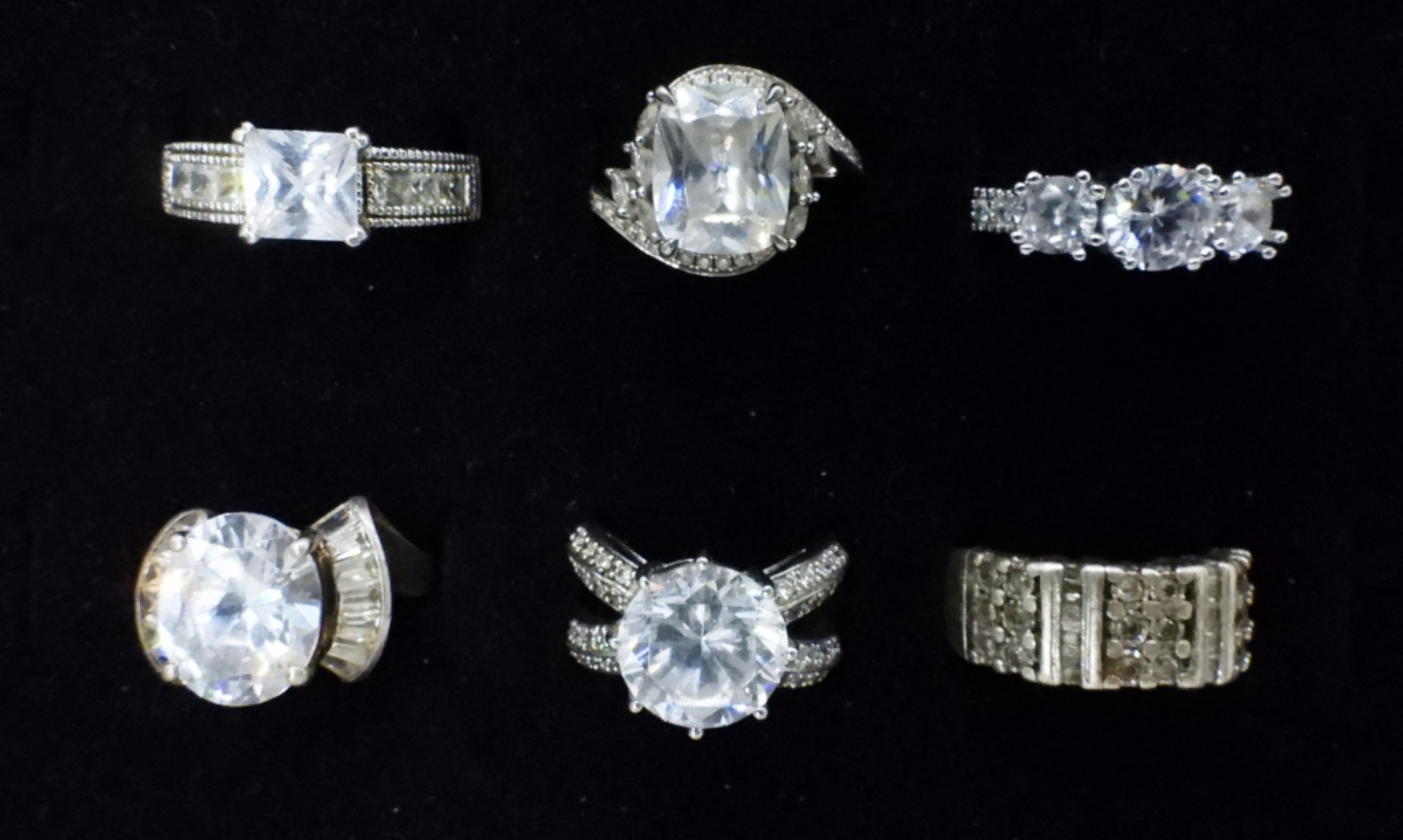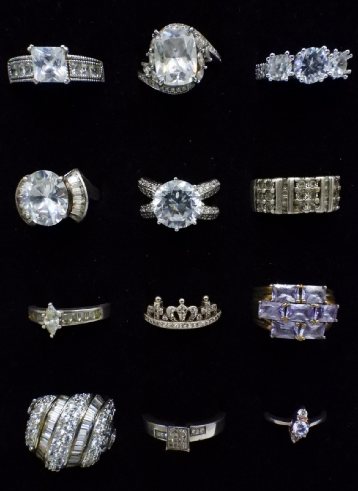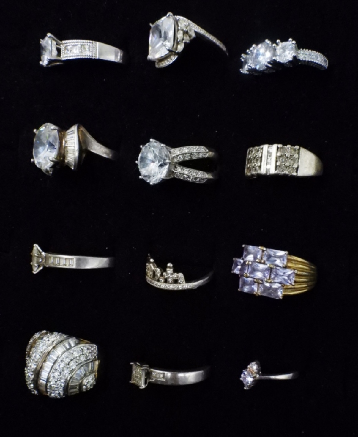 TWELVE STERLING BRIDAL STYLE, FASHION RINGS. GOLD AND SILVER TONES. SIZES 2.5-9 (36 DWT)