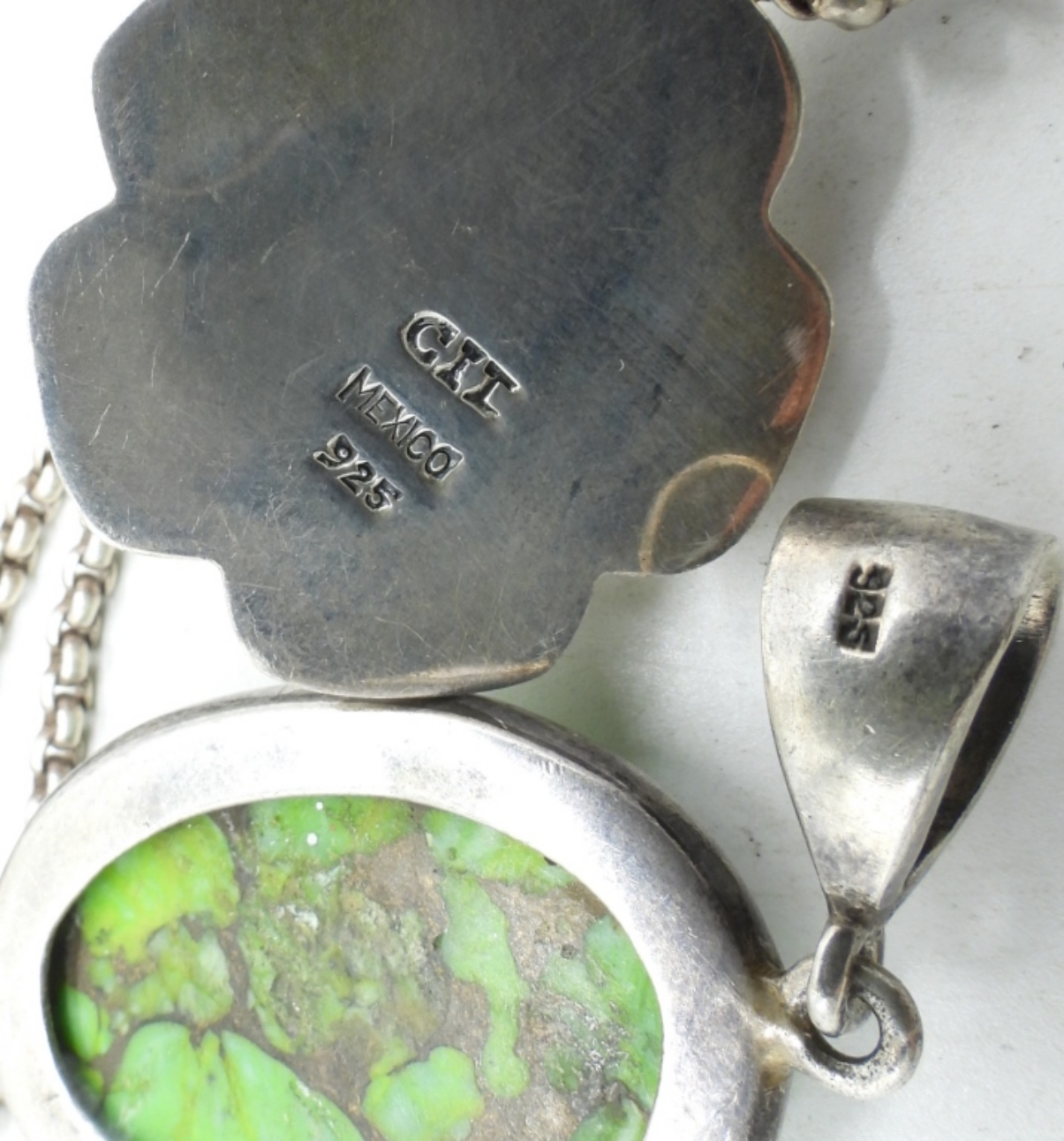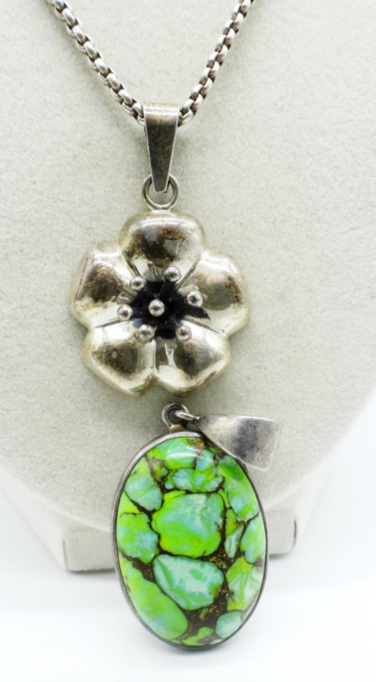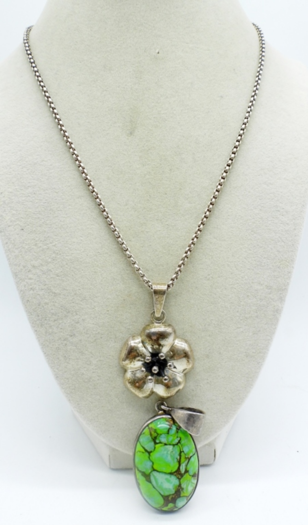 VINTAGE STERLING CII MEXICO PUFFY FLOWER PENDANT ON A 18″ CHAIN. GREEN COPPER TURQUOISE PENDANT, STERLING, 2″ LONG. (22 DWT)