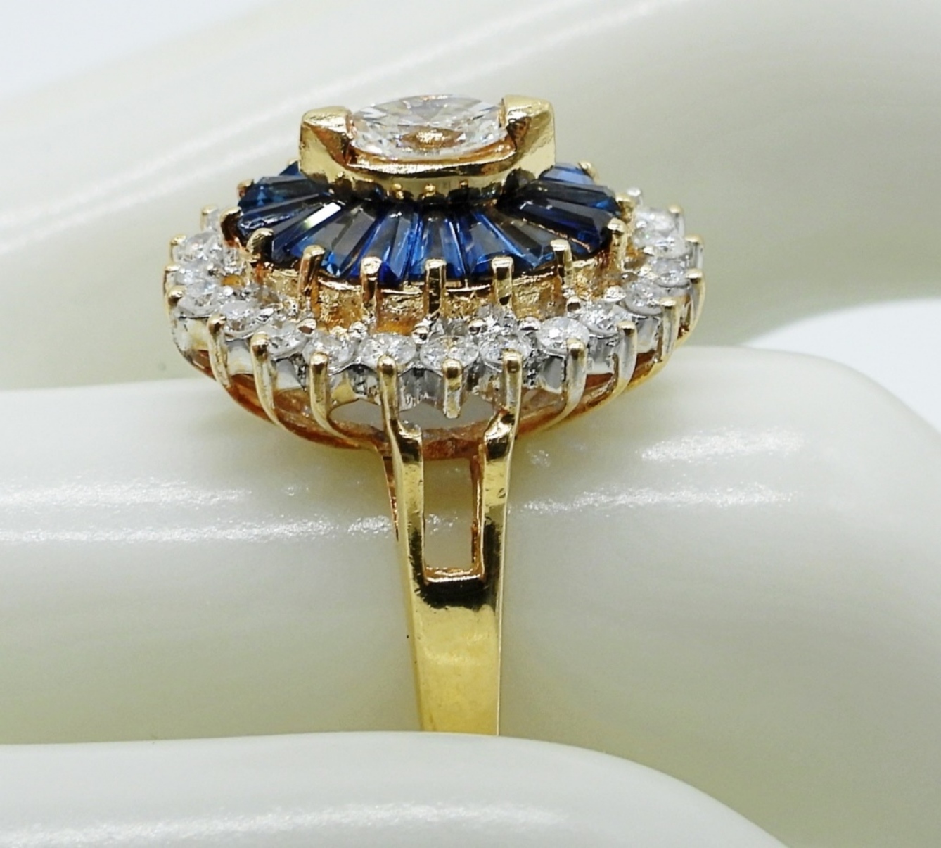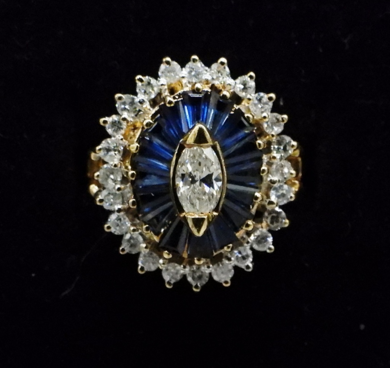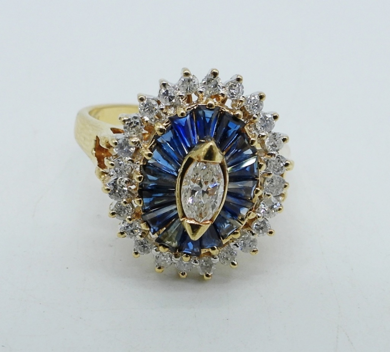14K YELLOW GOLD RING, SIZE 6. MARQUISE CENTER DIAMOND, SURROUNDED BY STUNNING BAGUETTE SAPPHIRES. THEN SURROUNDED BY ROUND DIAMONDS. INCREDIBLE RING! (3.1 DWT WITH STONES)
