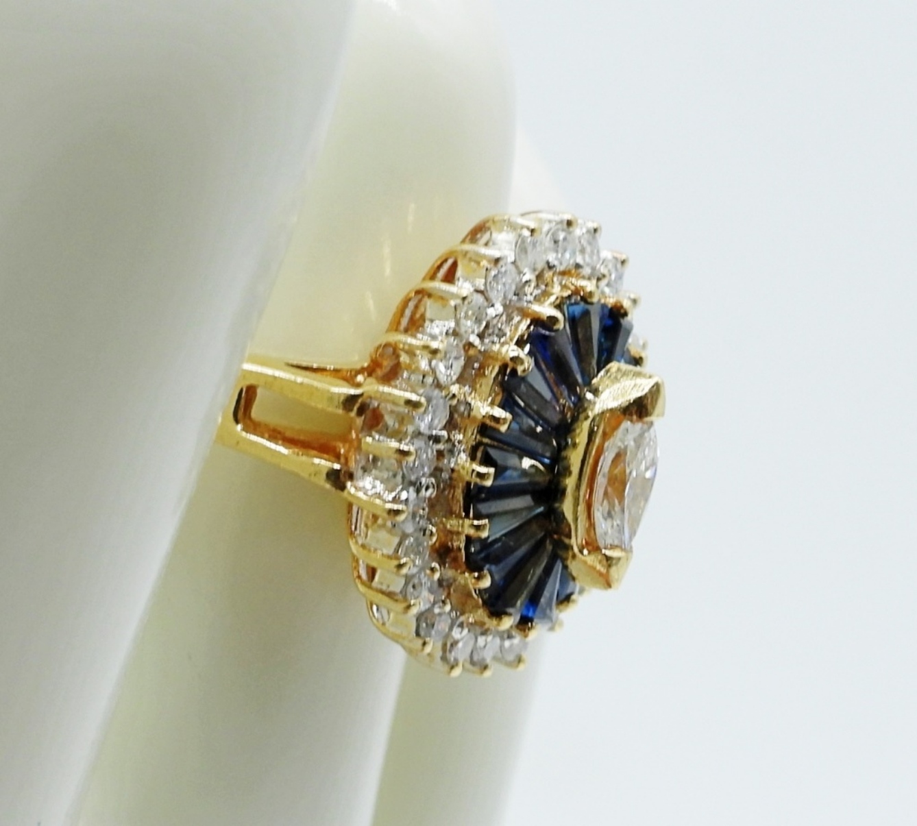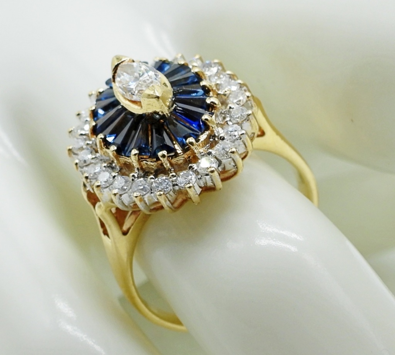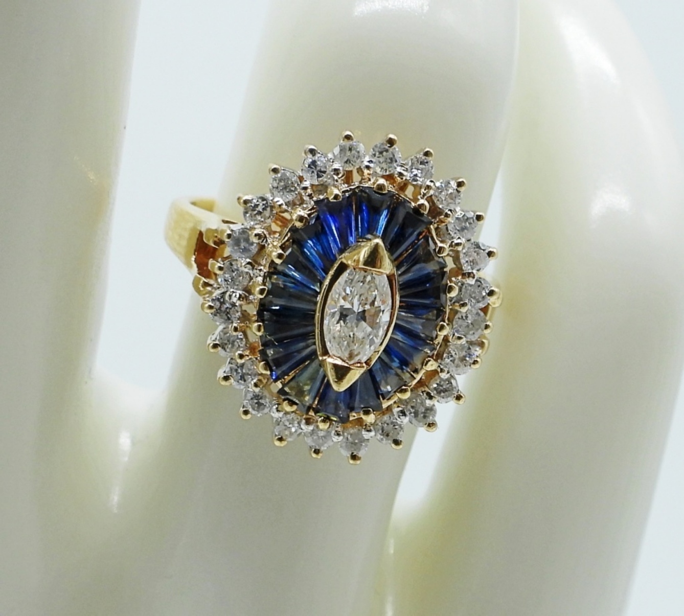 14K YELLOW GOLD RING, SIZE 6. MARQUISE CENTER DIAMOND, SURROUNDED BY STUNNING BAGUETTE SAPPHIRES. THEN SURROUNDED BY ROUND DIAMONDS. INCREDIBLE RING! (3.1 DWT WITH STONES)