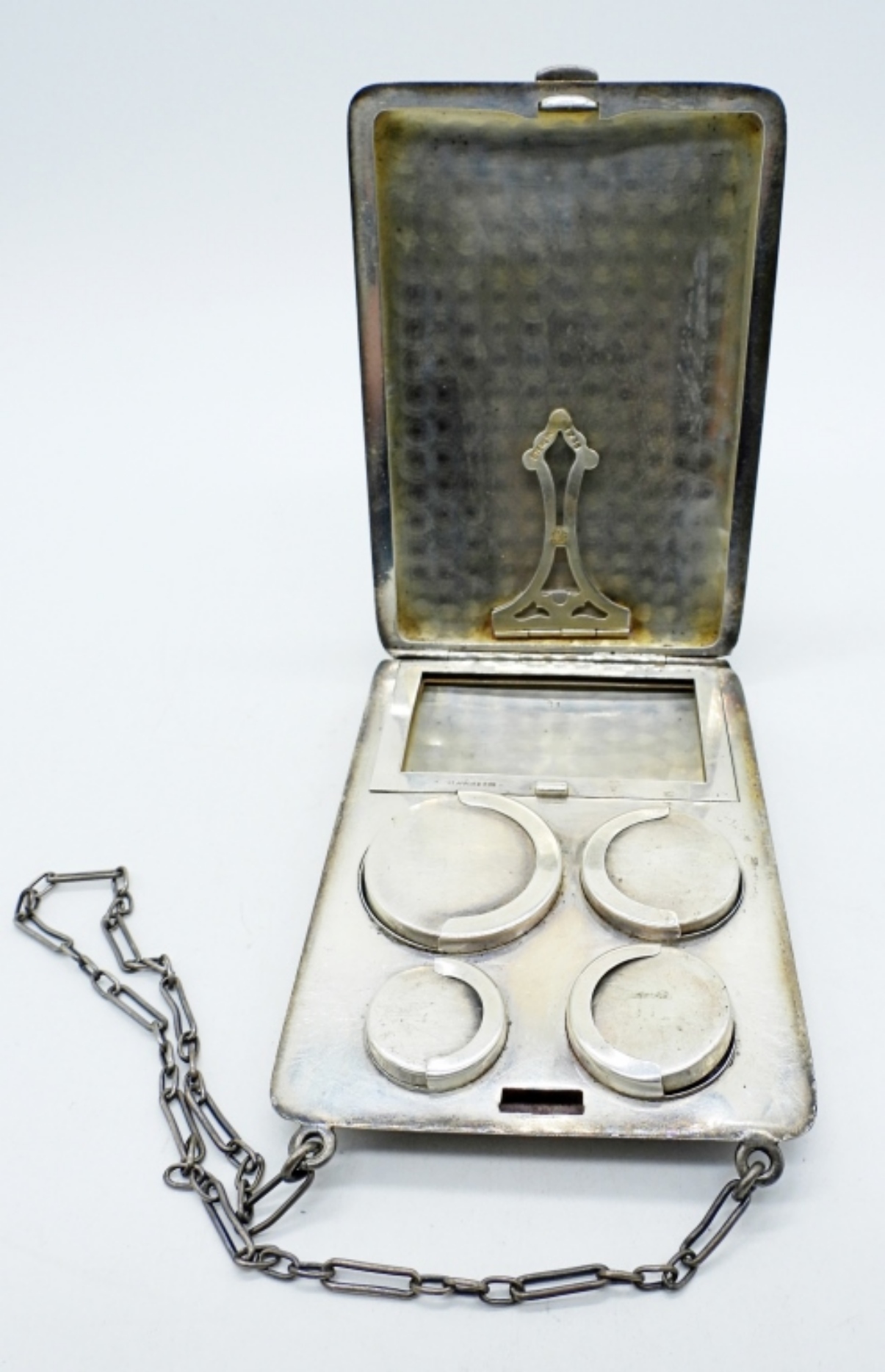 VINTAGE STERLING COIN PURSE, ENGRAVED WITH INITIALS AND 1917. IN GREAT CONDITION, SOME TARNISHING. 9″ LONG WITH CHAIN. 3″ WIDE. (87.7 DWT)