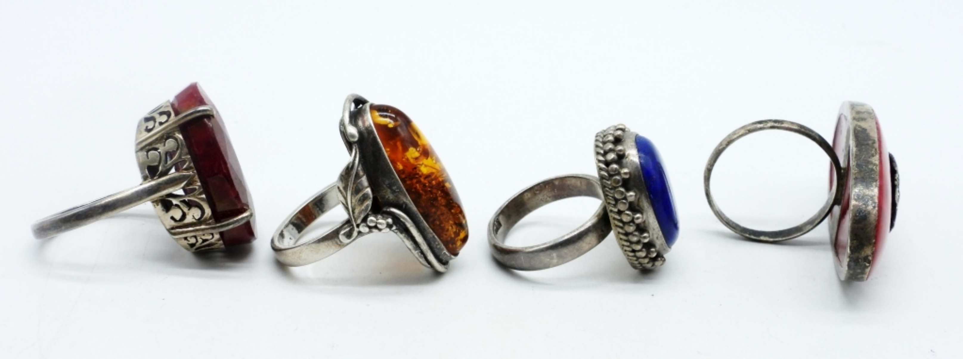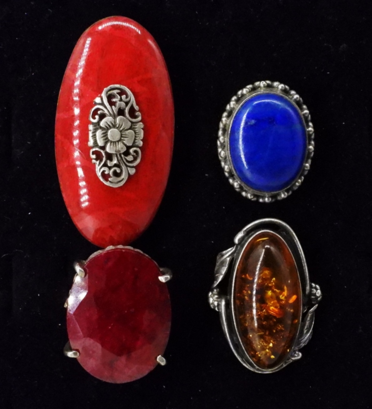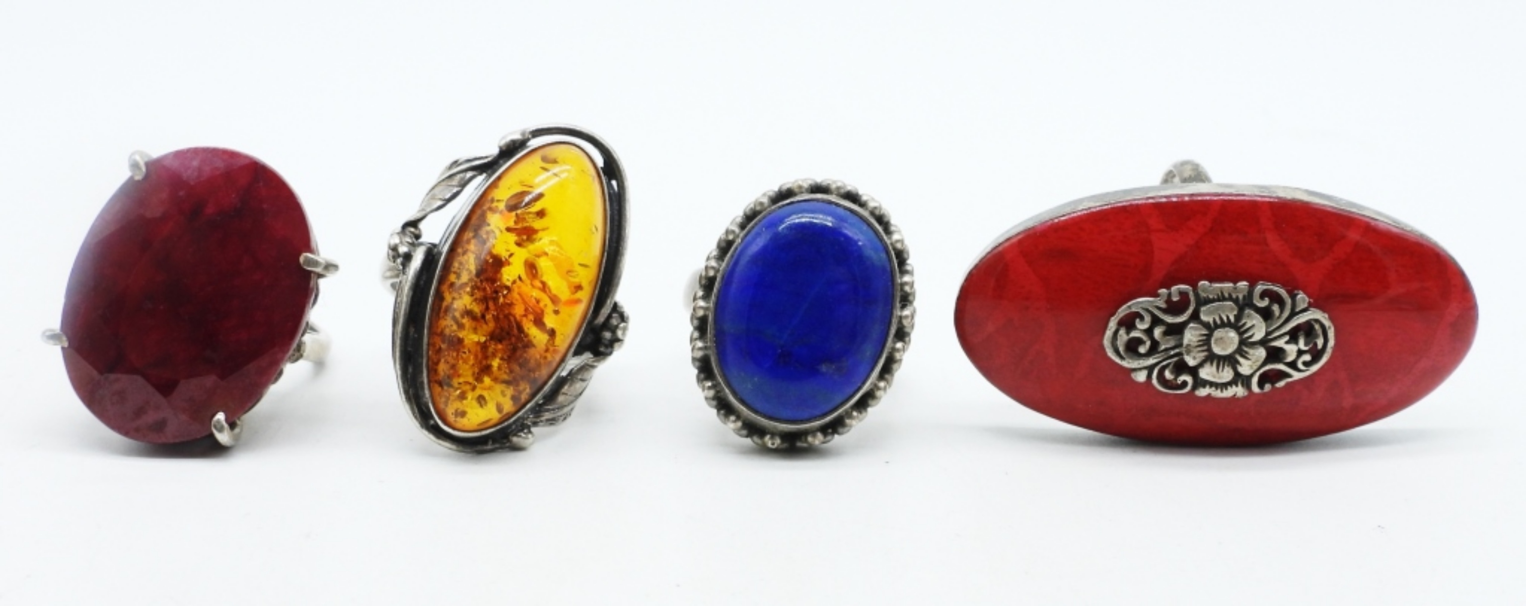 FOUR STERLING VINTAGE RINGS. LARGE GEMSTONES! NATURAL RUBY, AMBER, LAPIS LAZULI. SIZES 6, 6.5, 8. (20 DWT)