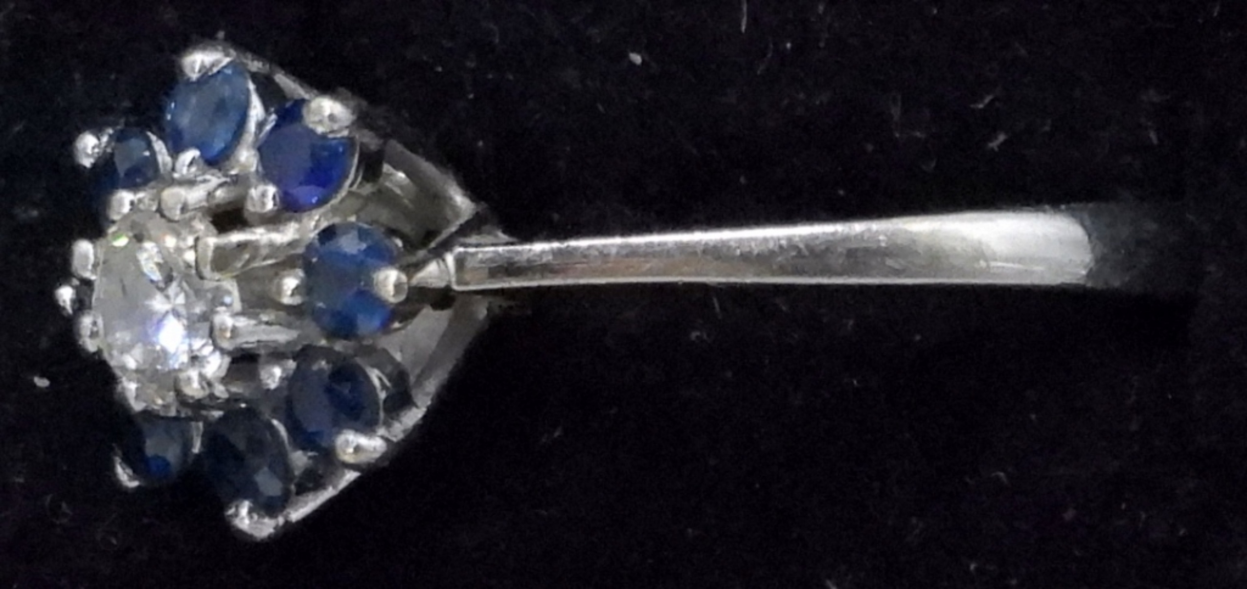 14K WHITE GOLD, 1/2 CARAT DIAMOND WITH SAPPHIRES SURROUNDING IT. (DIAMOND WAS TESTED, SAPPHIRES WERE NOT). SIZE 6. GORGEOUS RING! (1.9 DWT WITH STONES).