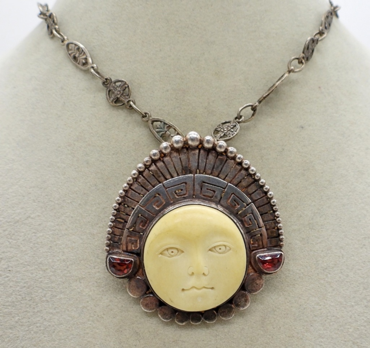 SAJEN AZTEC FACE WITH HEADDRESS, GARNET GEMSTONES, CARVED BONE FACE AND A 28″ STERLING CHAIN. (31 DWT)