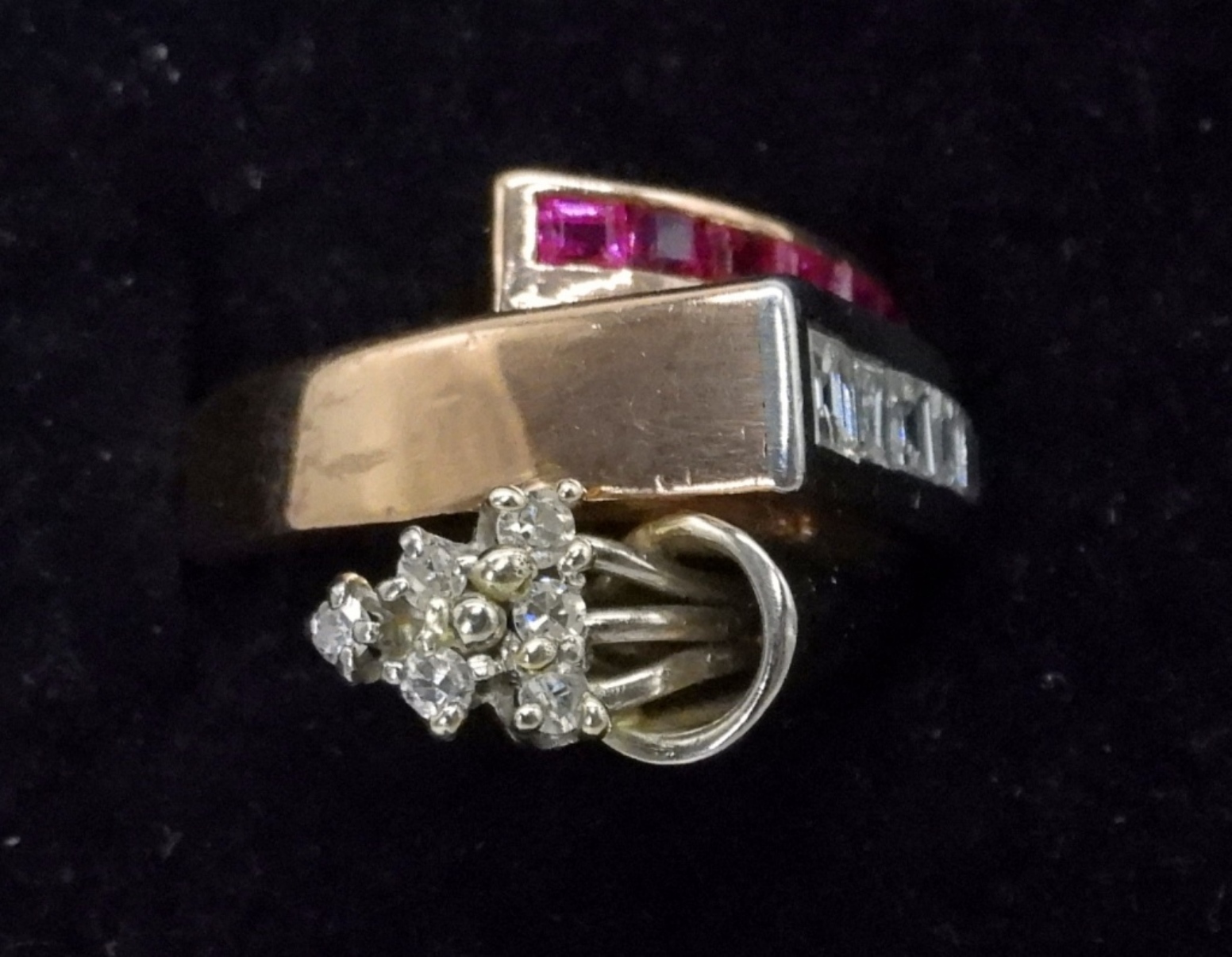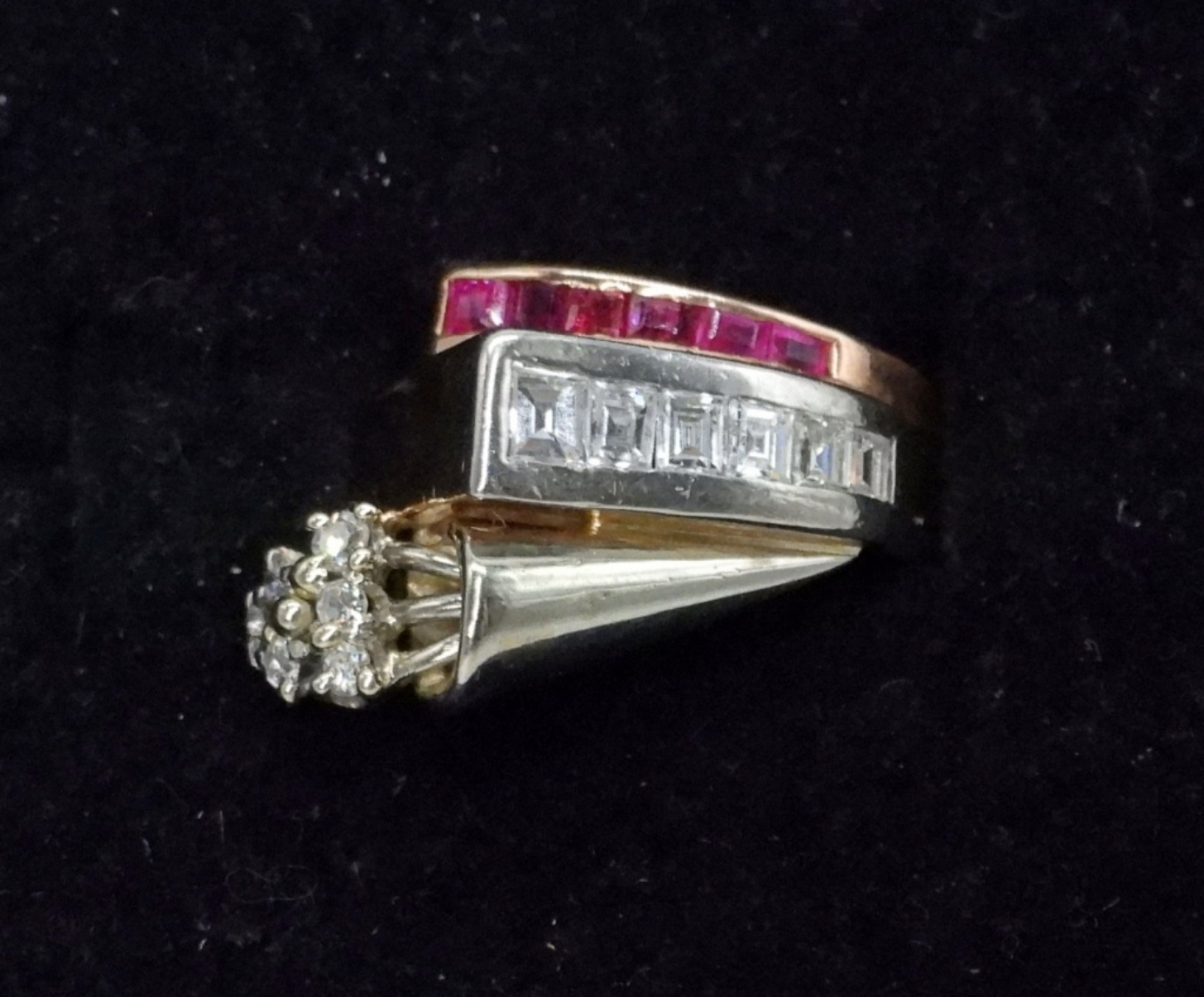 14K ROSE GOLD & WHITE GOLD RING. BAGUETTE DIAMONDS ARE GENUINE, ROUND DIAMONDS ARE SIMULATED & MOISSANITE. RUBIES ARE UNTESTED, BUT LIKELY GENUINE! SIZE 5. VERY UNIQUE PIECE! (5.2 DWT WITH STONES)