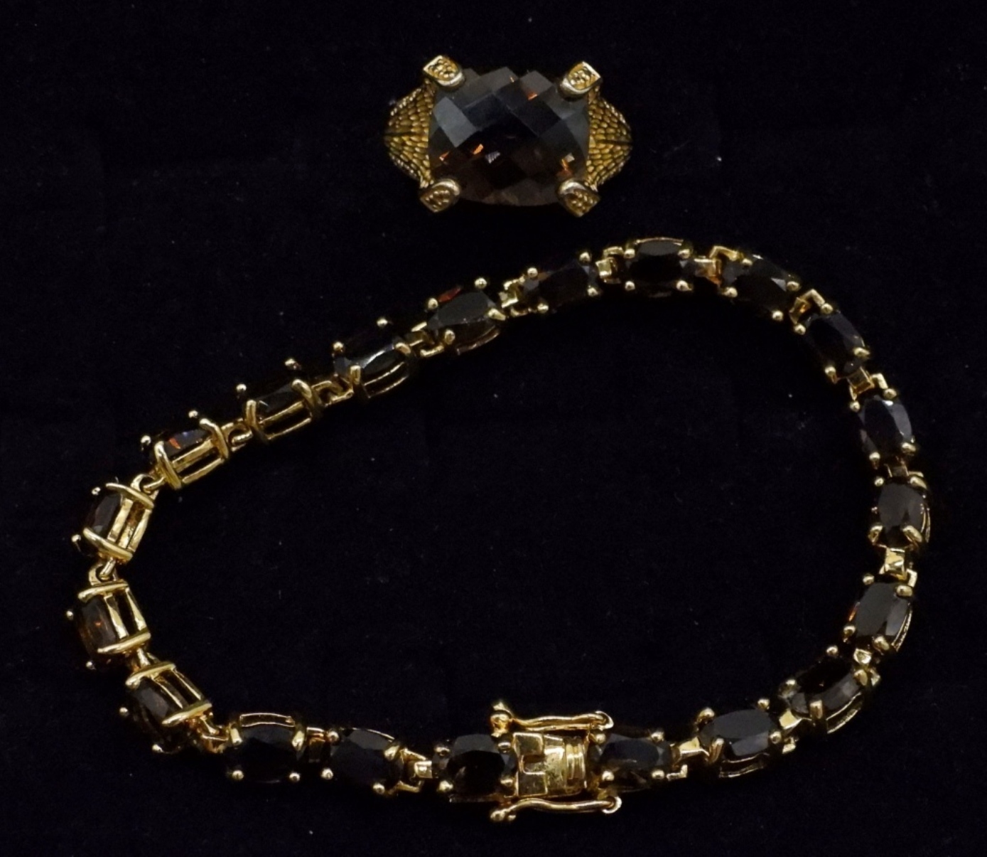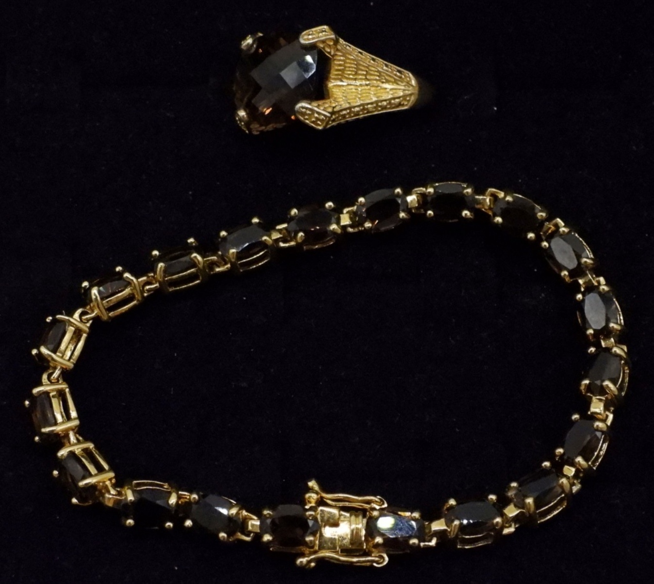 GOLD TONE, STERLING WITH SMOKEY QUARTZ GEMSTONES. BRACELET IS 7.5″ AND RING IS SIZE 9. (15 DWT)