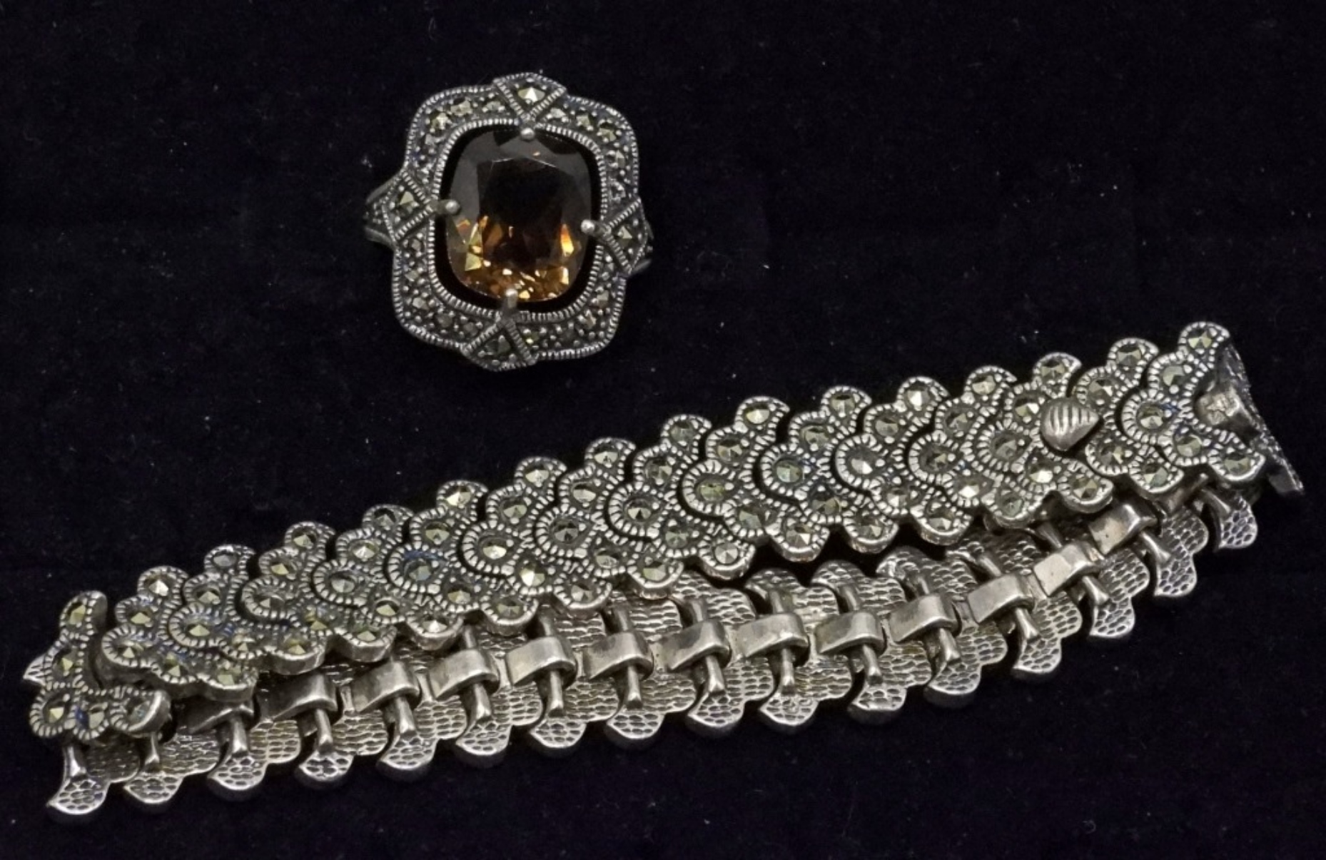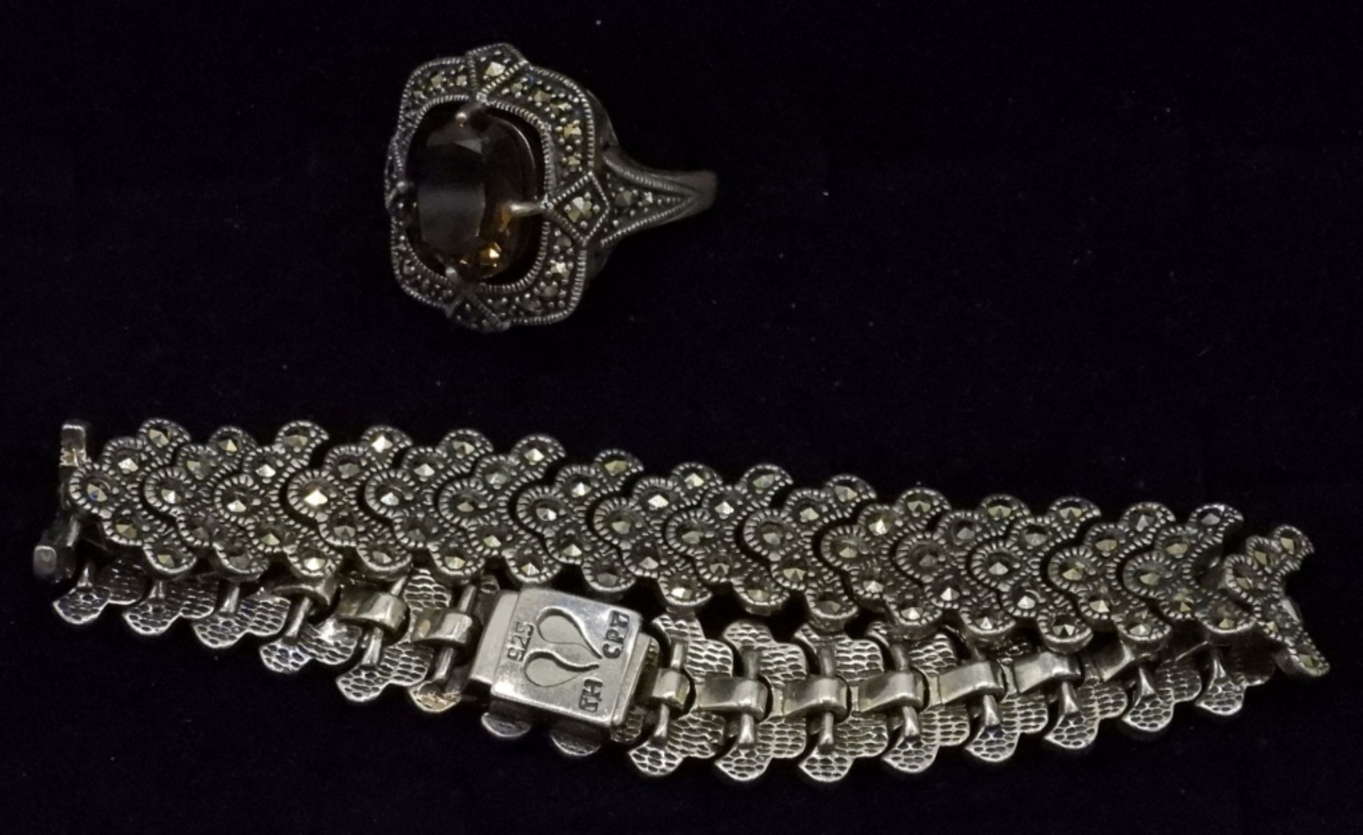 MARCASITE AND SMOKEY QUARTZ RING, SIZE 9. MARCASITE STERLING BRACELET, 7.5″ LONG. (30 DWT)