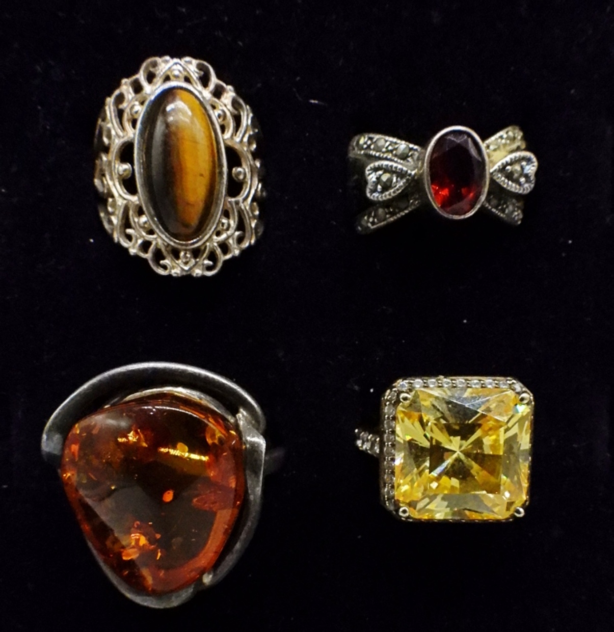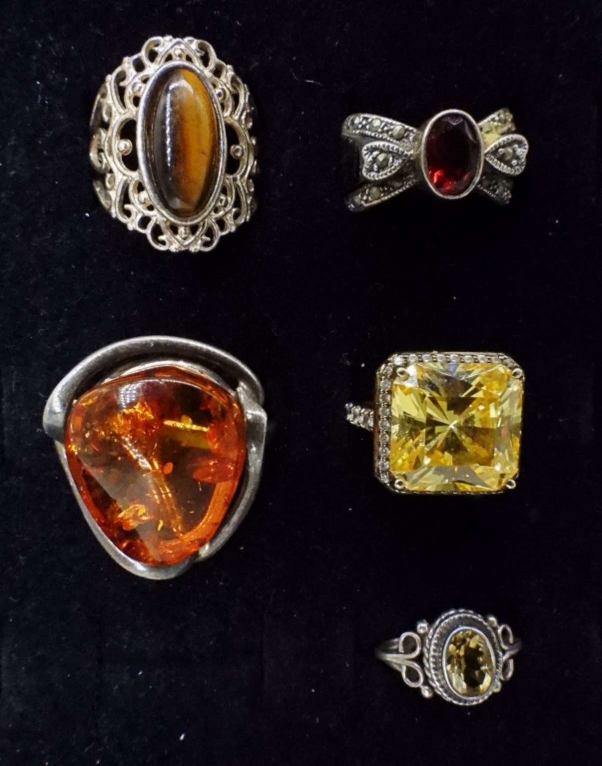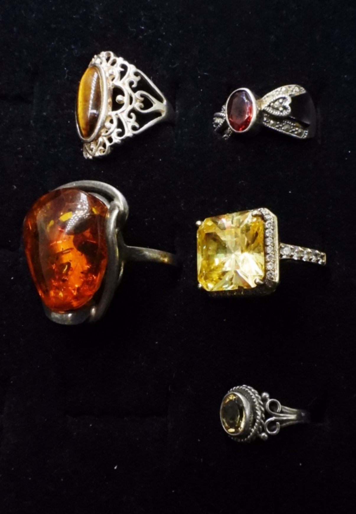 FIVE STERLING FASHION RINGS. AMBER, GARNET & BLACK ONYX, TIGERS EYE & CITRON GEMSTONES. SIZES 4-9 (19 DWT)