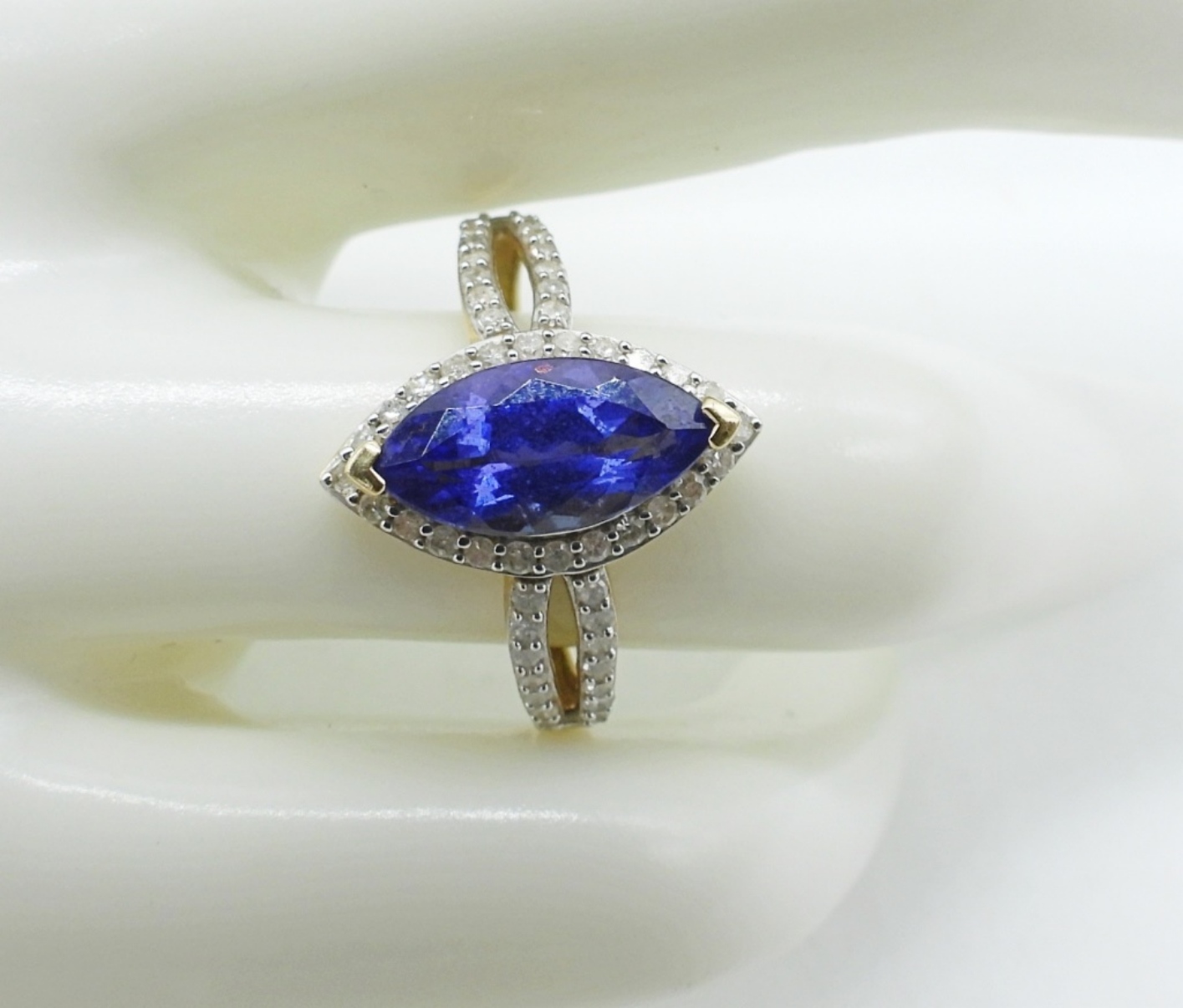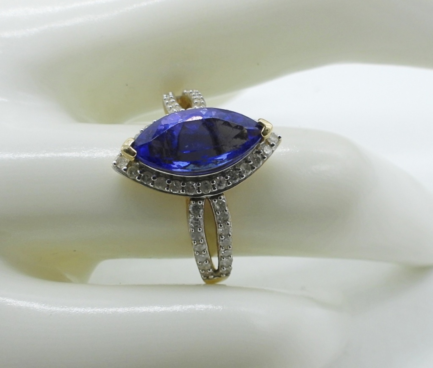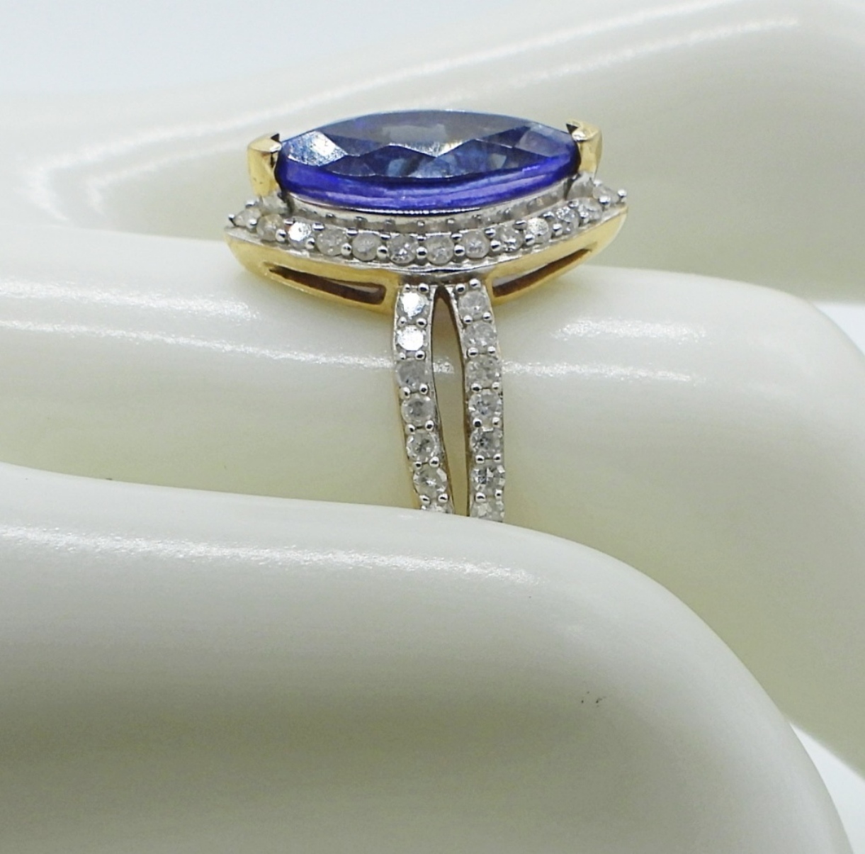 10K YELLOW GOLD RING, SIZE 7. LARGE TANZANITE CENTER STONE (NOT VERIFIED GENUINE TANZANITE OR SIMULATED). (1.9 DWT)