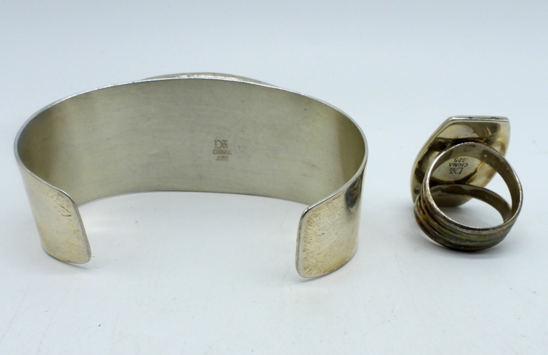 JAY KING “DTR CHINA 925” BROWN GEMSTONE CUFF BRACELET AND MATCHING RING (SIZE 10). (70 DWT)