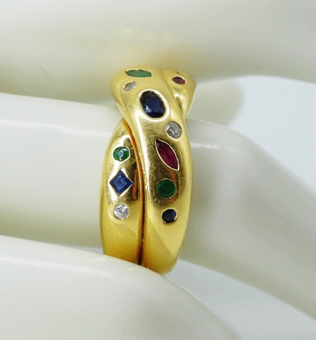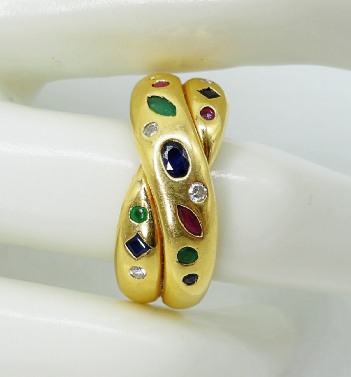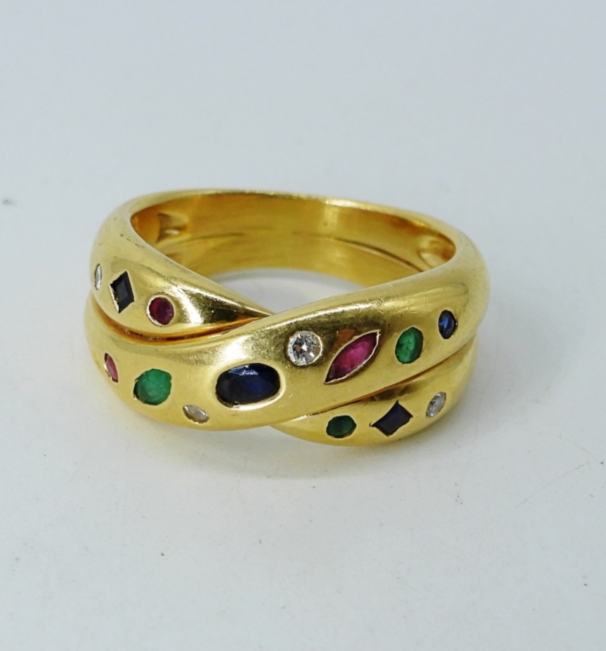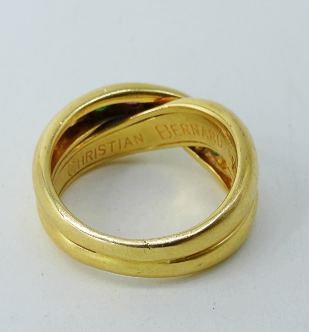 CHRISTIAN BERNARD No. 82 18K YELLOW GOLD RING WITH DIAMONDS, SAPPHIRES & RUBIES IN A CROSSOVER DESIGN, .05 CTW DIAMONDS. SIZE 7. GORGEOUS RING! (5.3 DWT)