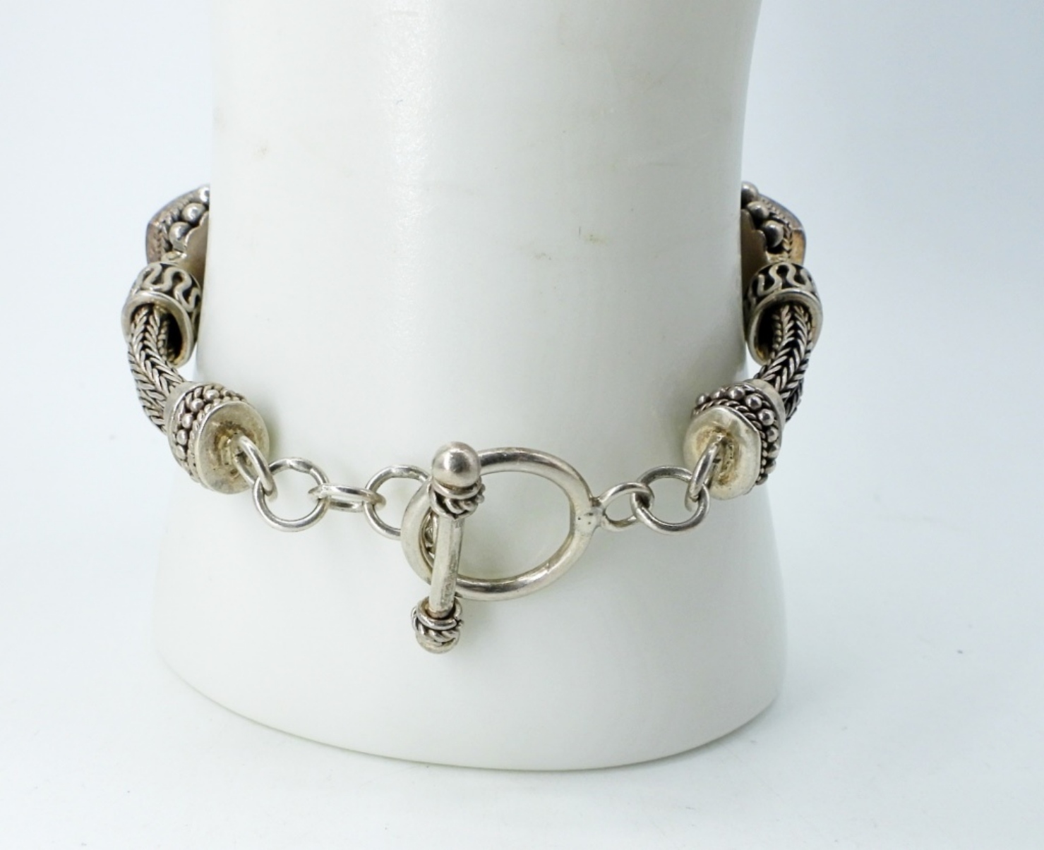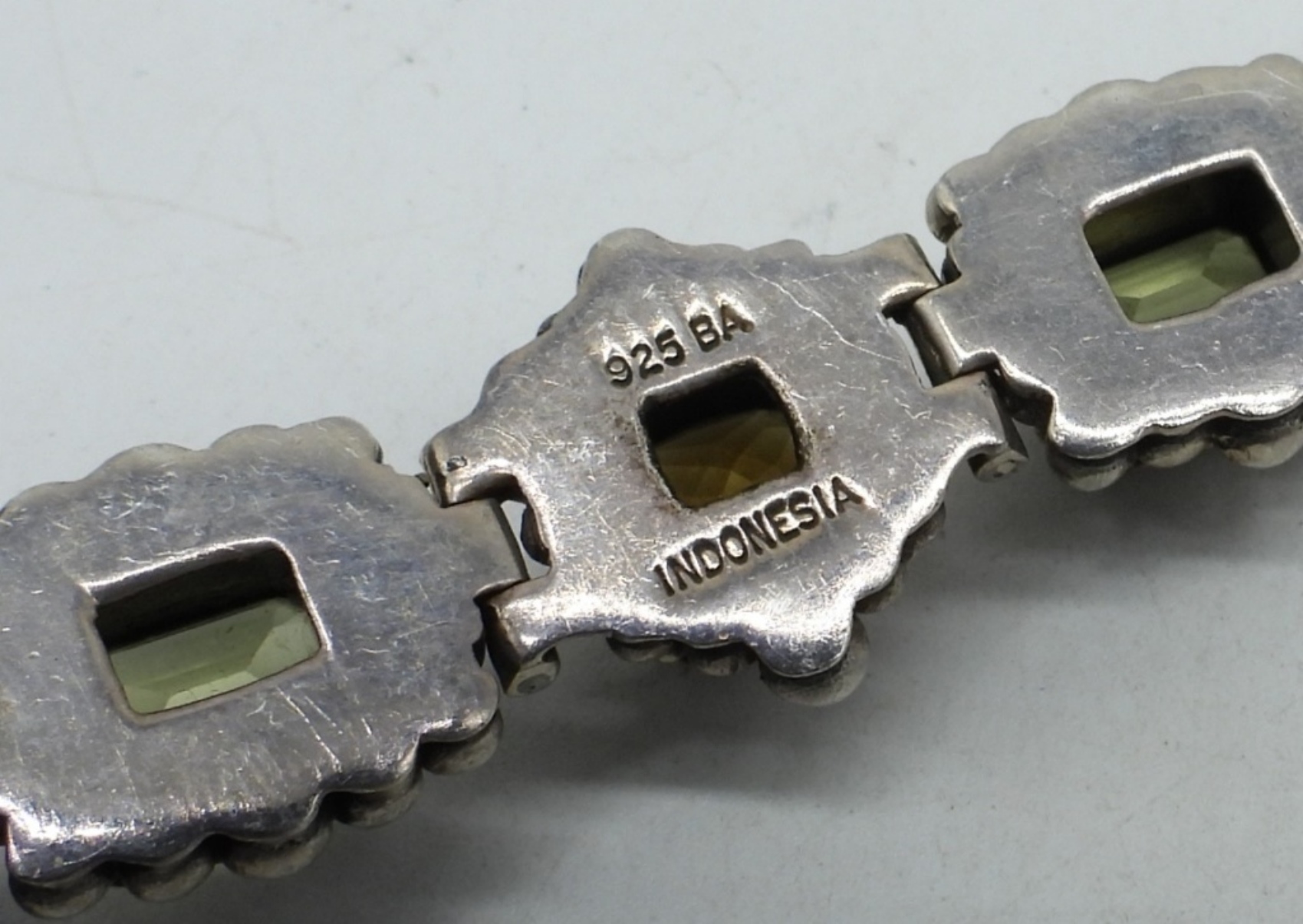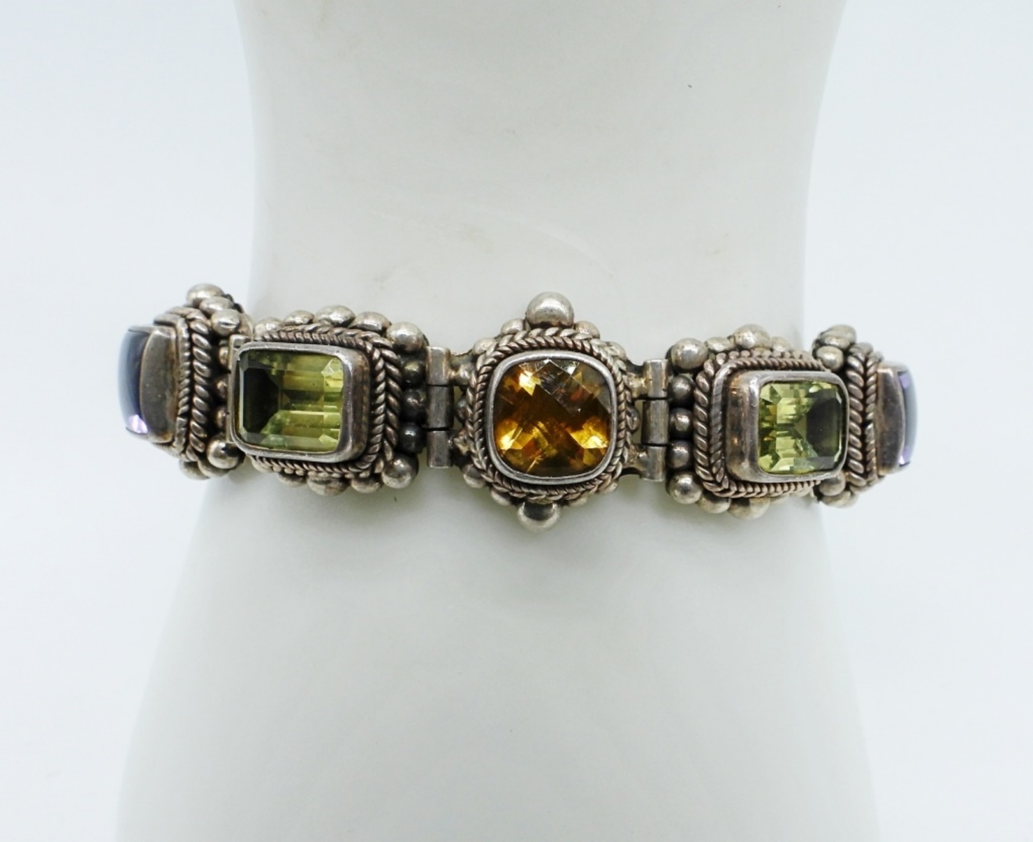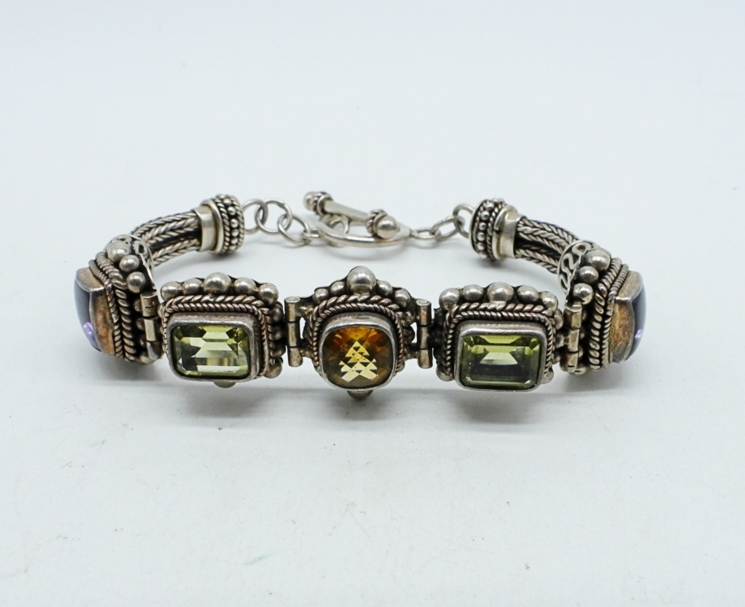 STERLING BRACELET, TOGGLE CLASP. AMETHYST, PERIDOT & CITRON GEMSTONES. 7.5″ LONG. (25 DWT)