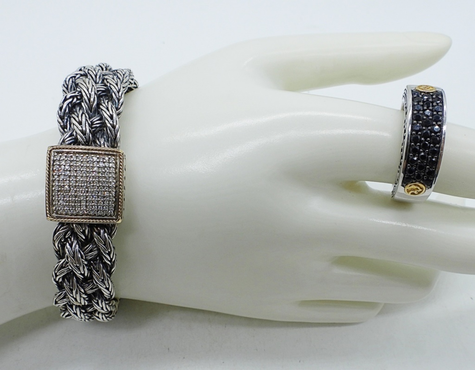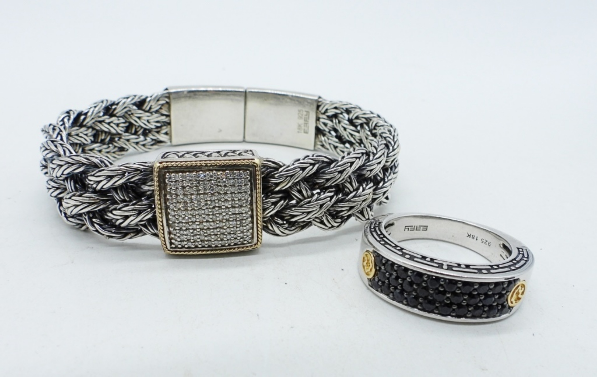 EFFY, STERLING AND 18KG DIAMOND / SIMULATED BLACK DIAMOND BRACELET AND RING. BRACELET IS 7.5″, RING IS SIZE 10. (40 DWT)