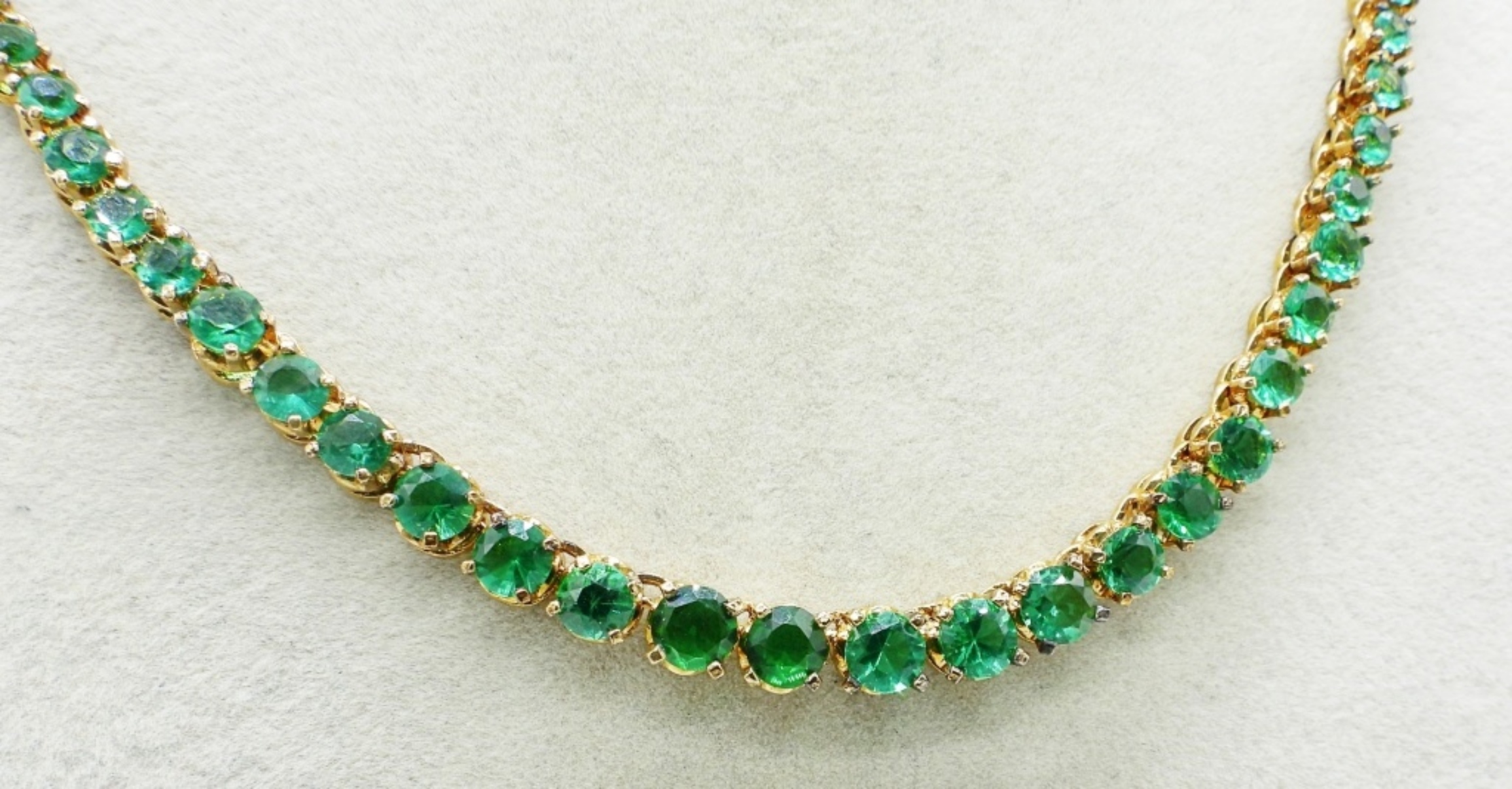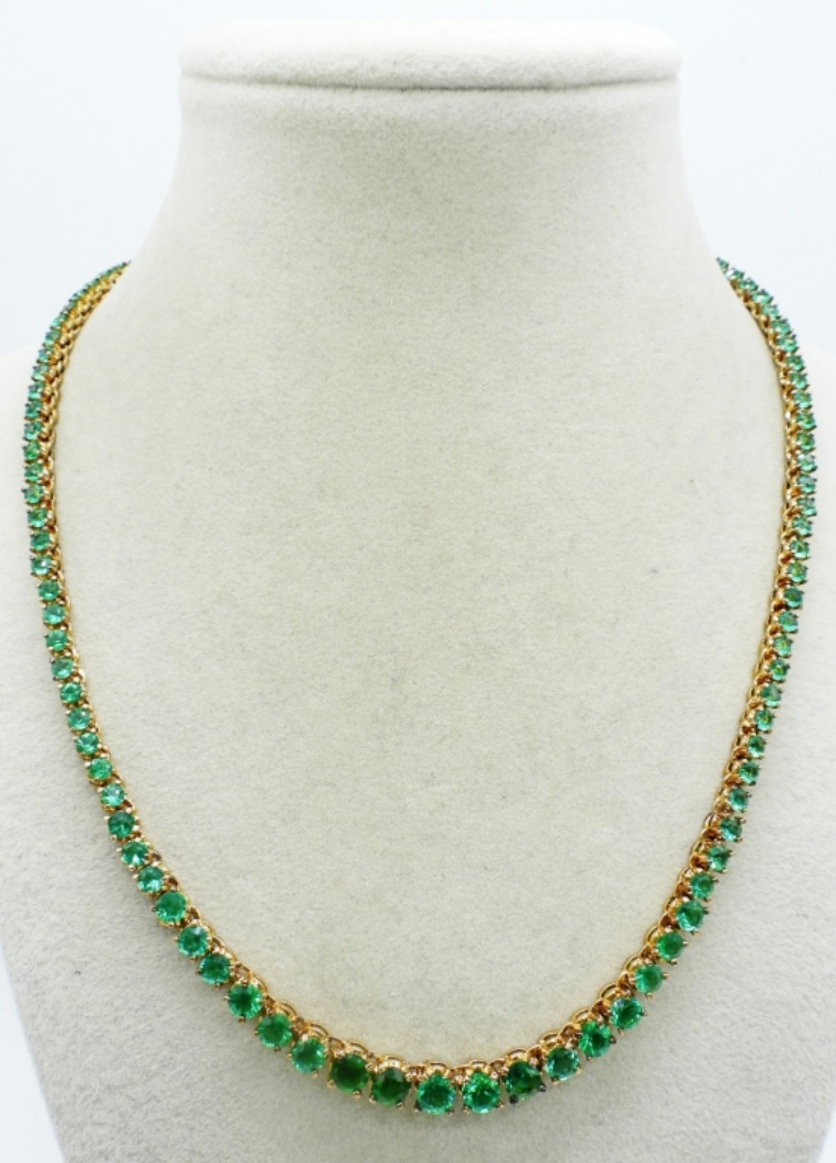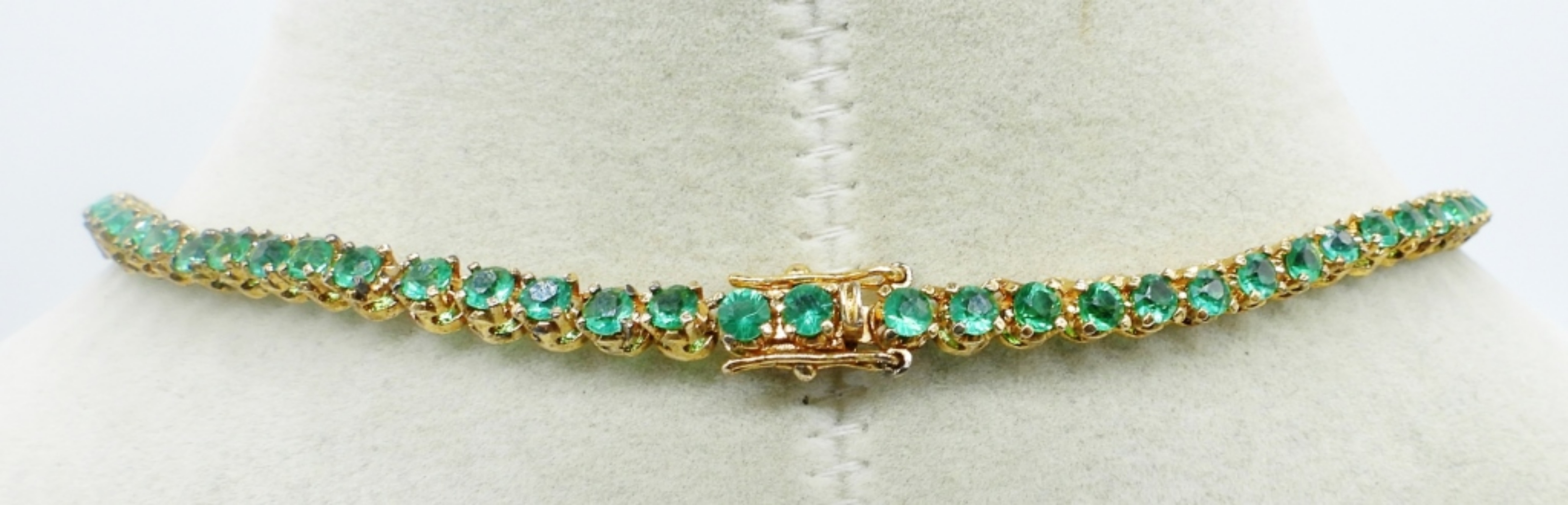 EDCO STERLING EMERALD CZ GRADUATED TENNIS NECKLACE, 18″. GOLD TONE. CLASP WORKS GREAT. (18.4 DWT)