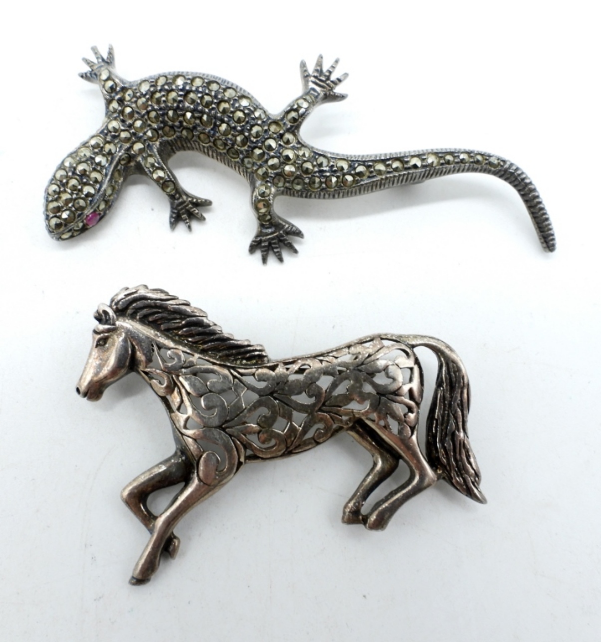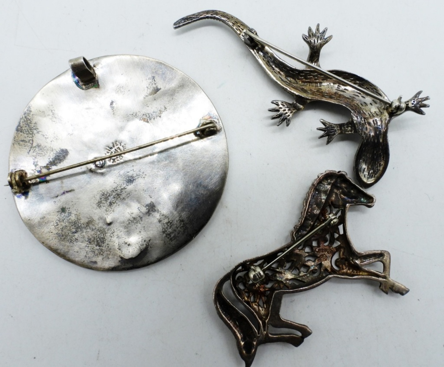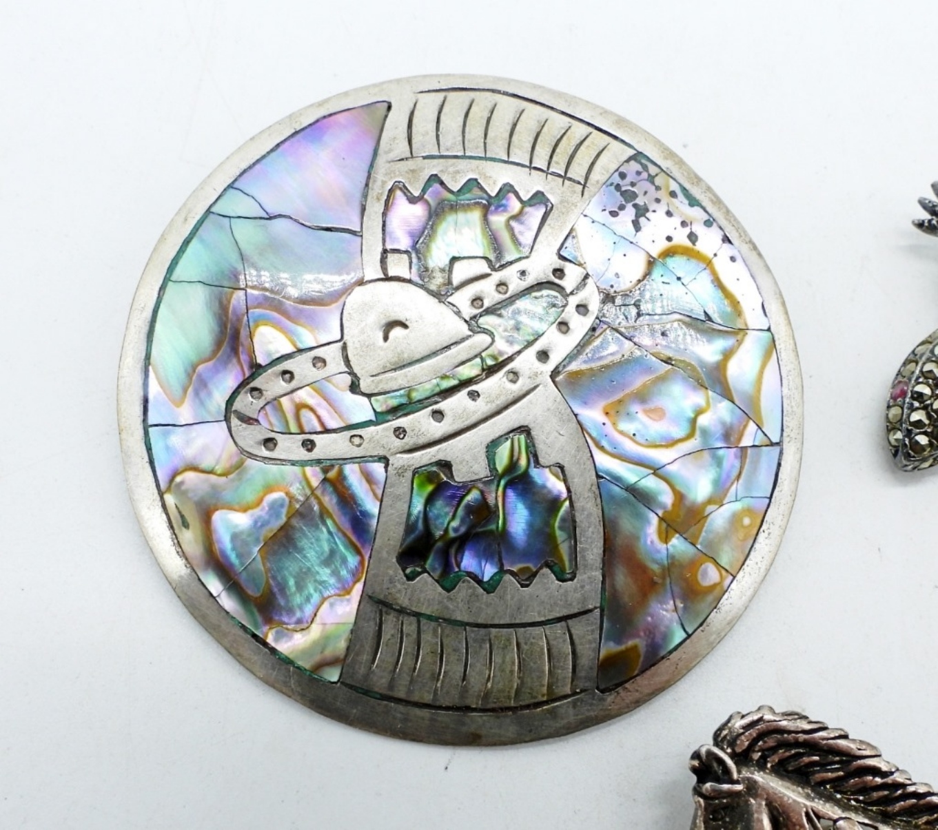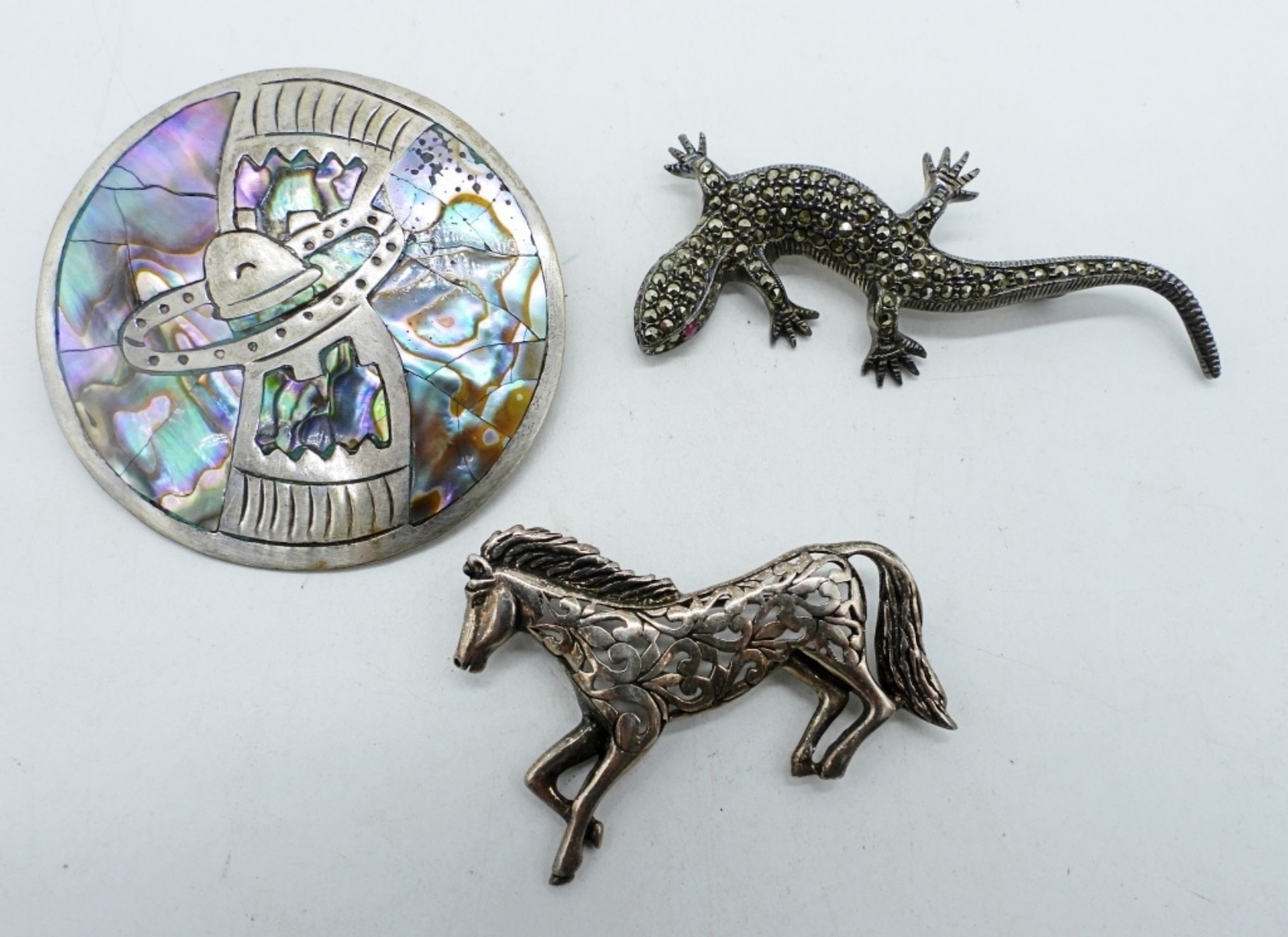 ROUND STERLING ABALONE BROOCH, TAXCO (HARD TO READ STAMP) 2 1/4″. MARCASITE GECKO PIN & HORSE PIN, 2-3″. (24.5 DWT)