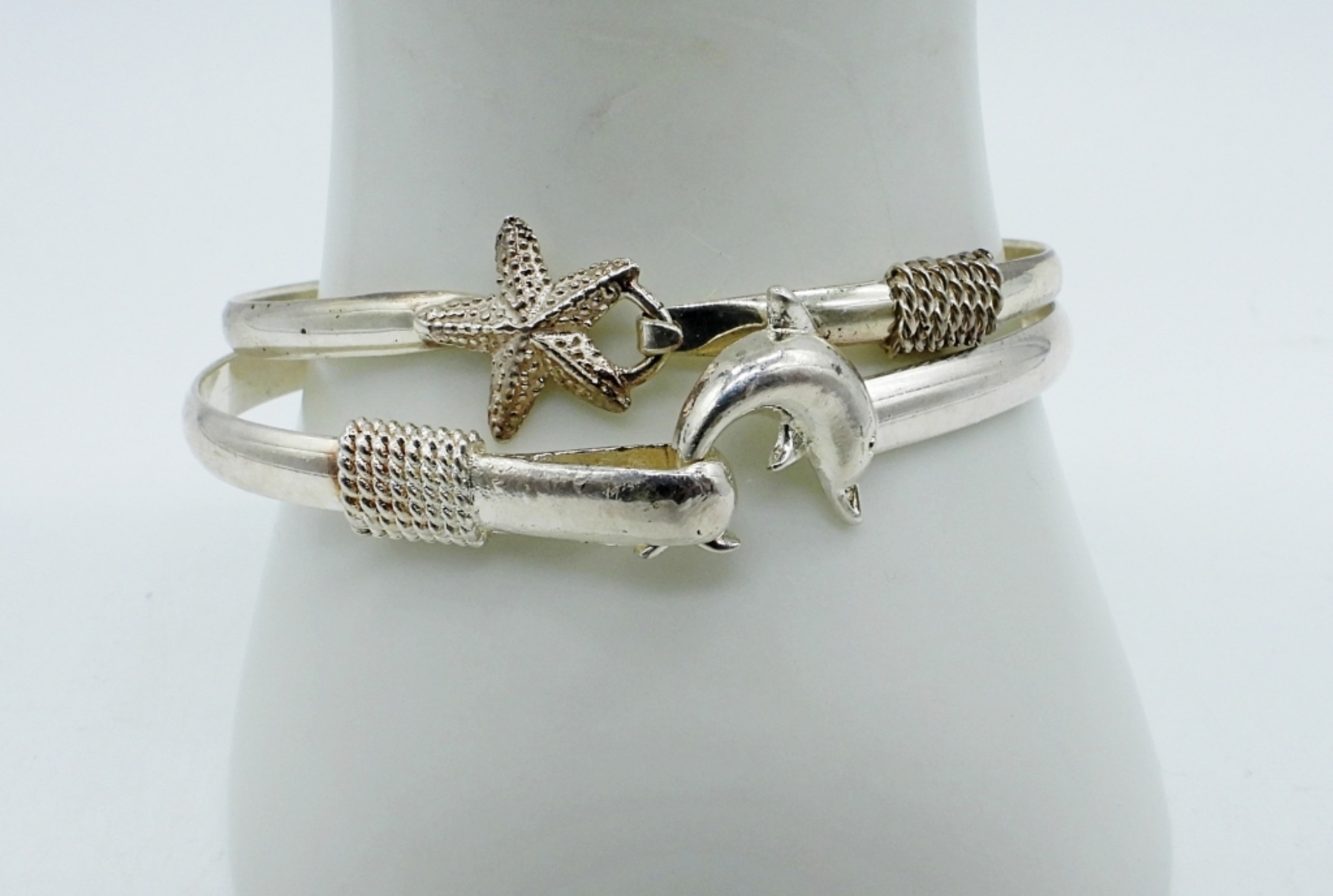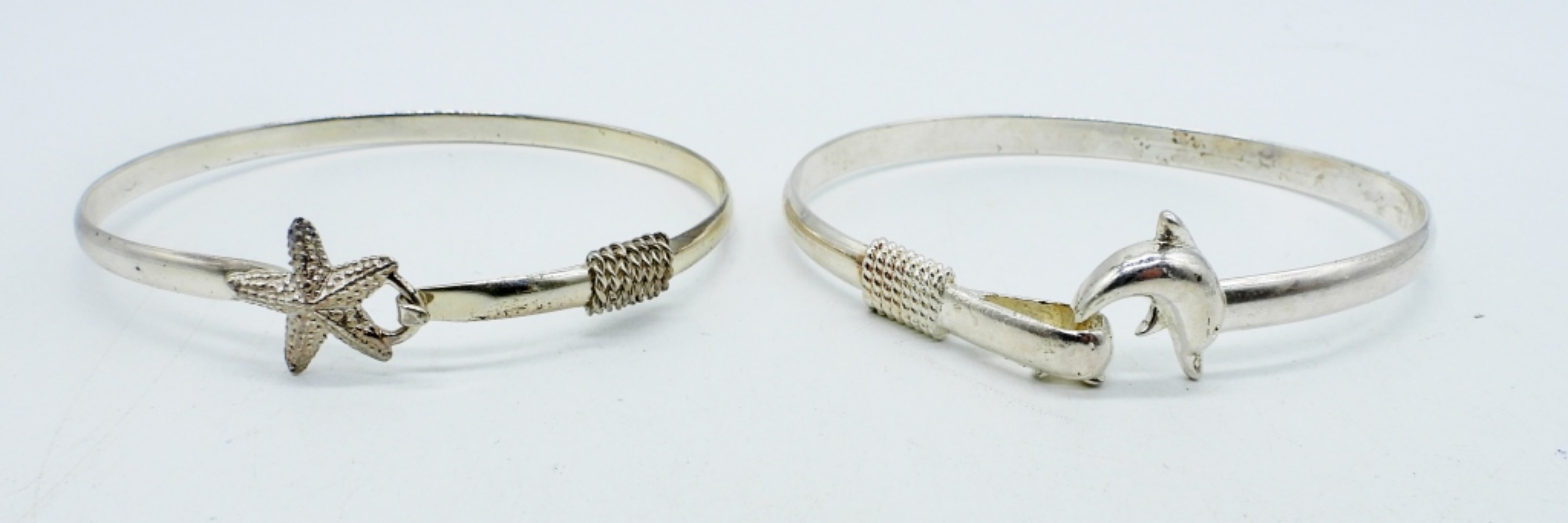 TWO STERLING BANGLE BRACELETS, DOLPHIN AND STARFISH. (13.6 DWT)