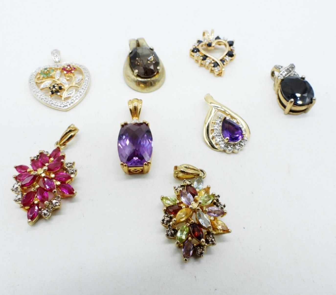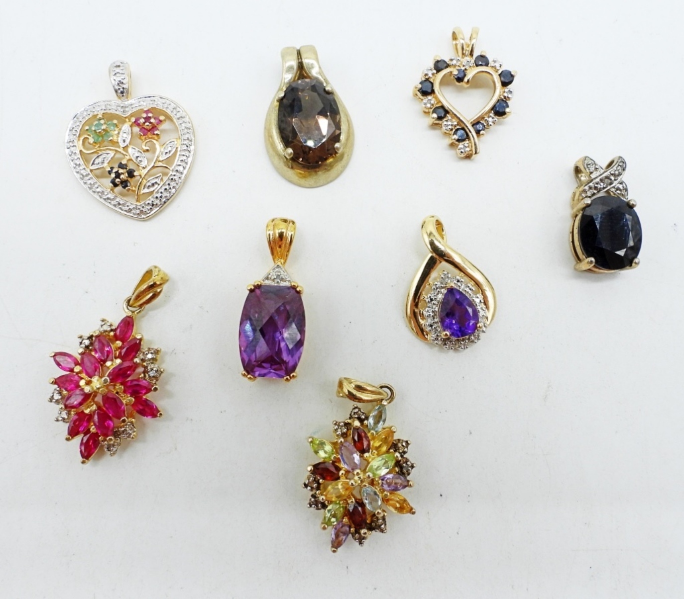 EIGHT STERLING, GOLD TONE PENDANTS WITH GEMSTONES. AMETHYST, RUBY, SAPPHIRE, EMERALD, CITRINE, SMOKEY QUARTZ. (18 DWT)