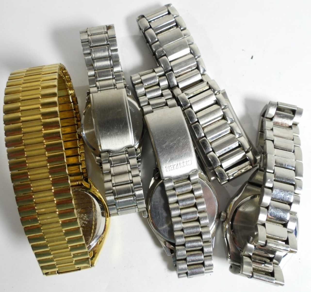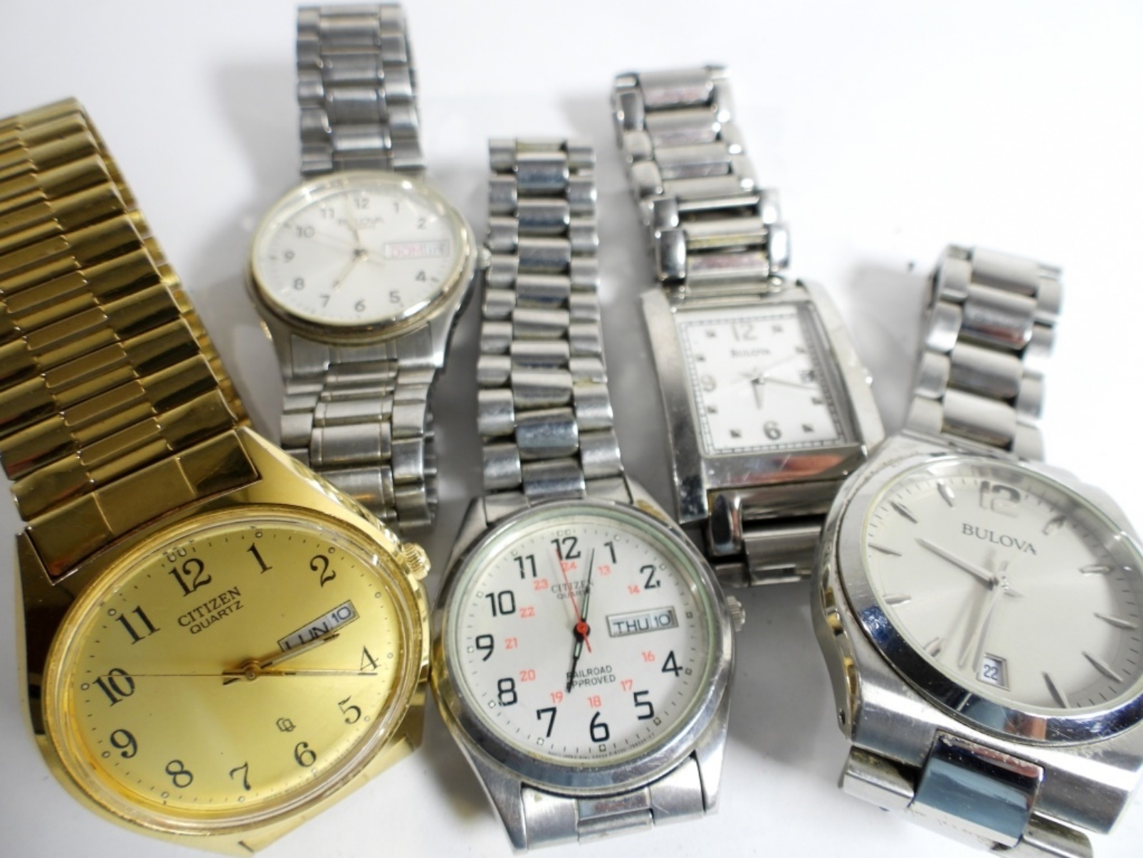 WATCHES ARE NOT VERIFIED, AUTHENTICATED, OR TESTED, IN RUNNING CONDITION, UNLESS SPECIFIED, INCLUDING 1 SILVER CITIZEN, 1 GOLD CITIZEN, 3 SILVER BULOVA