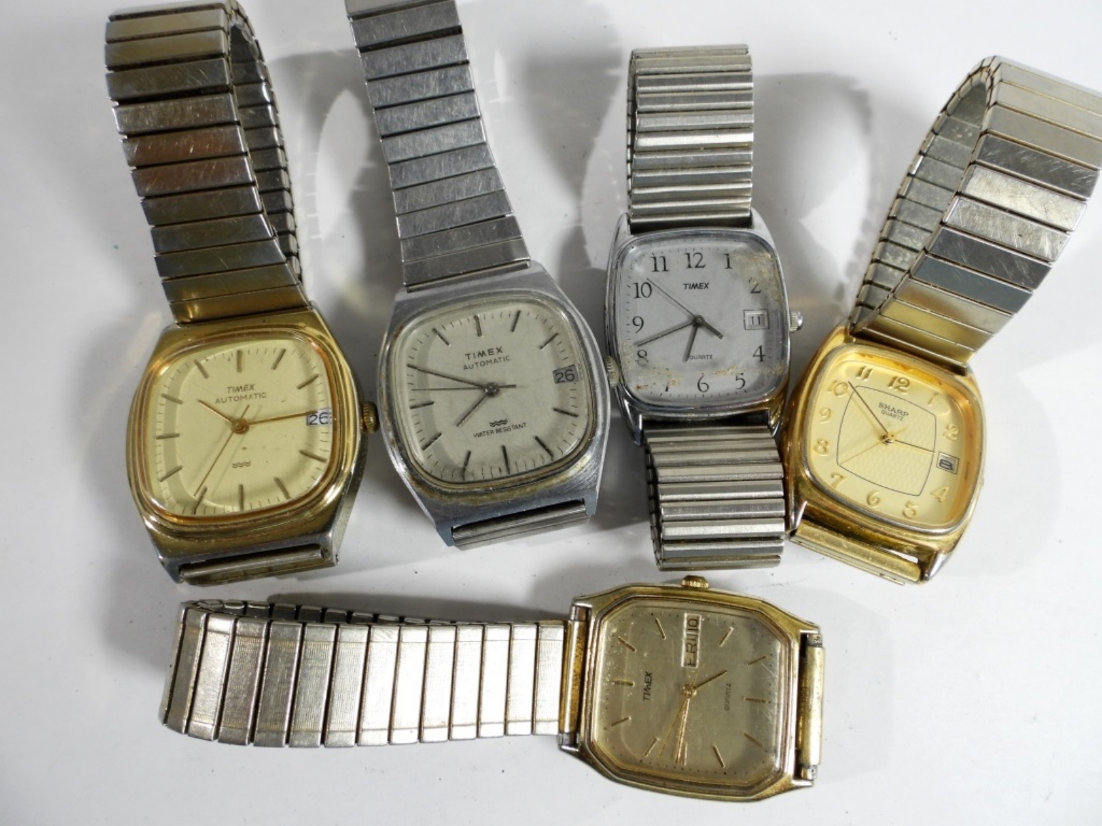 WATCHES ARE NOT VERIFIED, AUTHENTICATED, OR TESTED, IN RUNNING CONDITION, UNLESS SPECIFIED, INCLUDING 1 SHARP GOLD TONE, 2GOLD TONE TIMEX, & 2 SILVER TIMEX