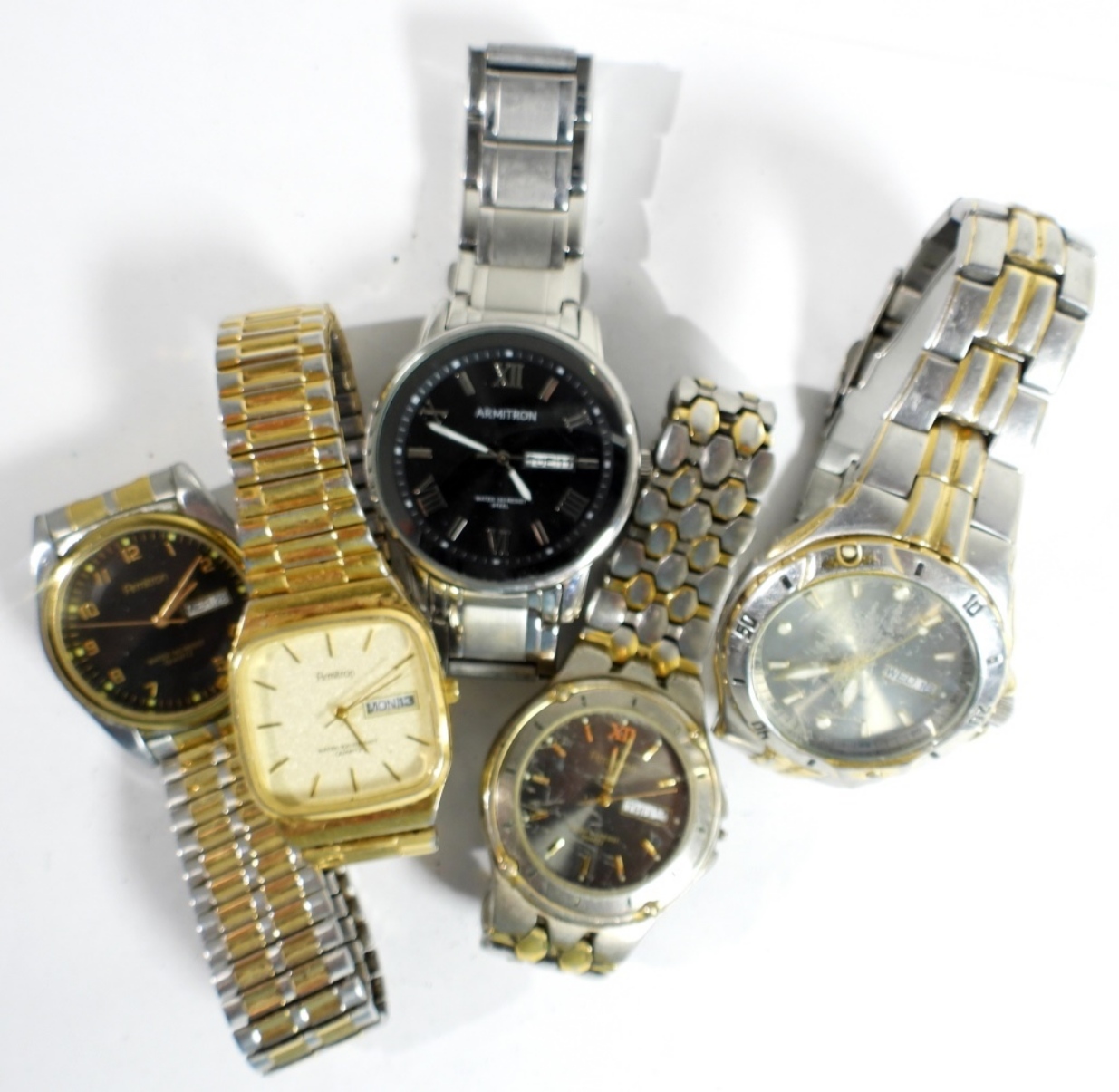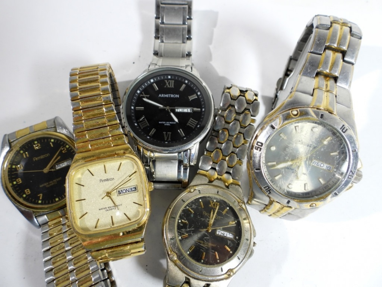 WATCHES ARE NOT VERIFIED, AUTHENTICATED, OR TESTED, IN RUNNING CONDITION, UNLESS SPECIFIED, INCLUDING 5 MENS ARMITRON DAY/DATE WATCHES
