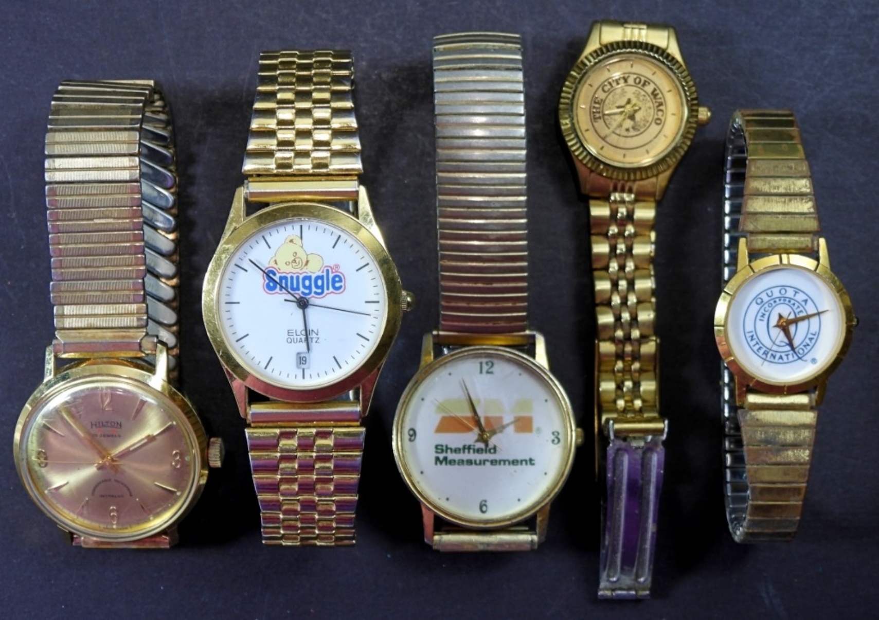 5 assorted gold band watches from various companies, untestest as to working or not, most will need battery replacements, some for parts or repair, some may not work, various sizes