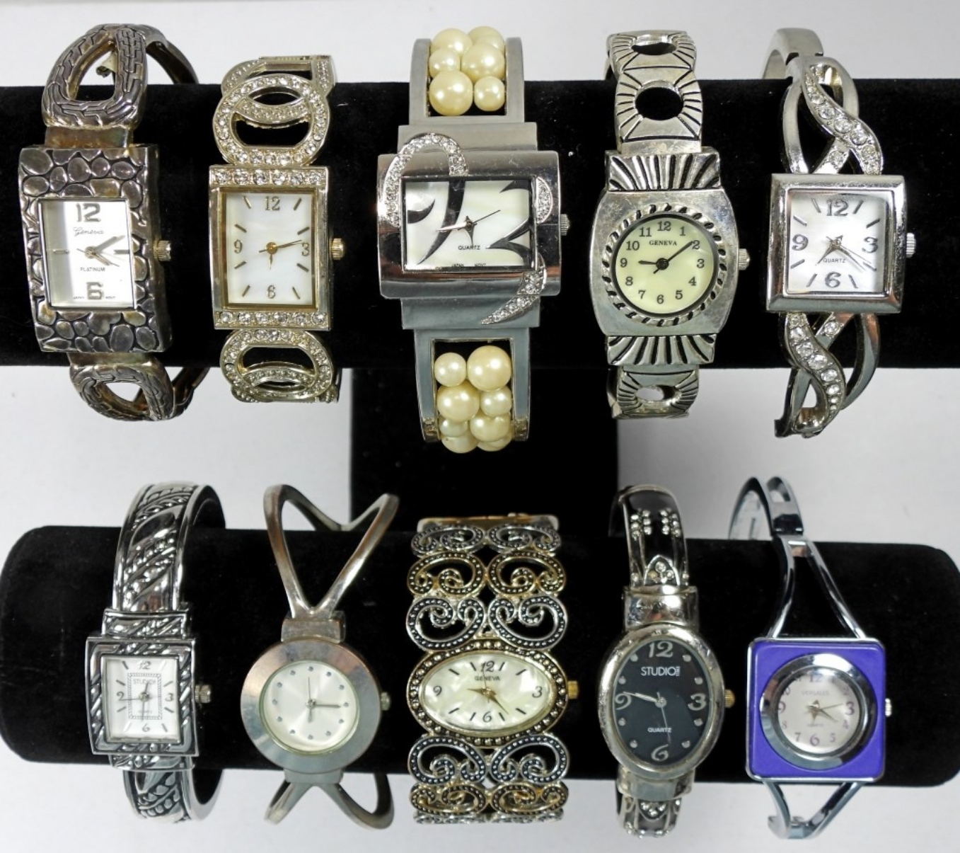 10 various ladies watches from different brands with cuff bands, not tested as to working or not – most will need battery replacements – some for parts or repairs – some may work