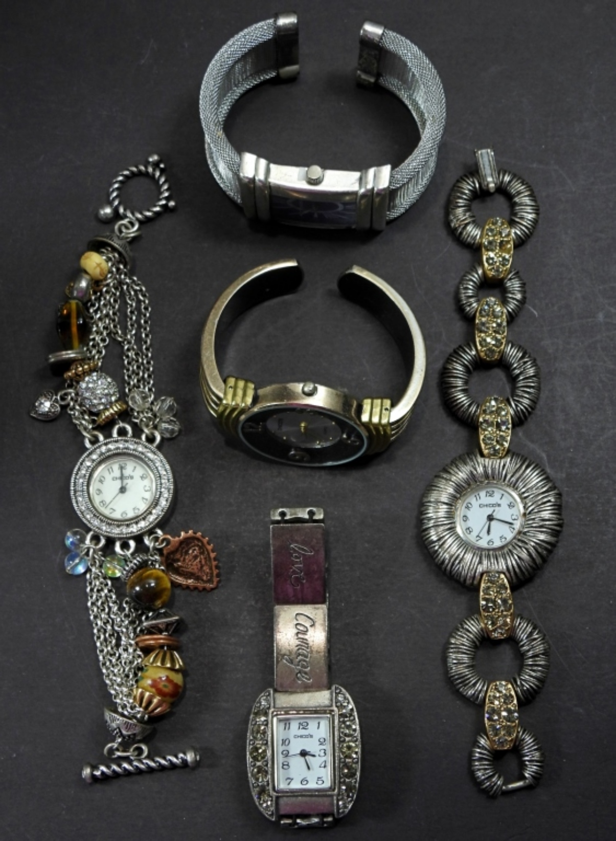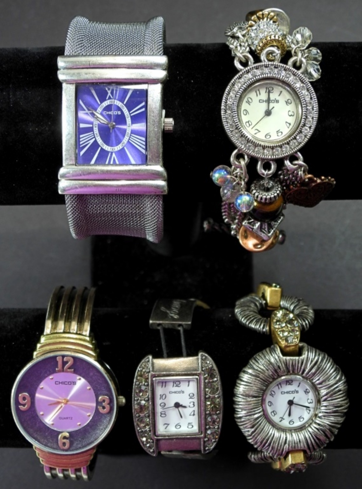 5 “CHICOS” BRAND WRIST WATCHES, ALL DECORATIVE COLORS AND STYLES, UNTESTED, WATCH MAY OR MAY NOT WORK, COULD BE USED FOR PARTS OR REPAIR