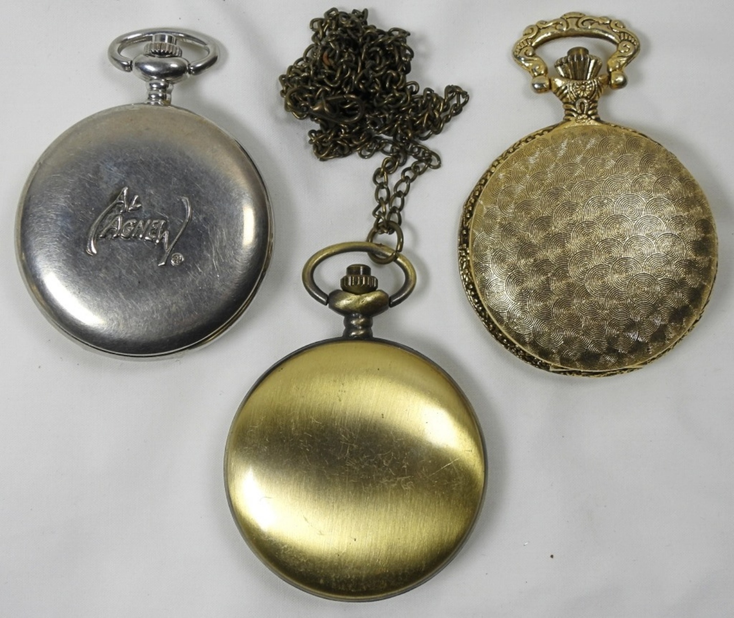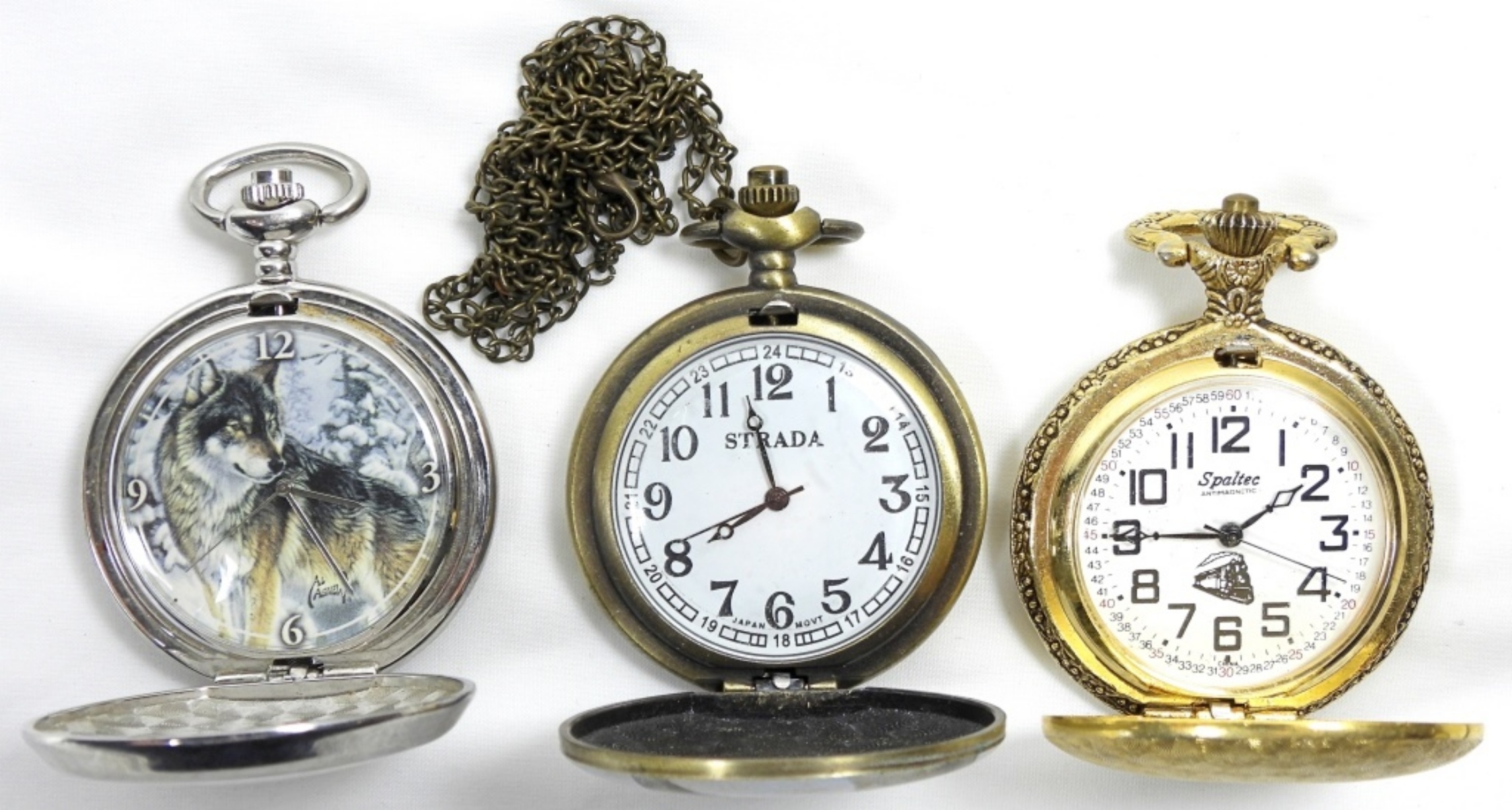 3 VARIETY QUARTZ POCKET WATCHES, BRANDS (AL AGNEW, STRADA, SPALTEC), UNTESTED/NEEDS SERVICE