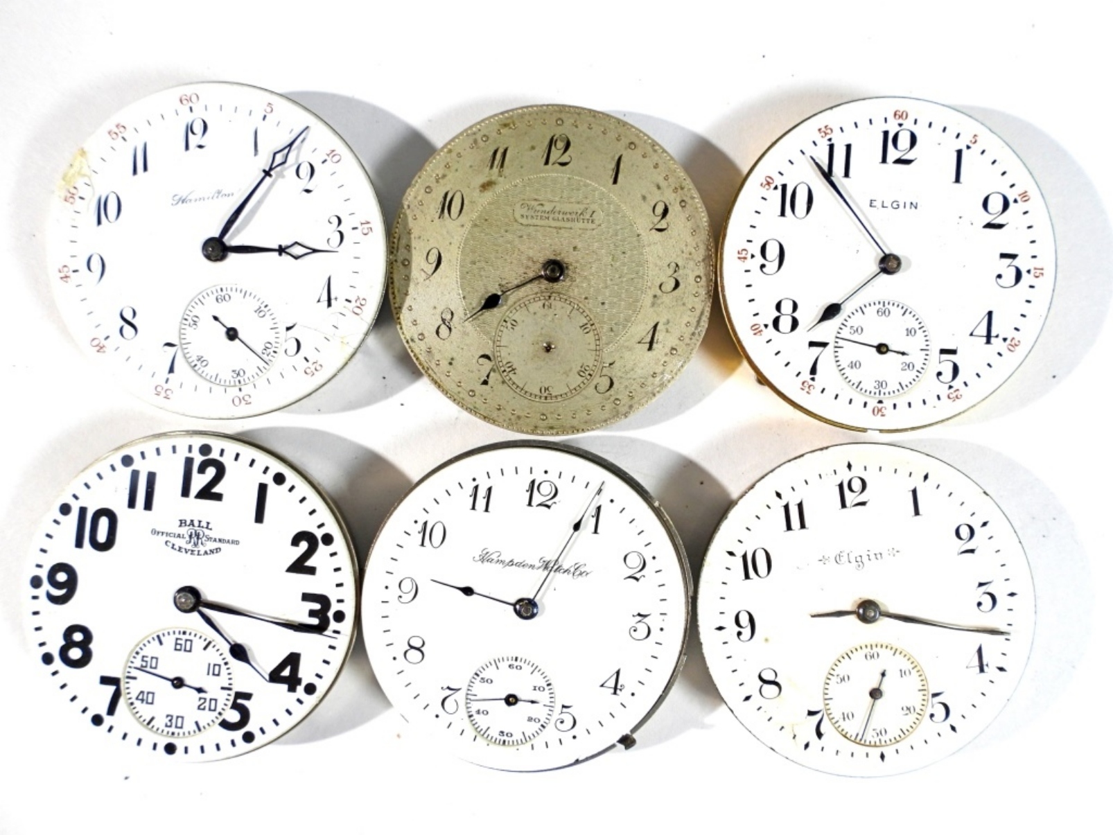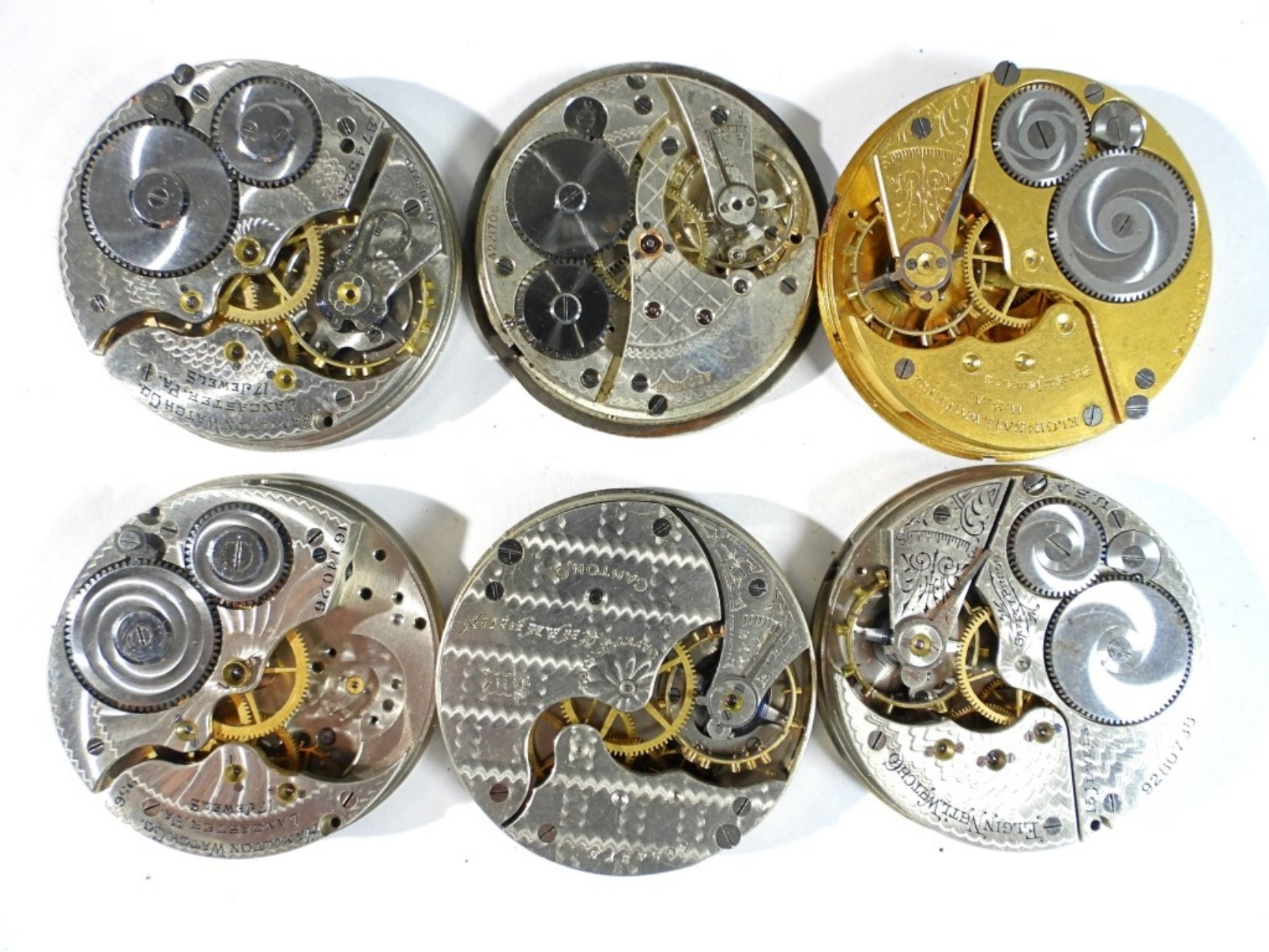 (6) SIZE 16’S WATCHE MOVEMENTS FOR PARTS ELGIN, HAMILTON AND MORE
