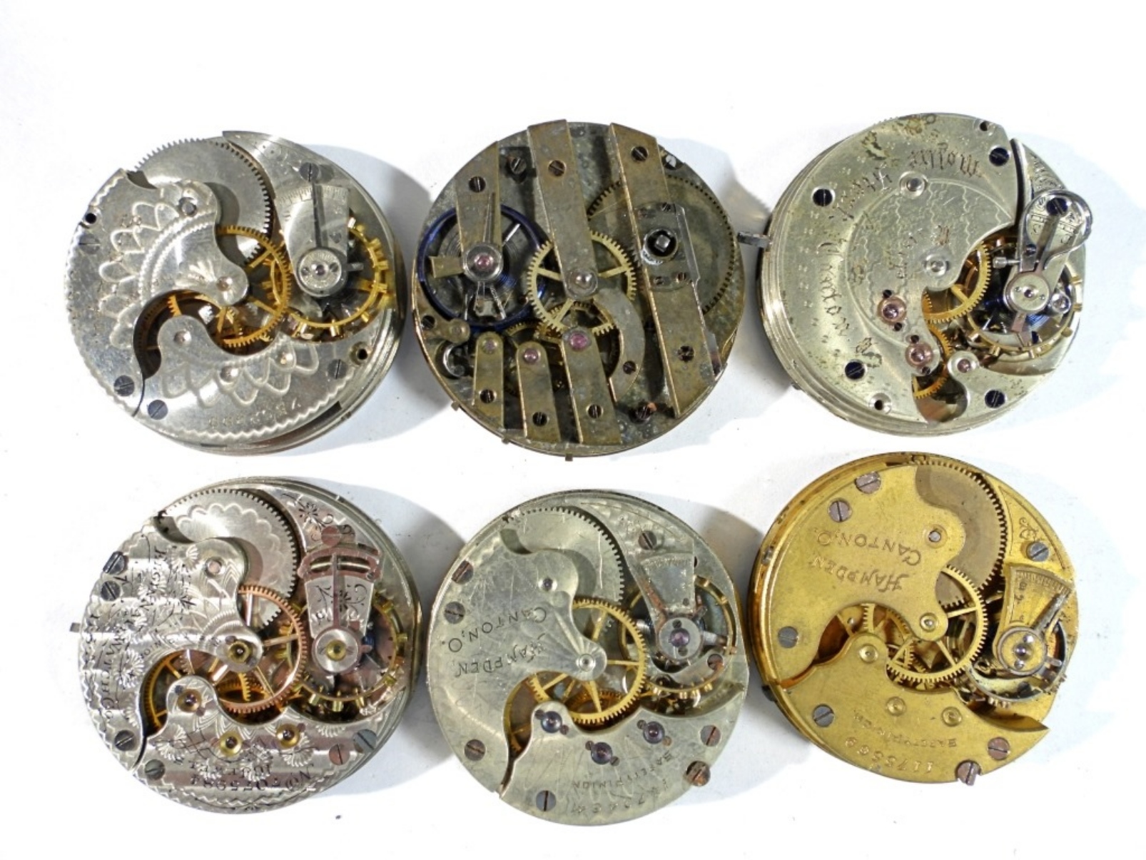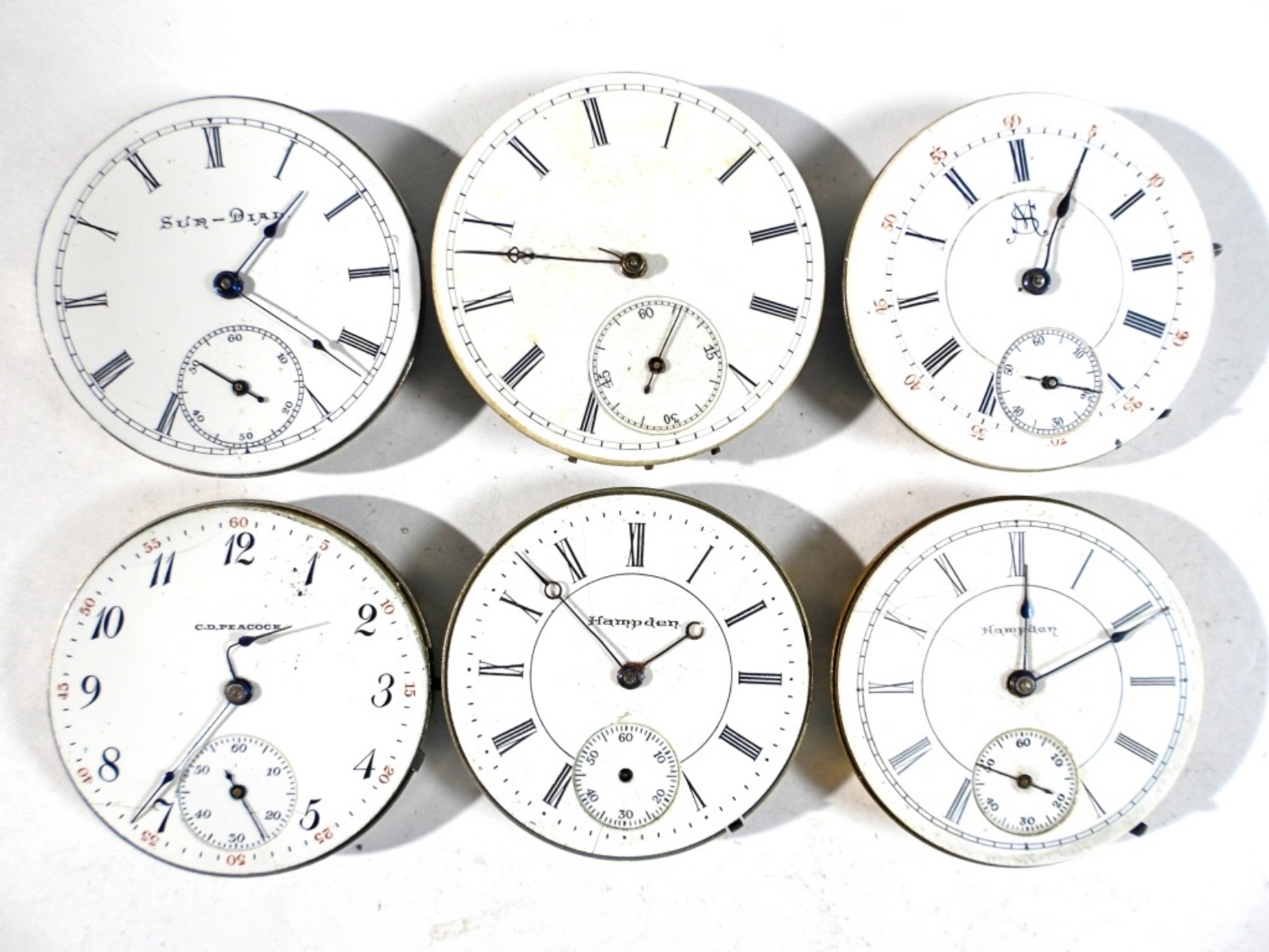(6) SIZE 6’S WATCH MOVMENTS FOR PARTS CD PEACOCK, SUN-DIAL, HAMPDEN AND MORE