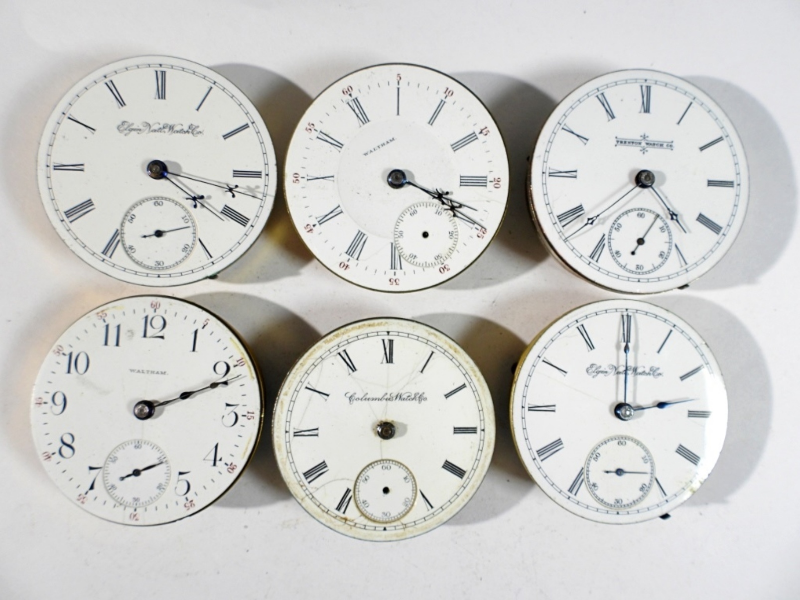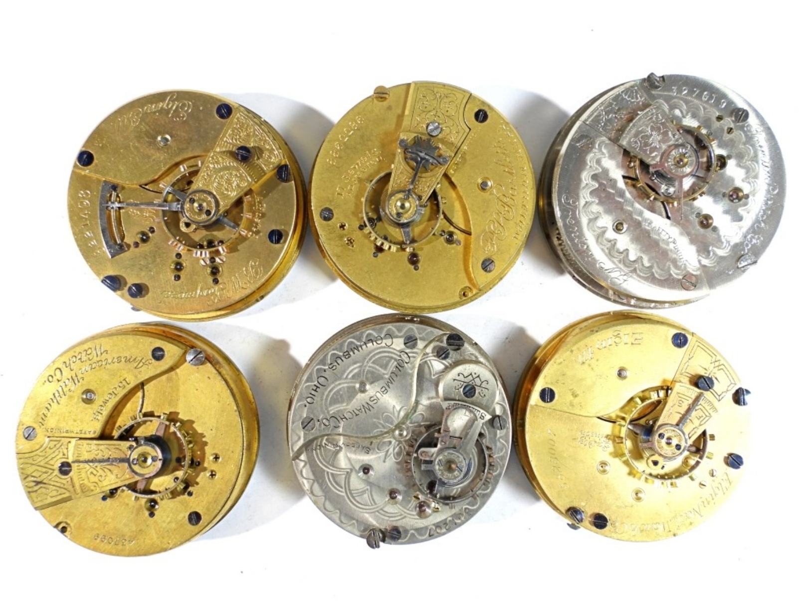 (6) SIZE 18’S WATCH MOVMENTS FOR PARTS COLUMBUS, TROUNTON, AND MORE
